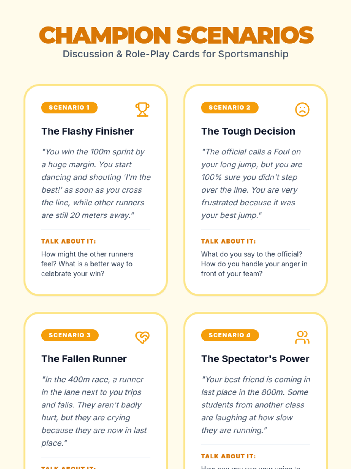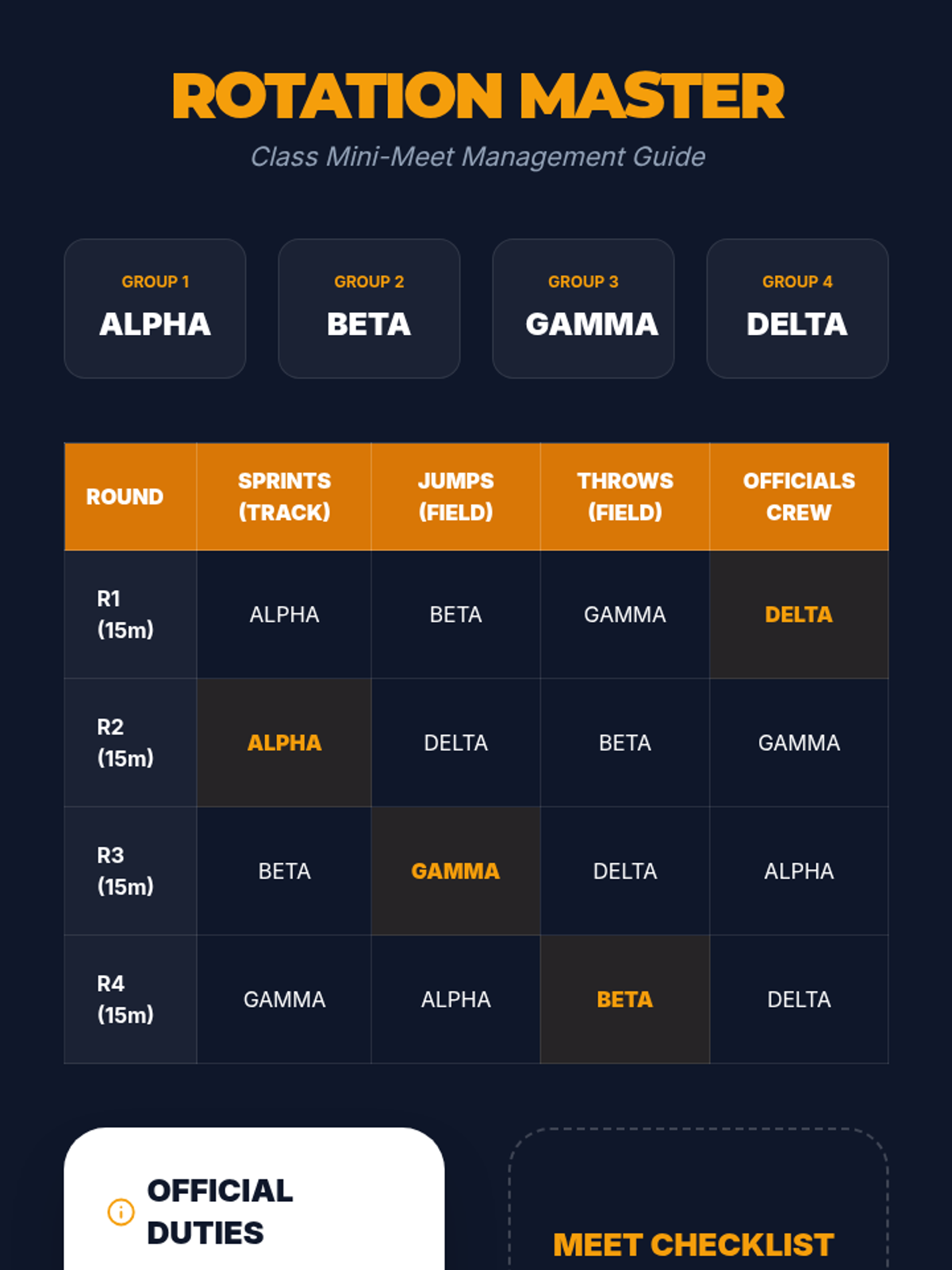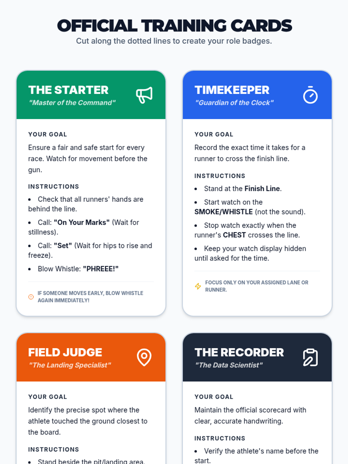 This sequence shifts focus from pure mechanics to the organizational structure, rules, and etiquette of a track meet. Students take on roles as both athletes and officials, learning how events are measured, judged, and scored. The unit emphasizes fair play, understanding disqualifications, and accurate measurement, culminating in a class-organized mini-meet.