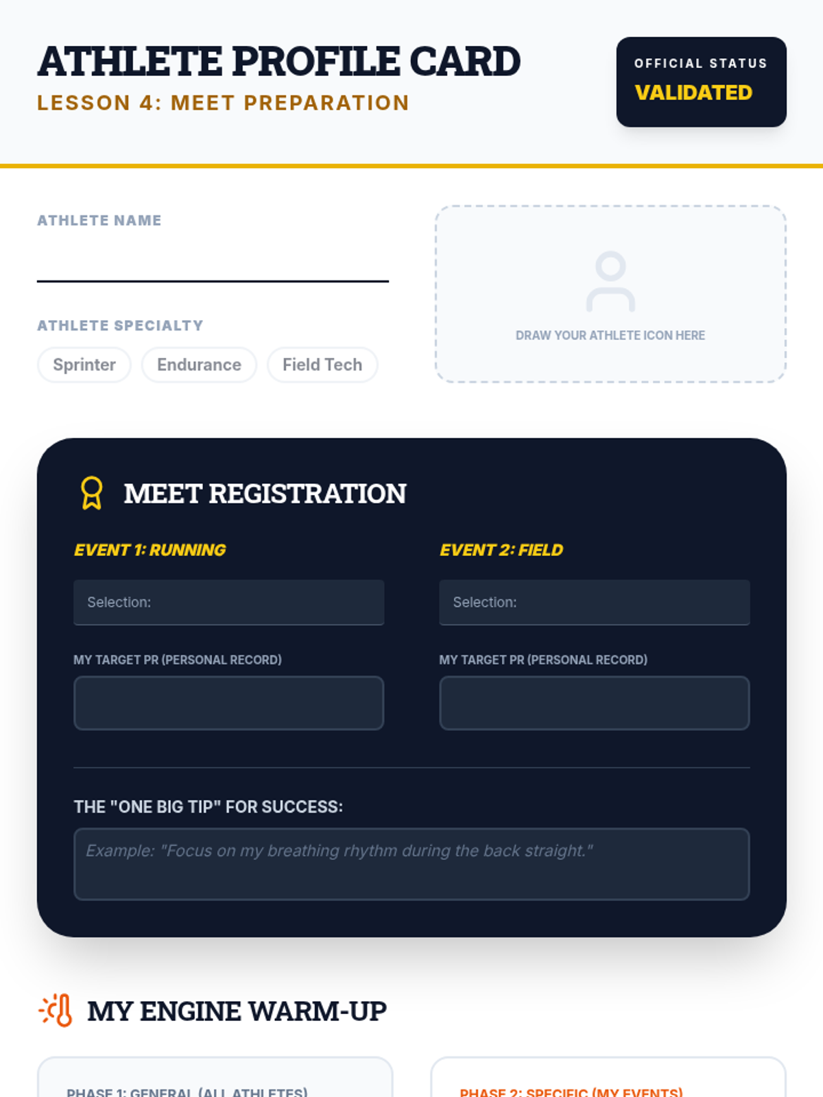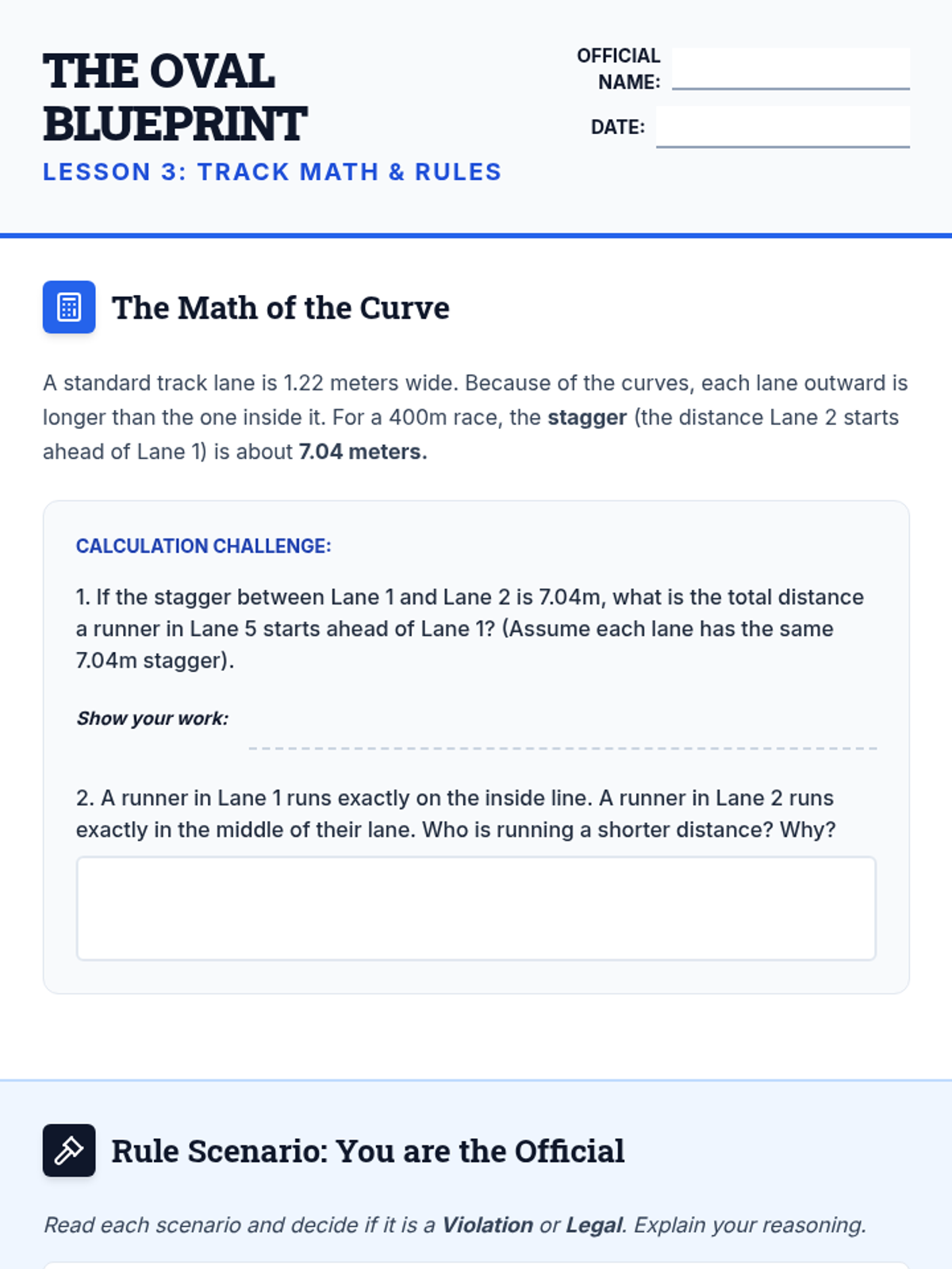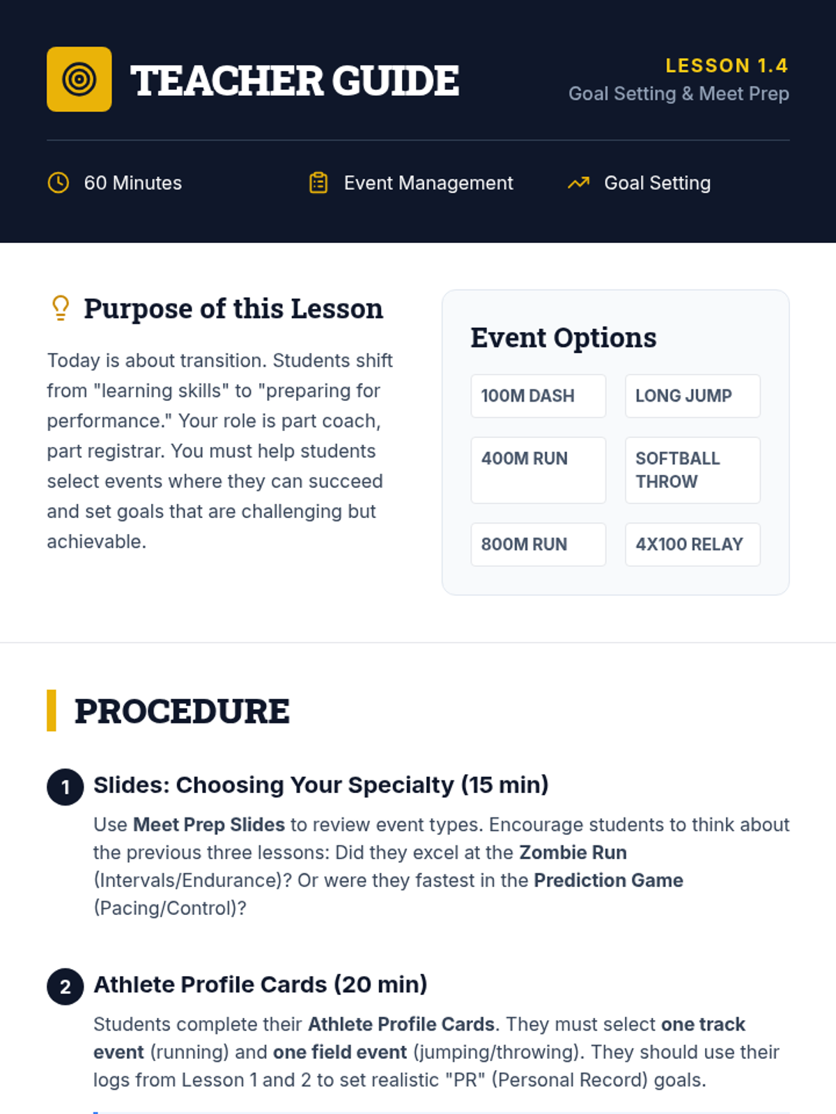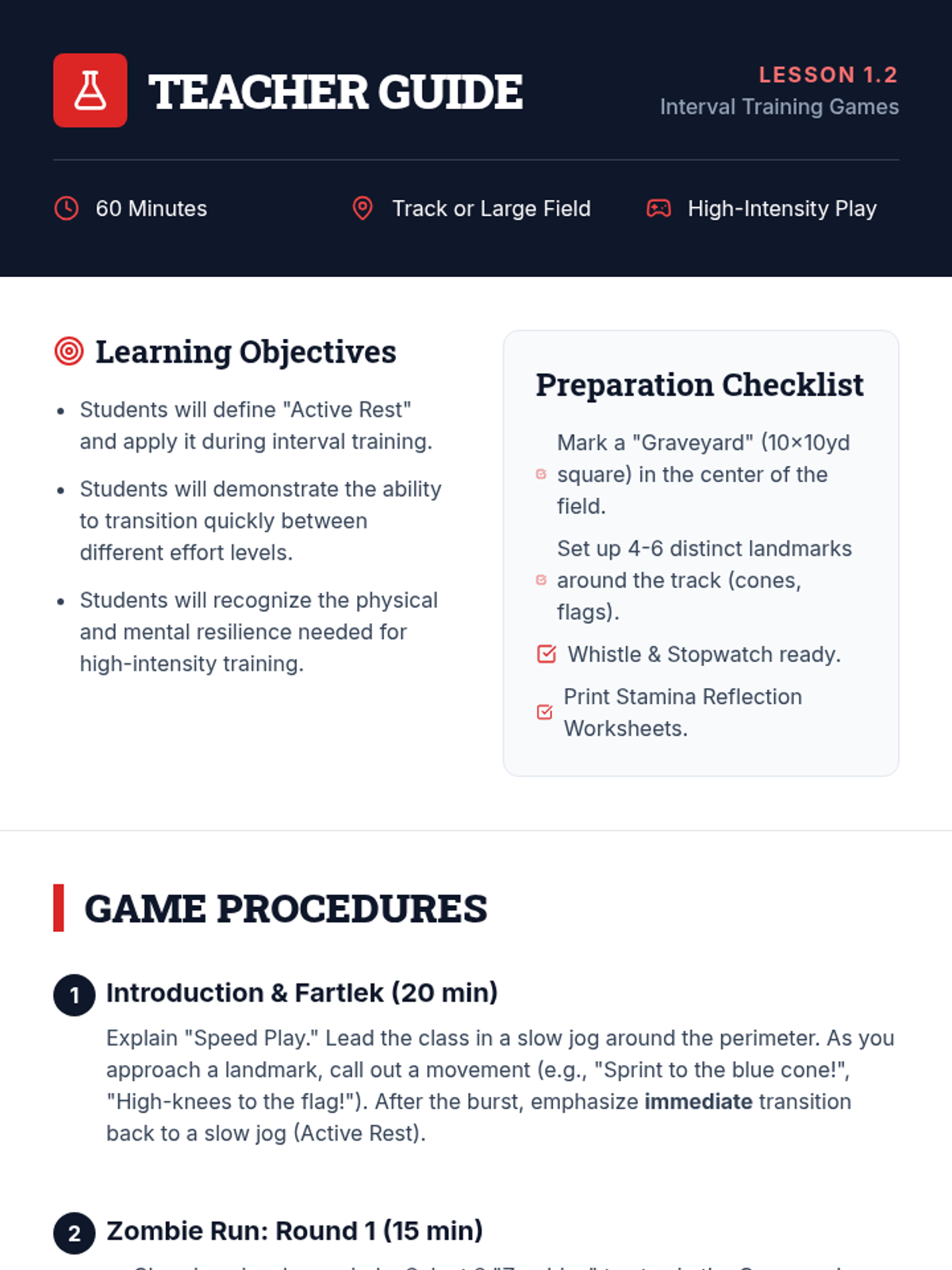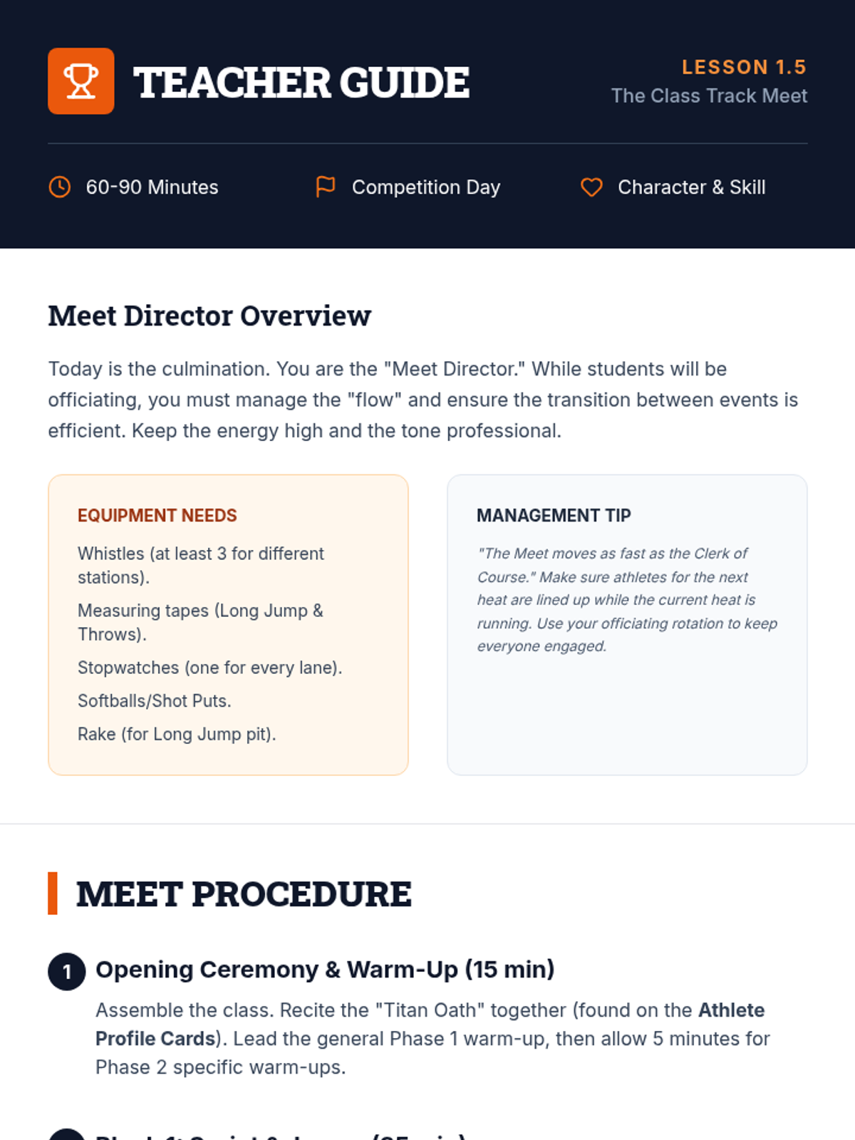 This sequence explores cardiovascular endurance and track meet operations for 5th-grade students. It covers pacing strategies, interval training through games, the mathematical geometry of track lanes, and culminates in a student-led class track meet where they apply both athletic and officiating skills.