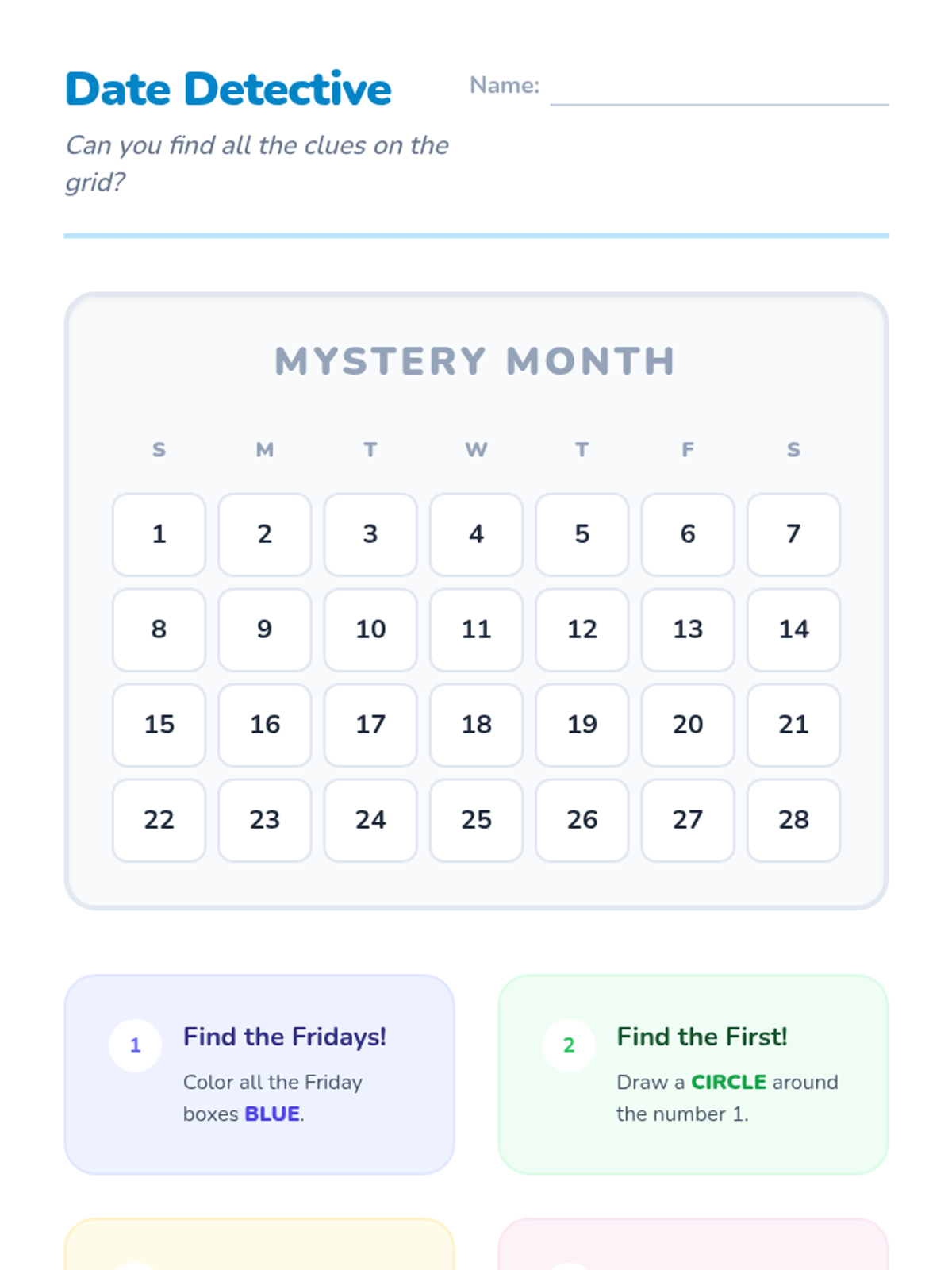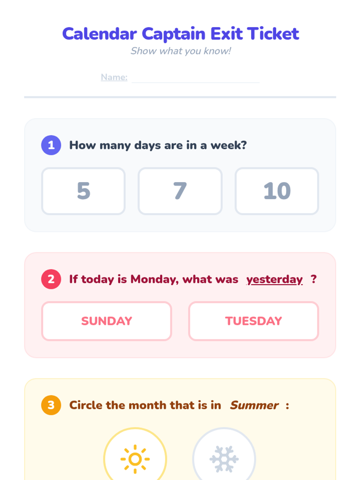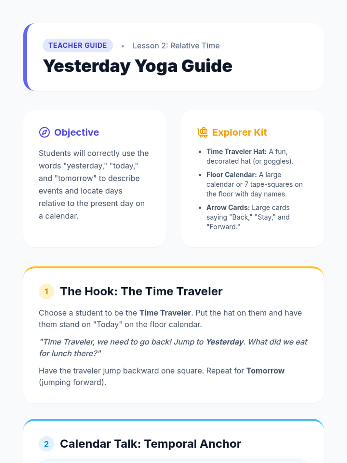 A Kindergarten sequence exploring the calendar, days of the week, and months. Students learn to navigate a calendar grid, understand weekly cycles, and use relative time vocabulary (yesterday, today, tomorrow) through hands-on activities and visual tracking.