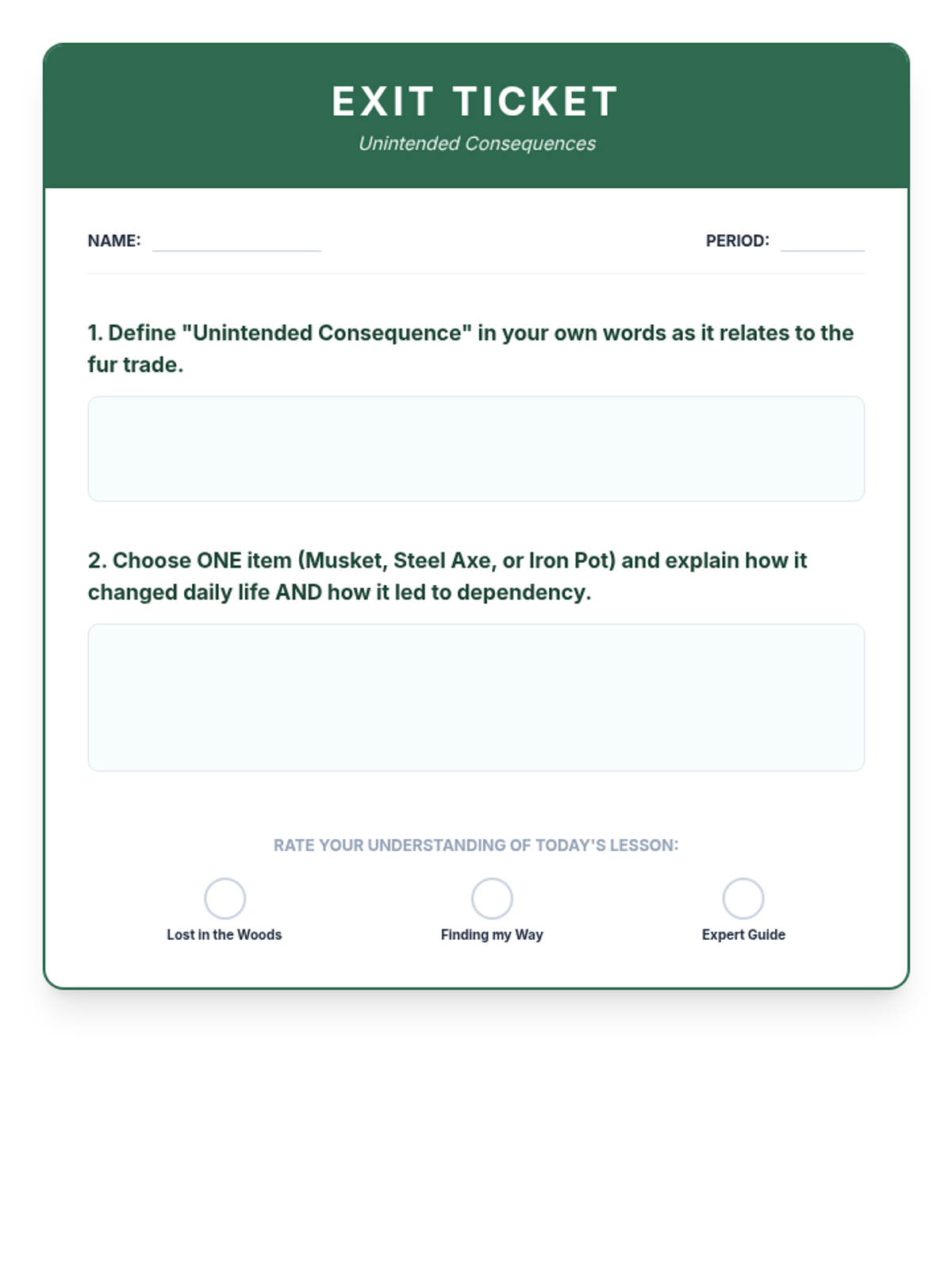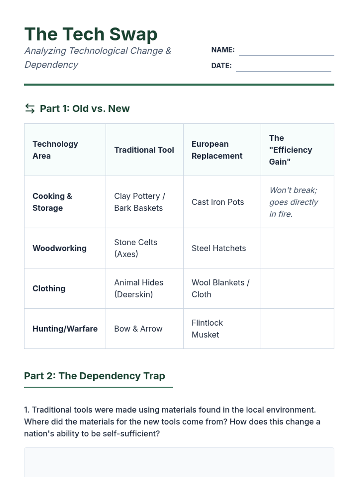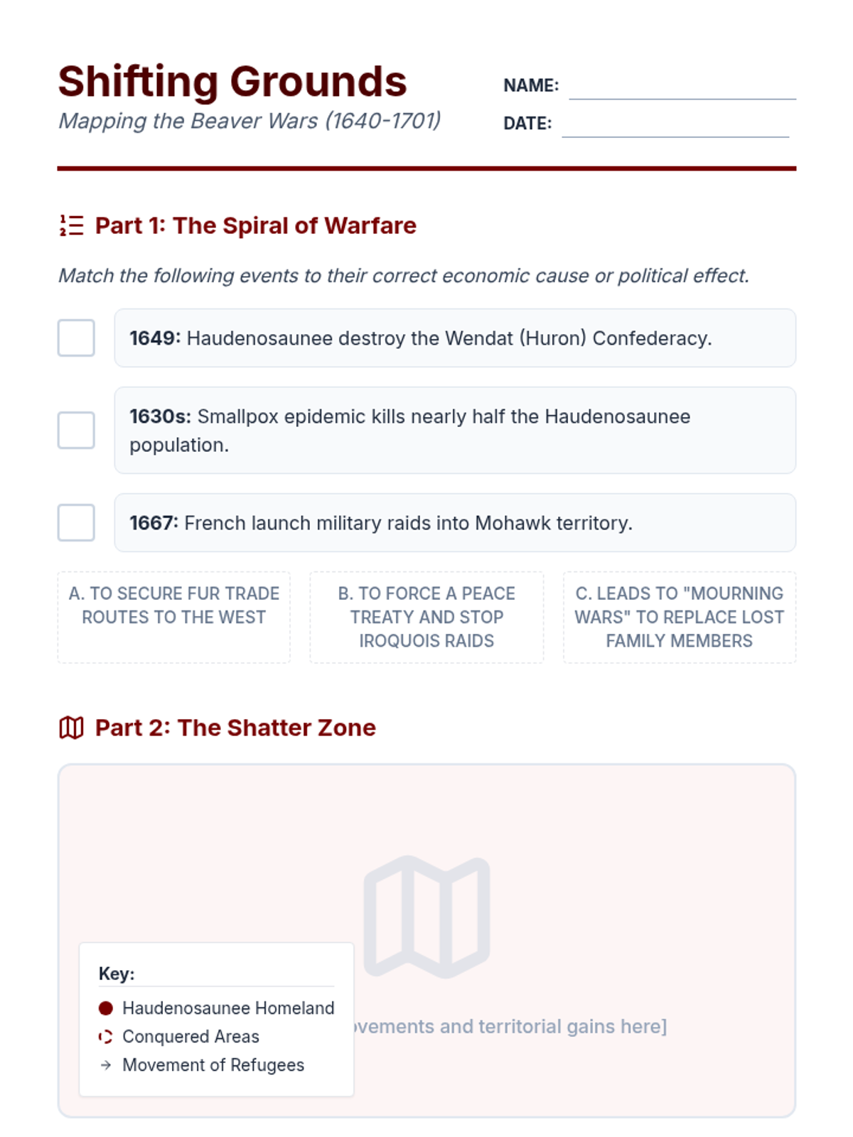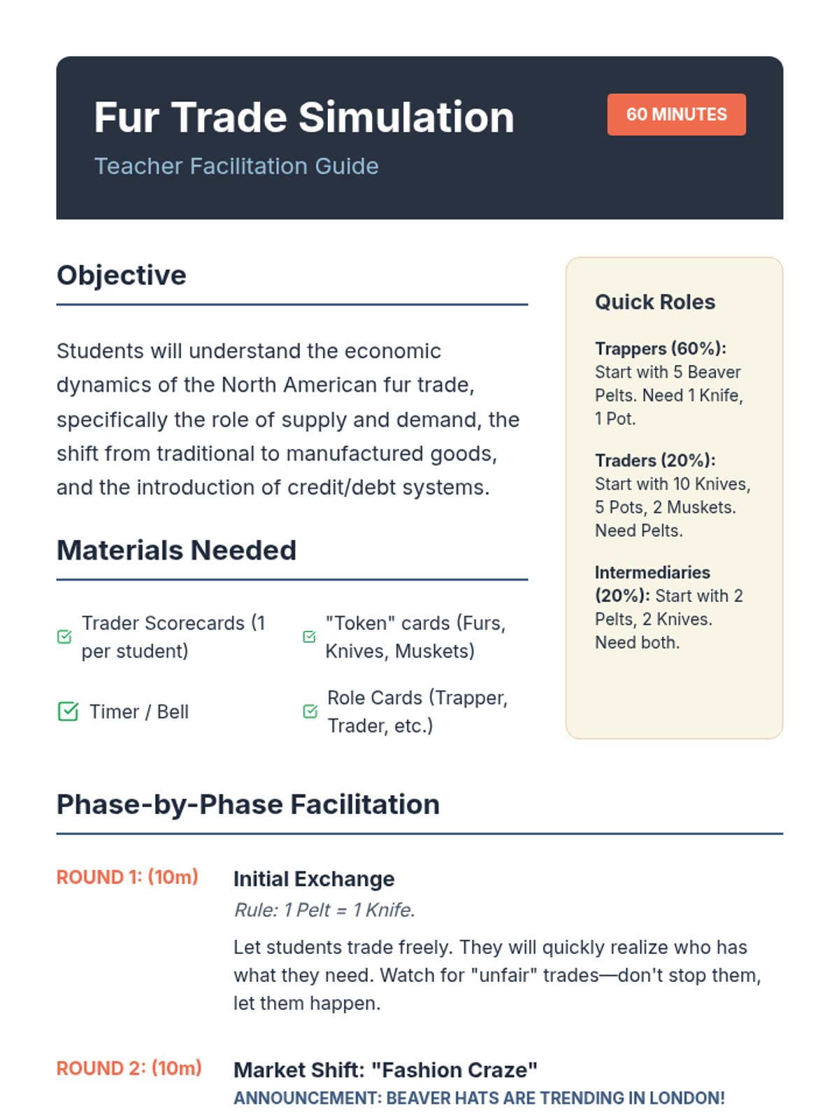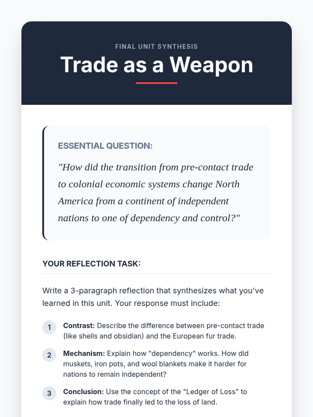 This unit explores the complex economic networks of Native Peoples in North America, tracing the transition from pre-contact continental trade to the disruptive impacts of the Trans-Atlantic fur trade and colonial economic dependency. Students will analyze archaeological evidence, simulate economic shifts, and evaluate how trade served as both a cultural bridge and a colonial weapon.