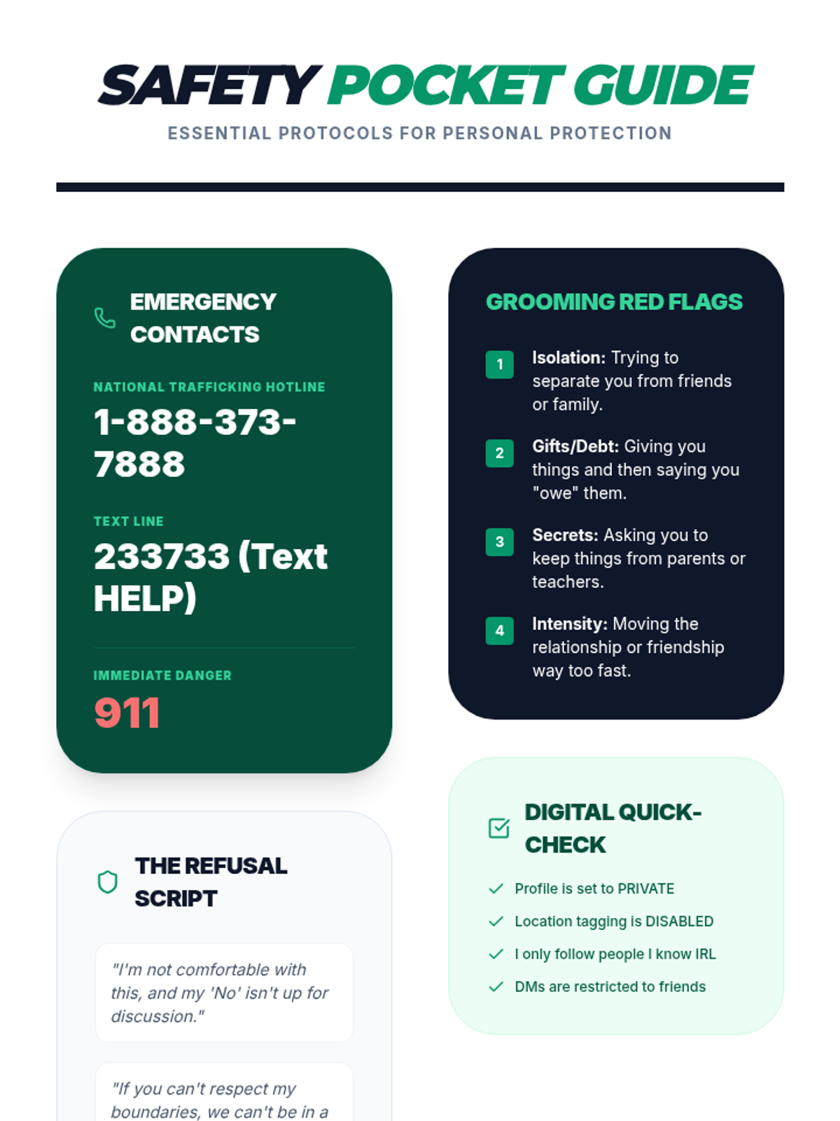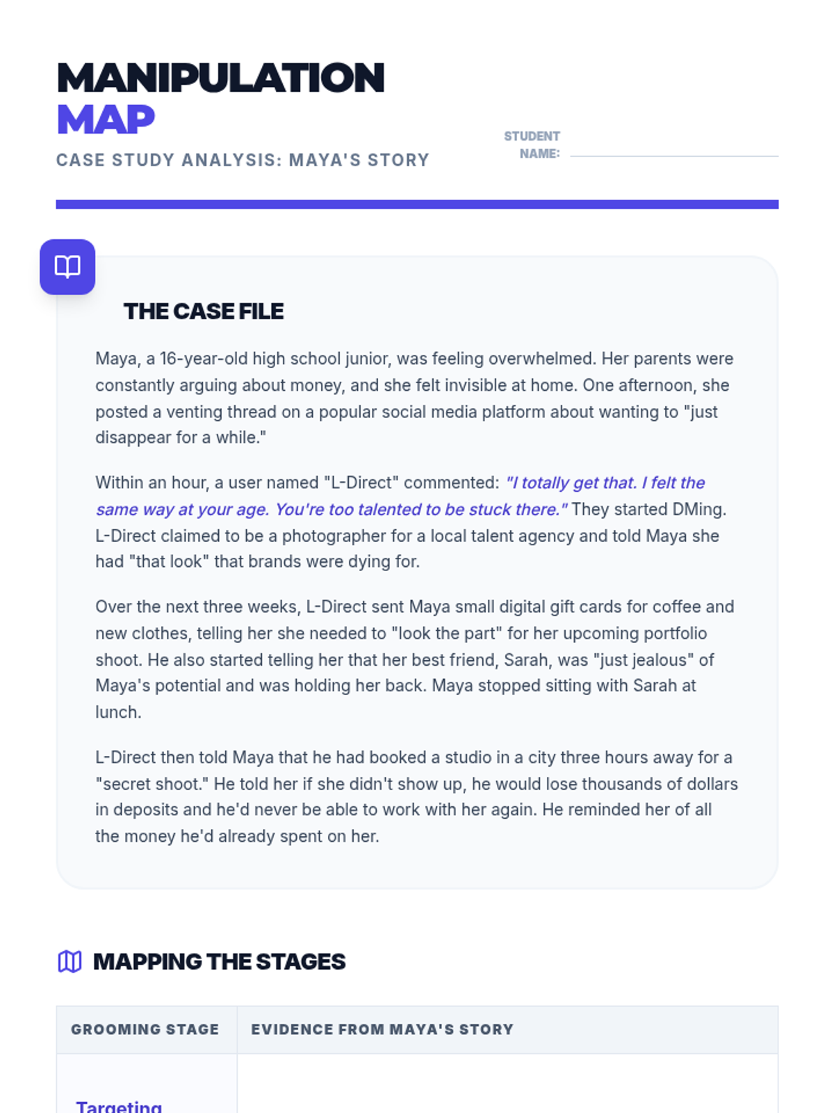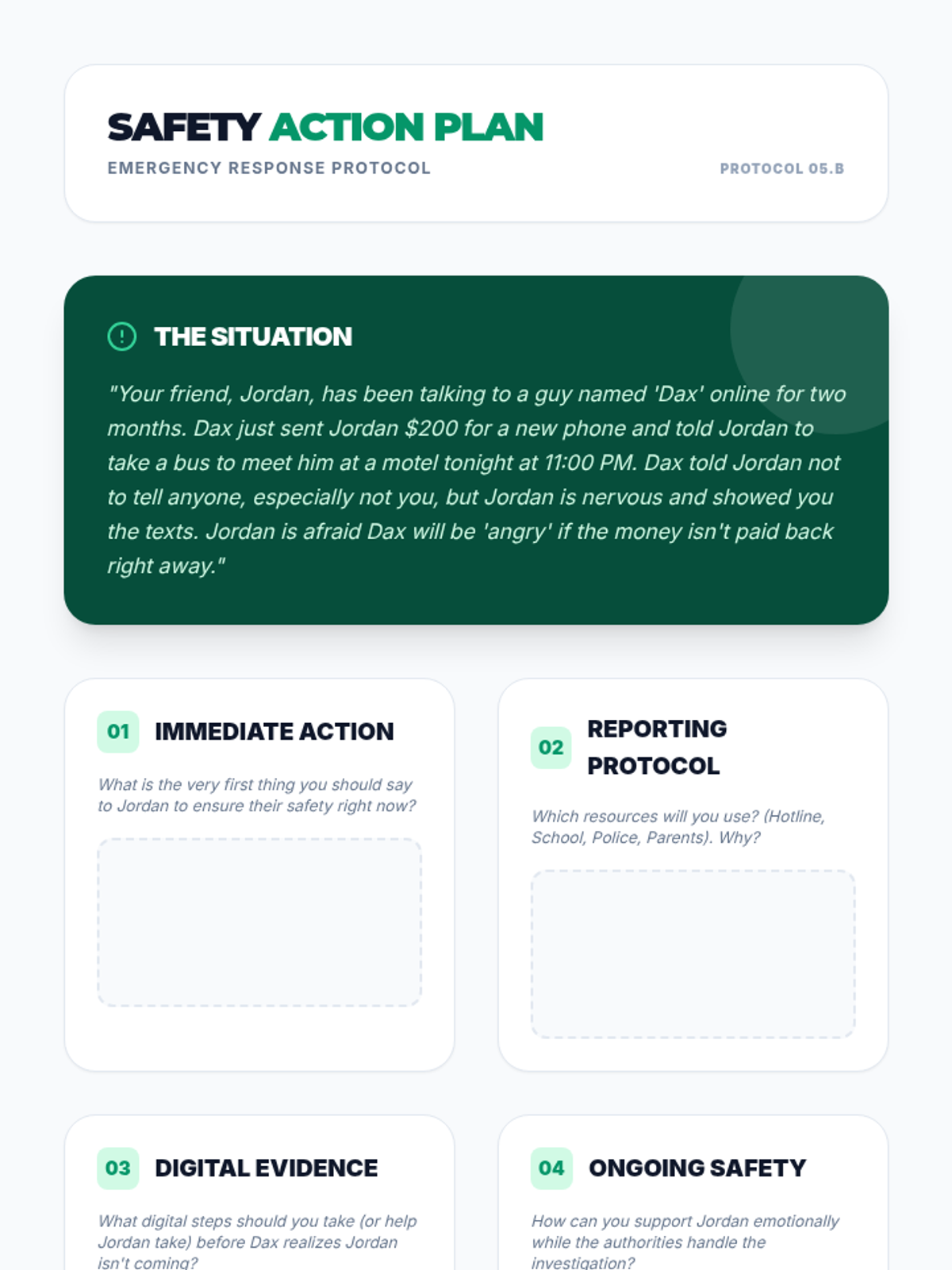 A comprehensive 9th-grade unit on identifying human trafficking recruitment tactics, grooming stages, digital risks, and personal safety strategies. Students learn to distinguish between healthy relationships and exploitation through evidence-based analysis and practical skill-building.
