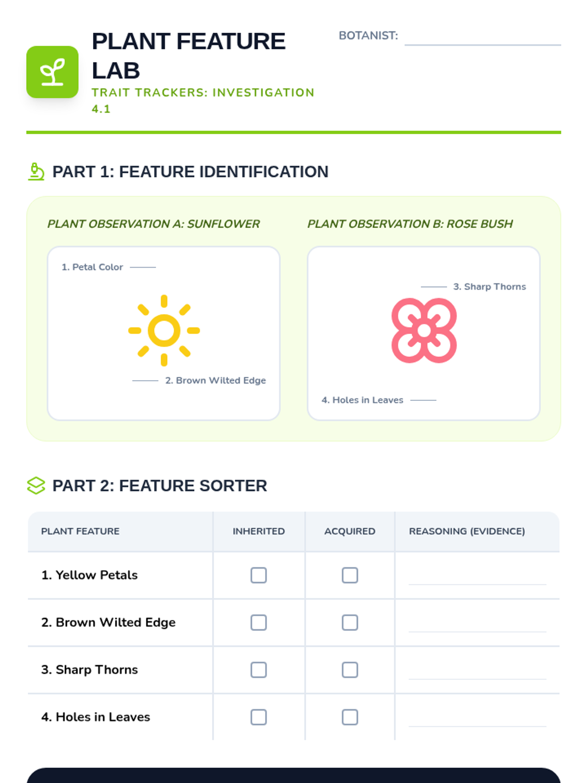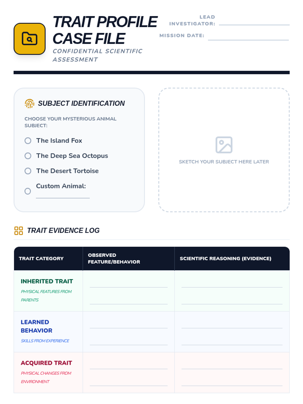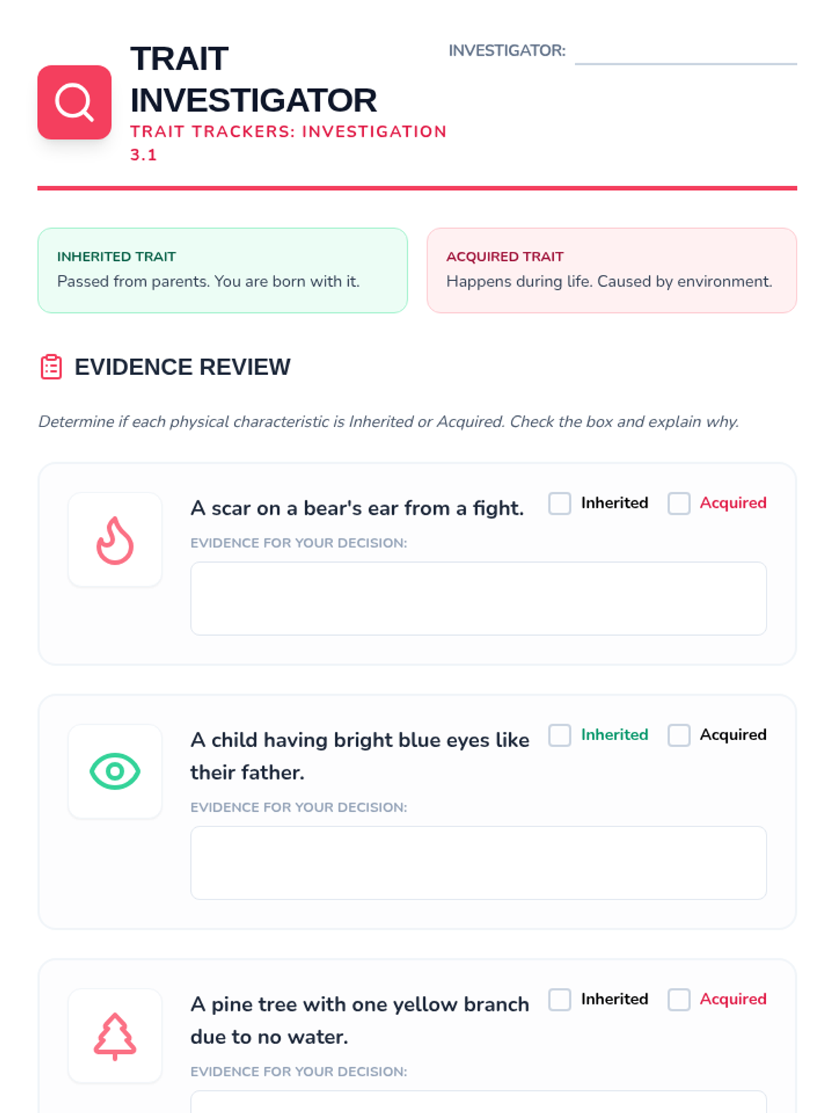 Students investigate the differences between traits passed down from parents (inherited) and traits acquired through life experiences (learned behaviors or physical changes). Through observations of animals, plants, and humans, they build a scientific framework for classifying characteristics based on their origin.