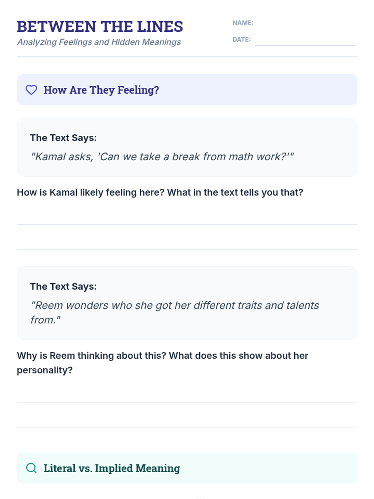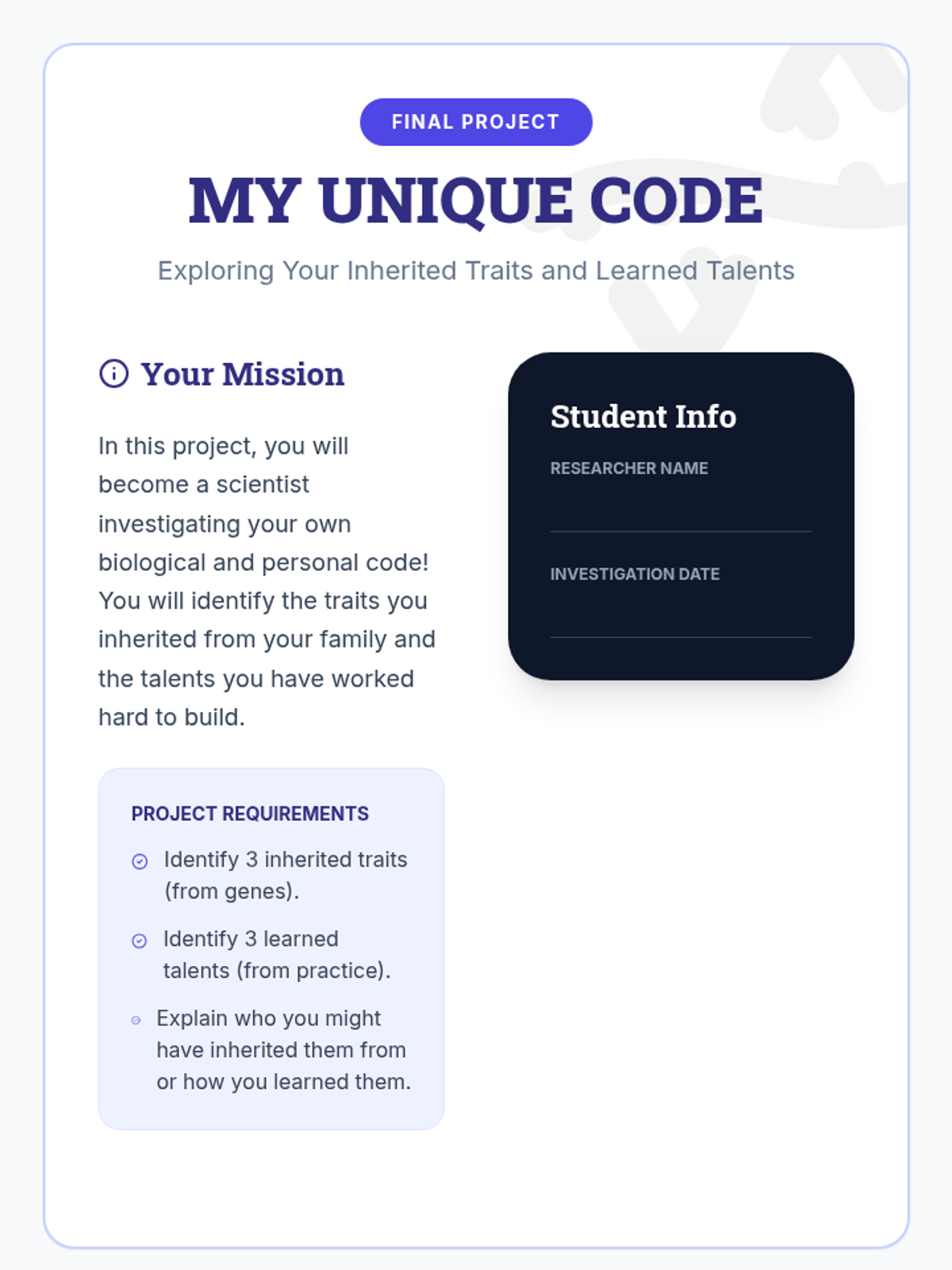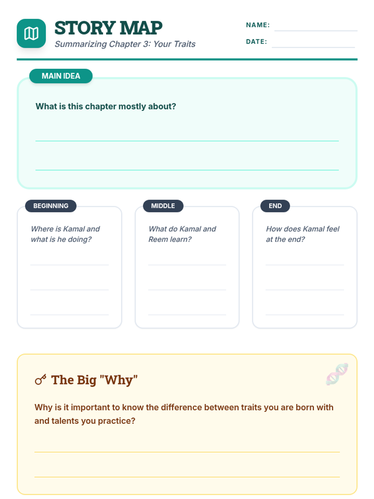 A comprehensive unit exploring inherited traits, talents, and character analysis through the lens of Kamal's story. Students will distinguish between genetic traits and learned talents, analyze character motivations, and document their own unique 'code'.