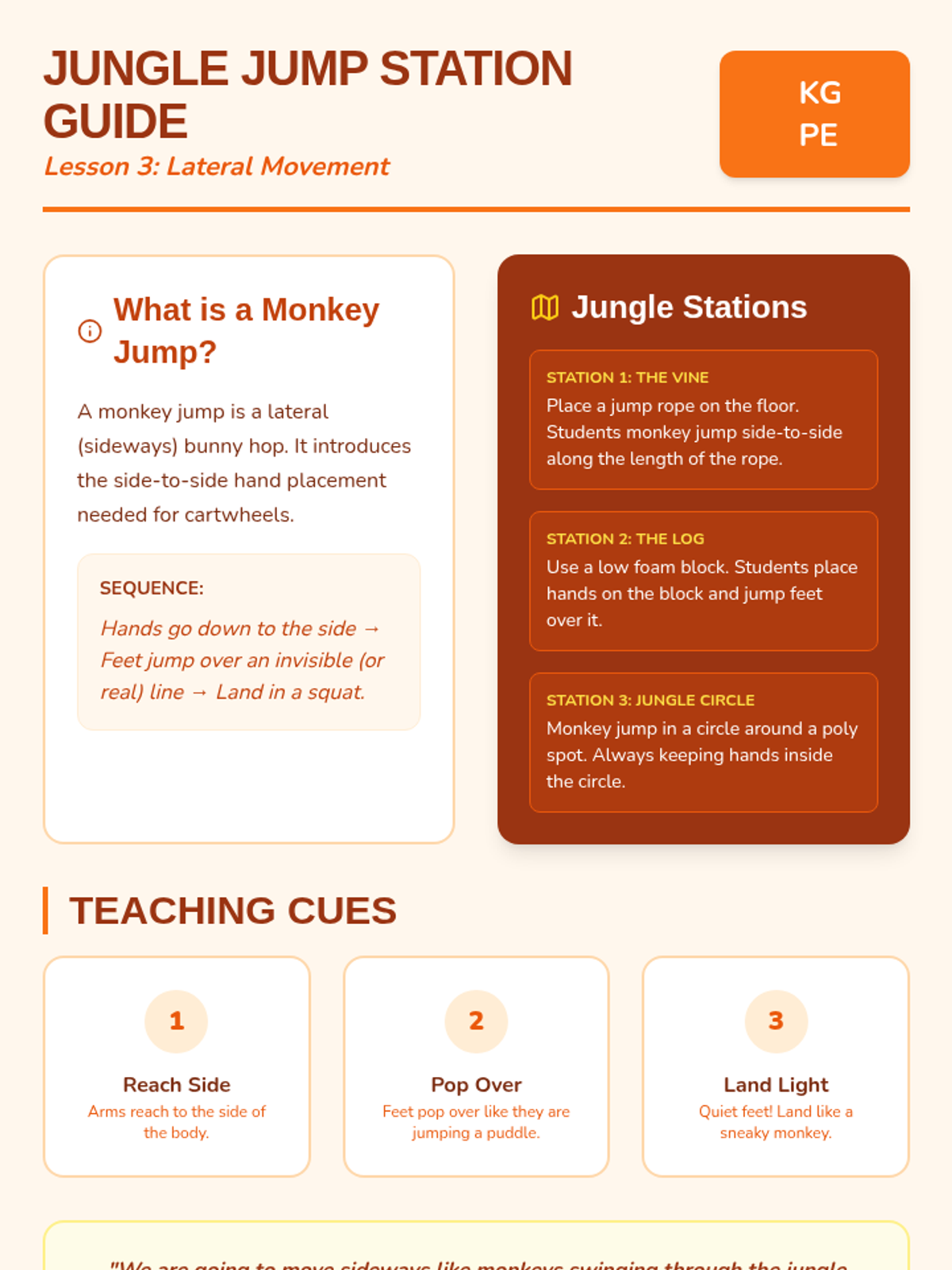 A Kindergarten sequence focused on physical education and team building. Students engage in imaginative adventure scenarios to develop problem-solving, communication, and cooperation skills through group challenges.
