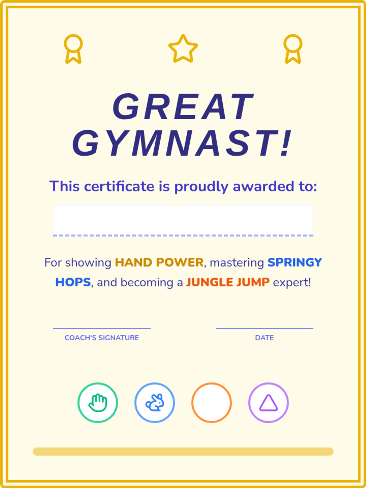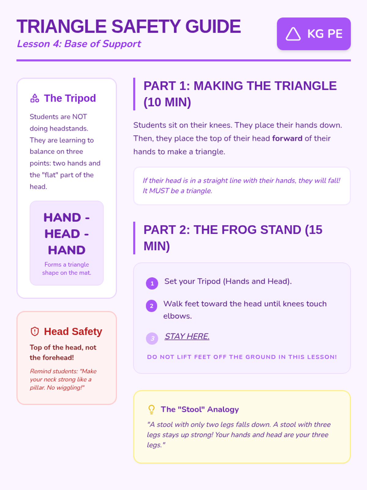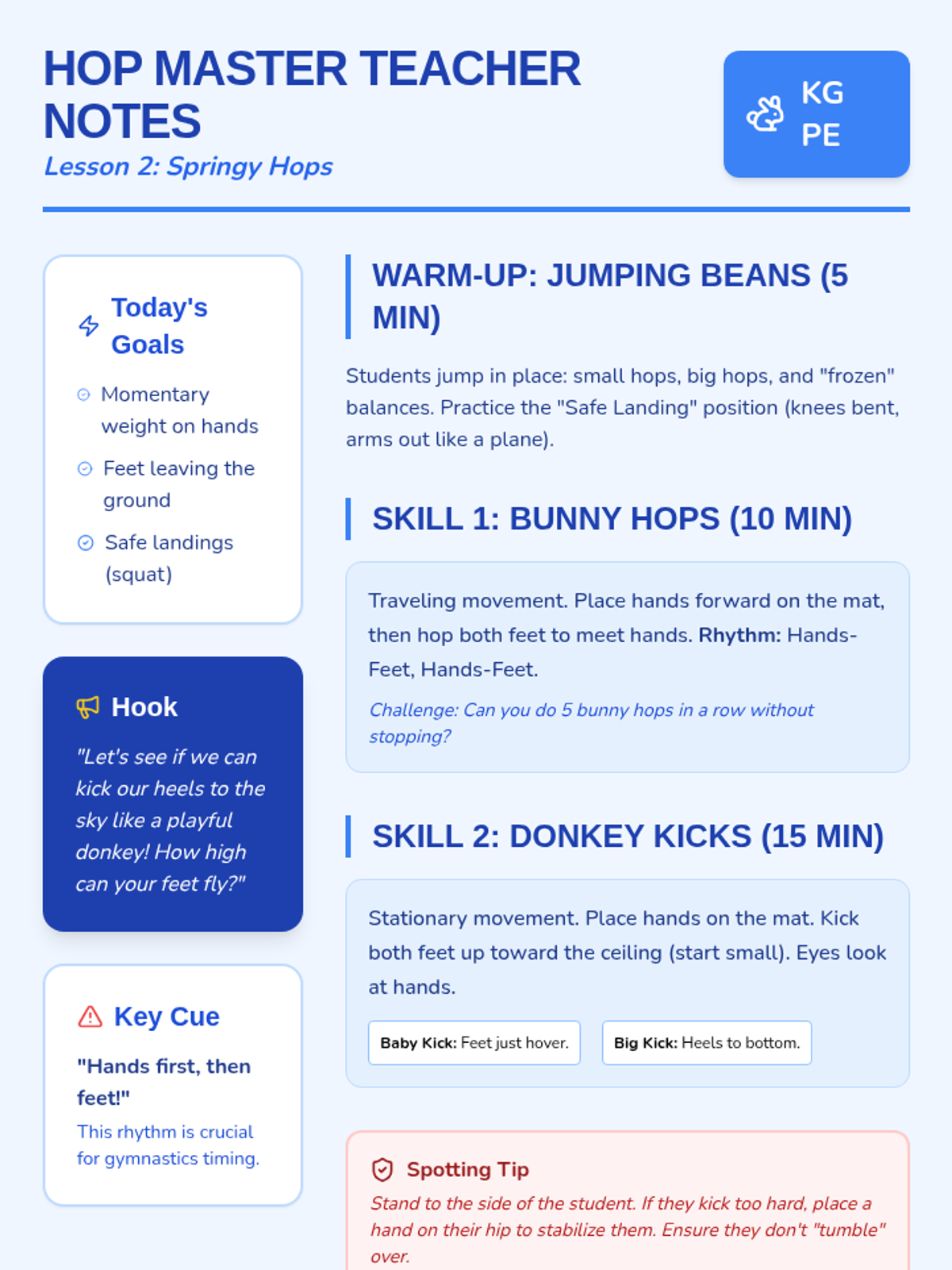A foundational gymnastics sequence for Kindergarteners focusing on weight transfer from feet to hands. Students build upper body strength and confidence through animal-themed movements and basic inversions.