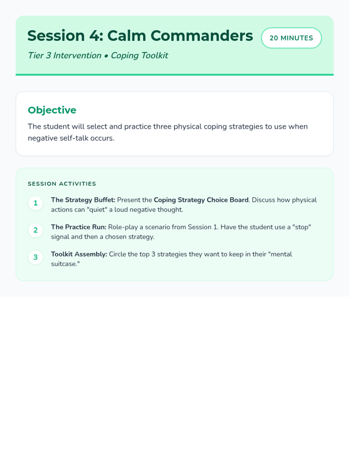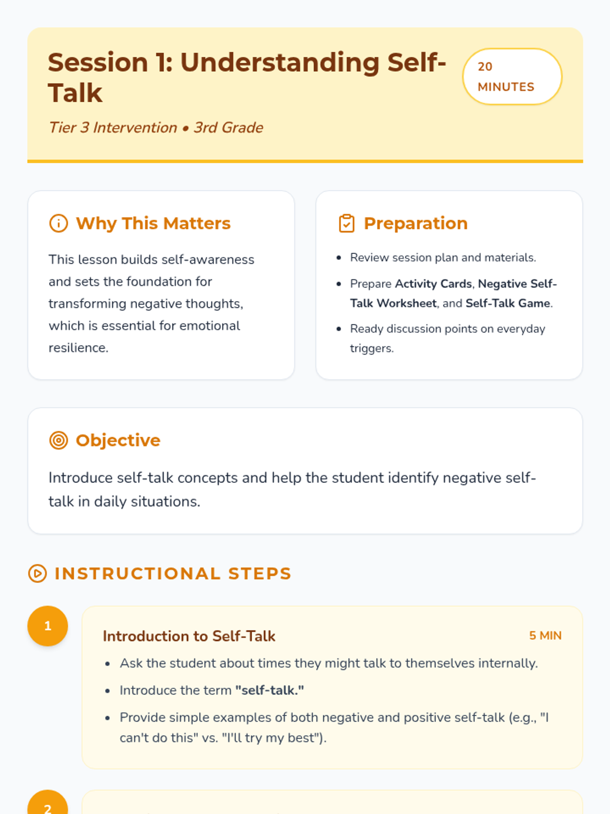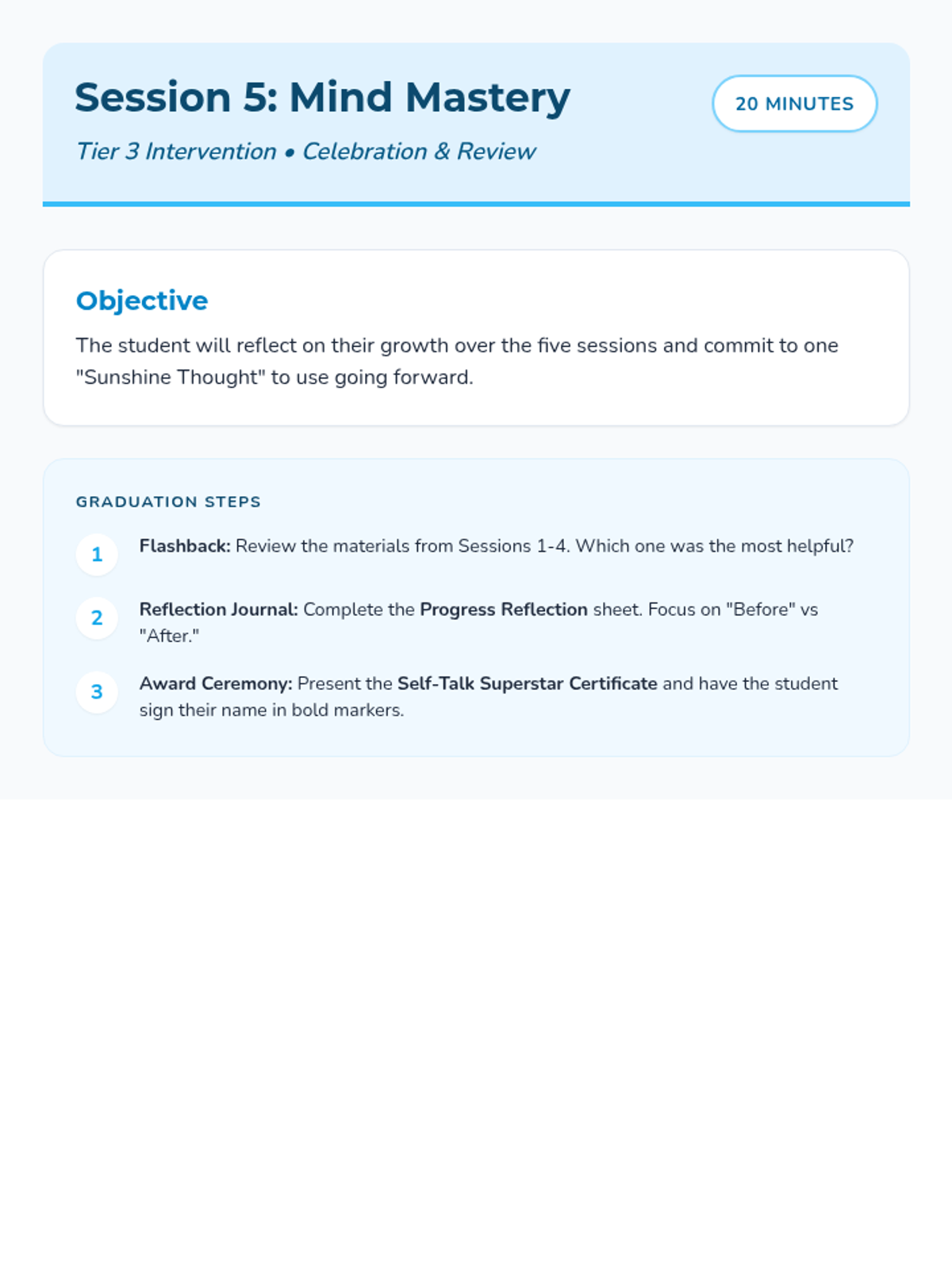 A 5-session Tier 3 intervention for 3rd grade students on IEPs, focused on identifying negative and positive self-talk, cognitive-behavioral triangle connections, and coping strategies to build resilience.
