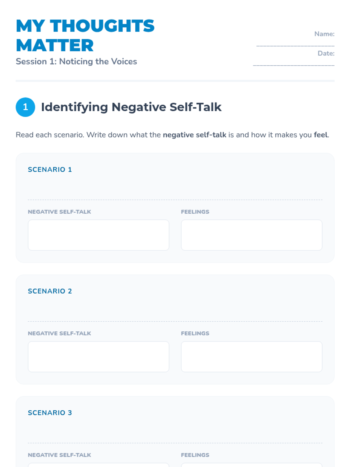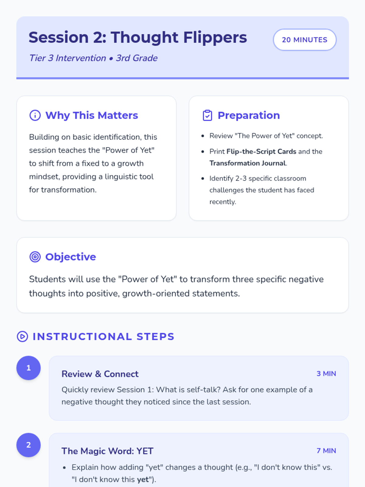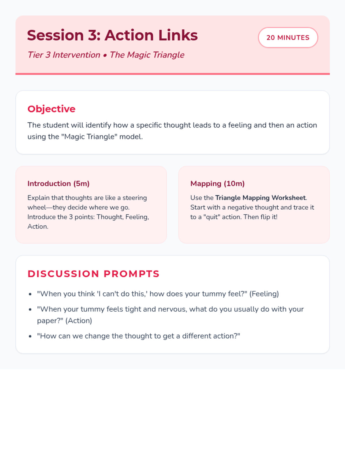 A 5-session Tier 3 intervention for 3rd grade students on IEPs, focused on identifying negative and positive self-talk, cognitive-behavioral triangle connections, and coping strategies to build resilience.