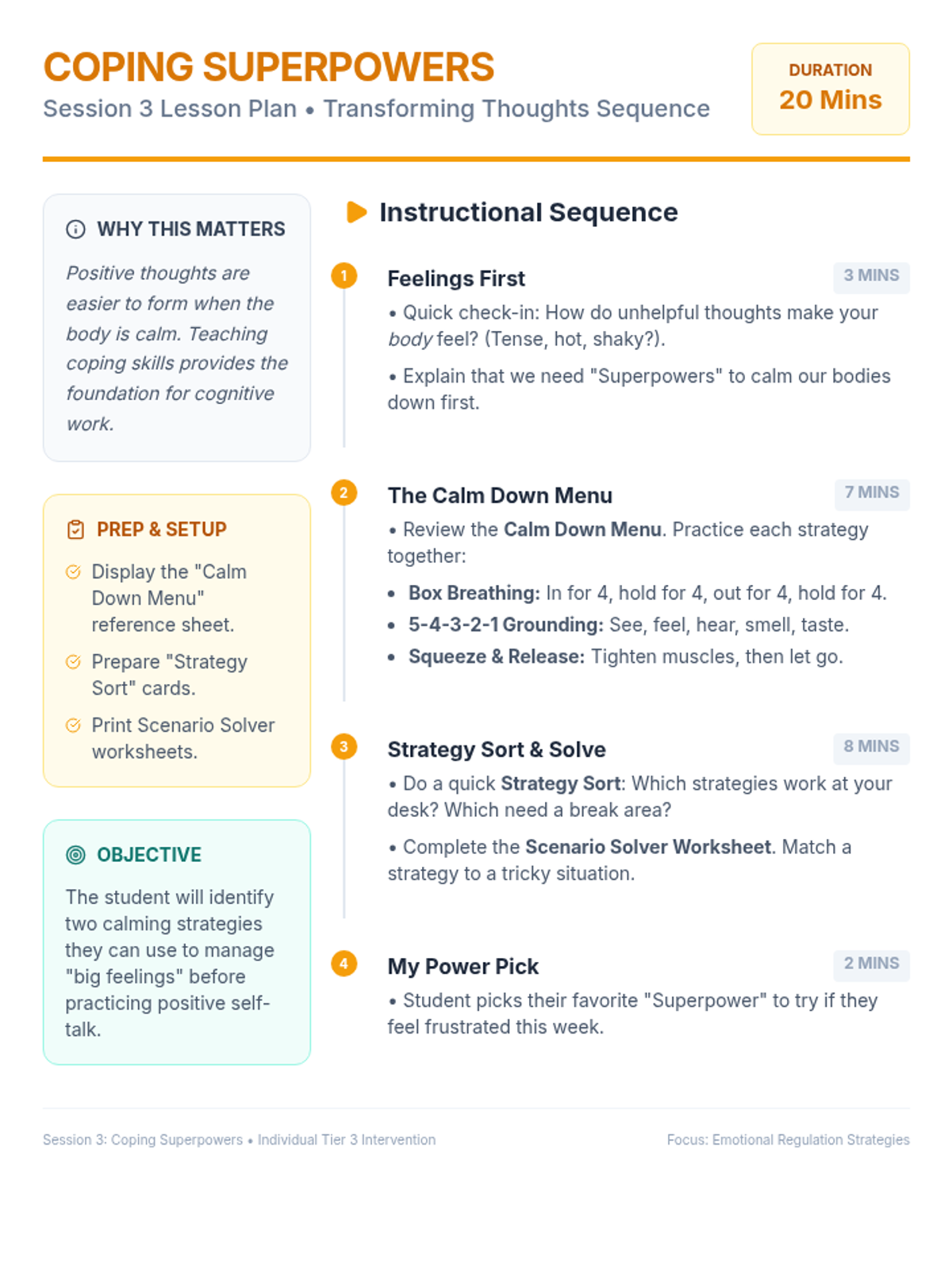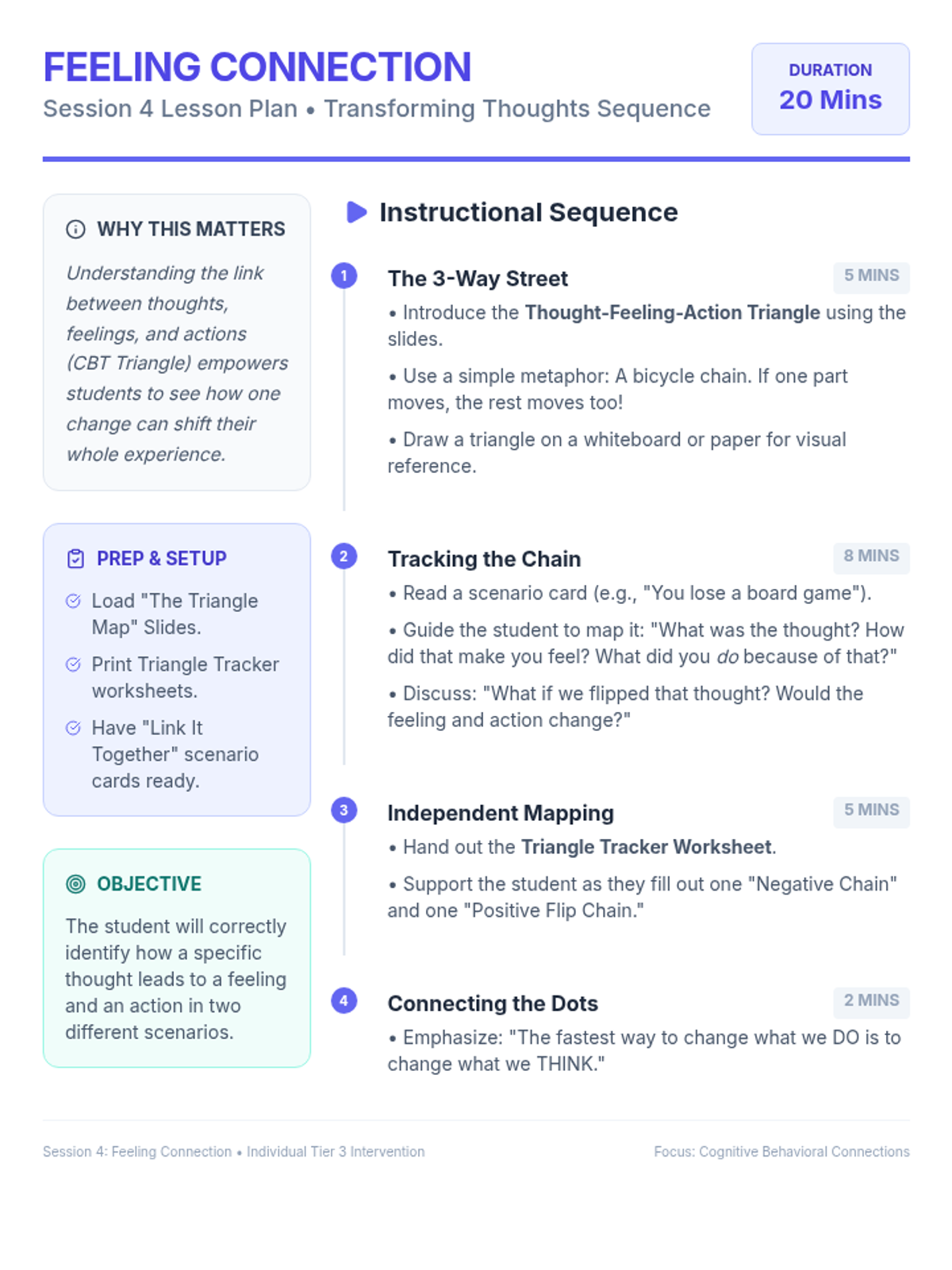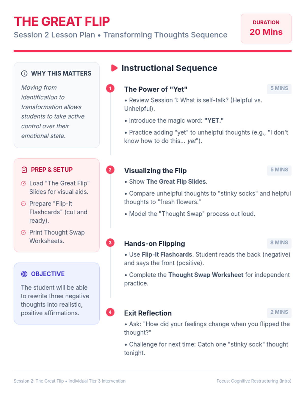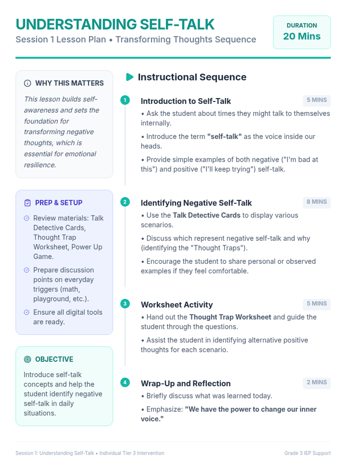 A 5-session intervention sequence for 3rd-grade students to identify and transform negative self-talk using cognitive-behavioral principles and practical coping strategies.