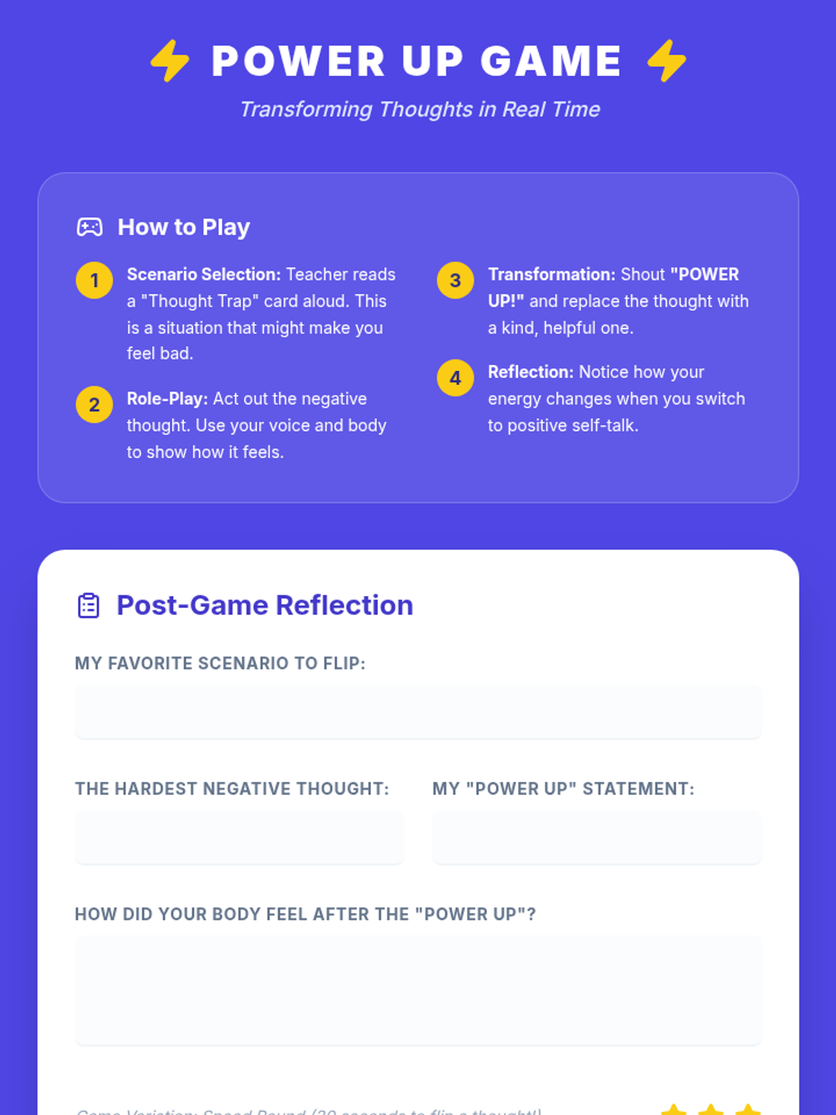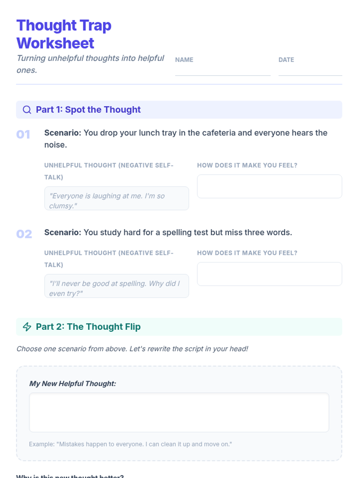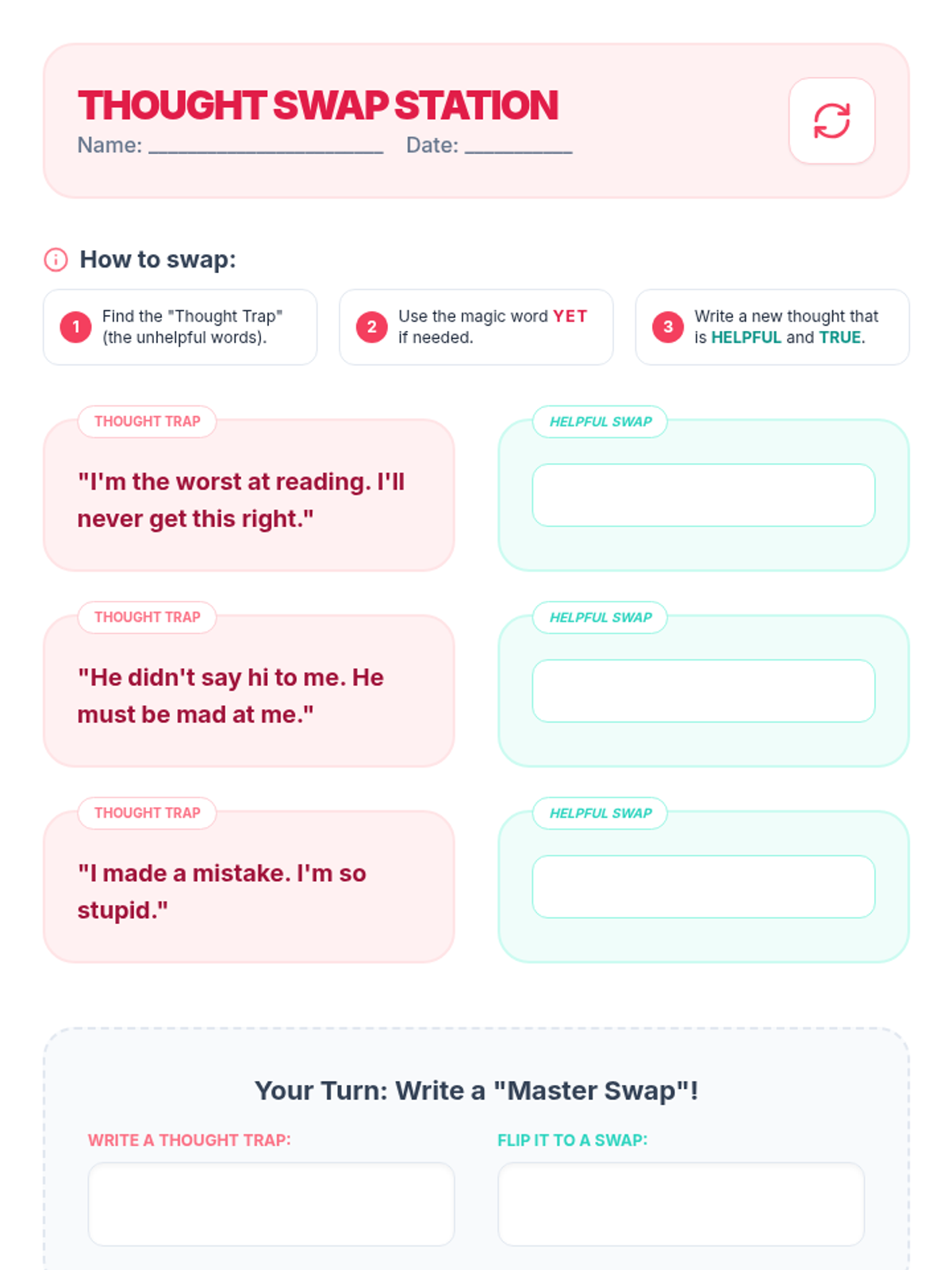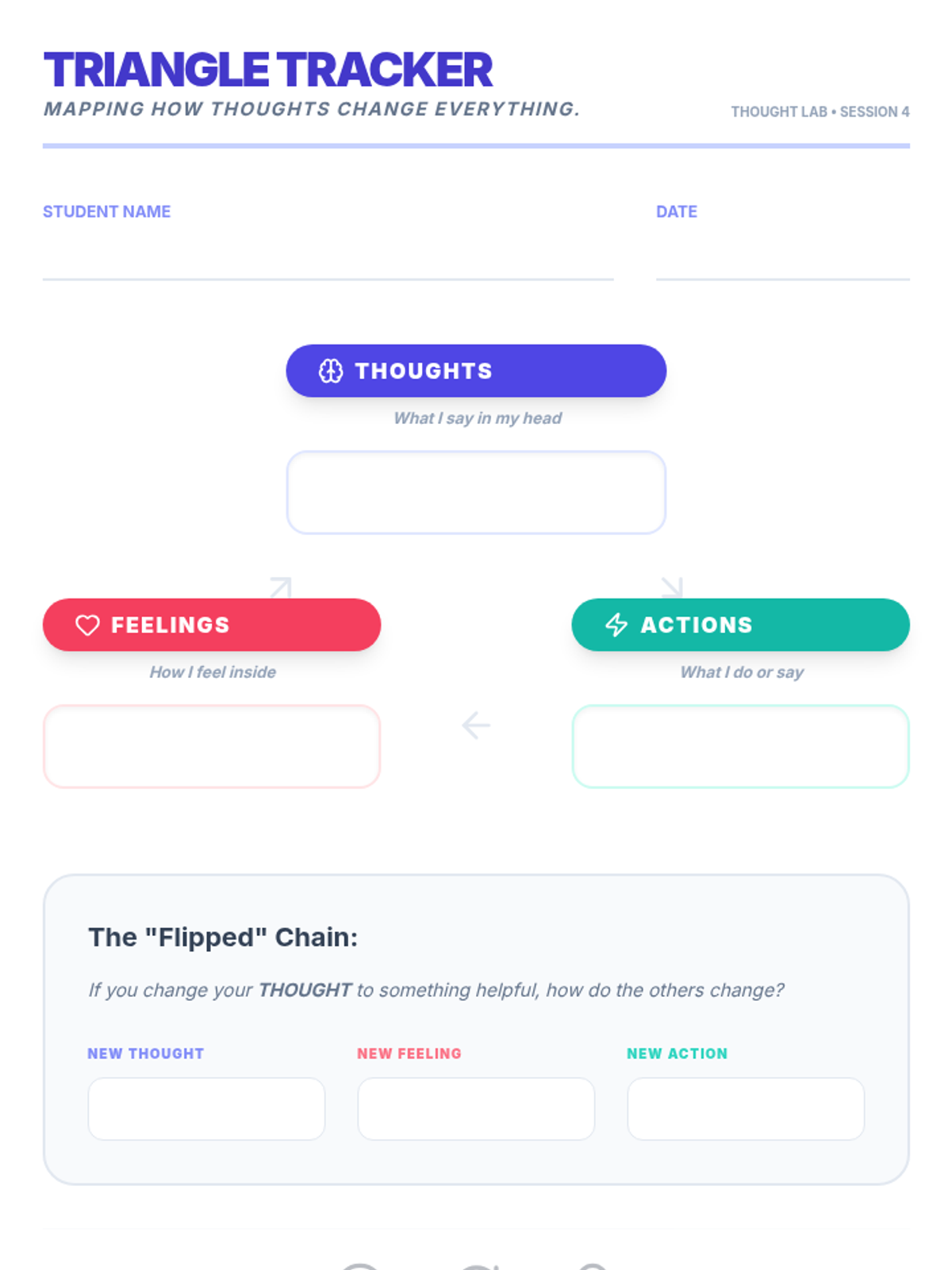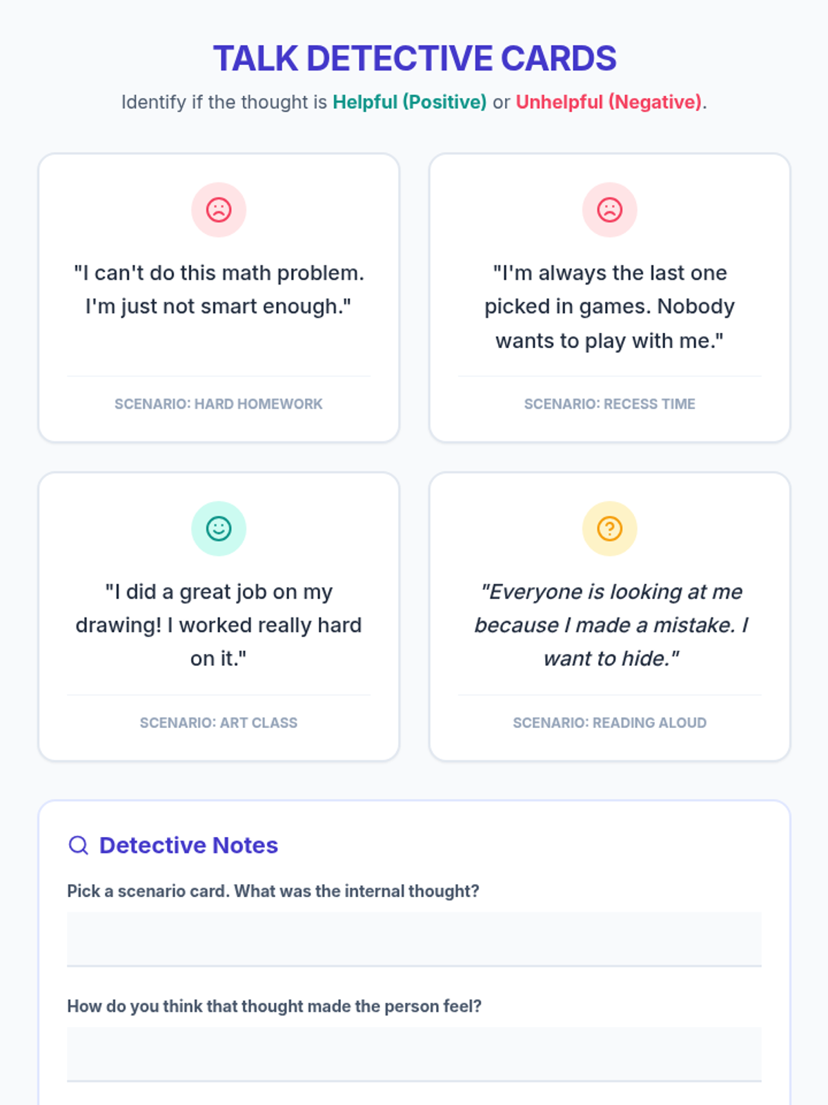 A 5-session intervention sequence for 3rd-grade students to identify and transform negative self-talk using cognitive-behavioral principles and practical coping strategies.