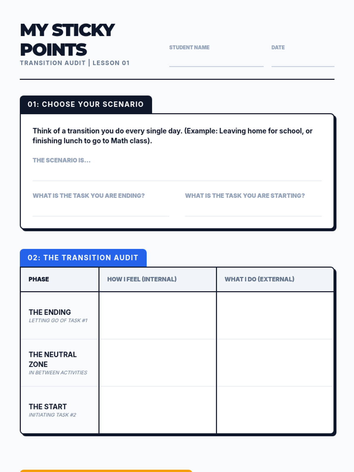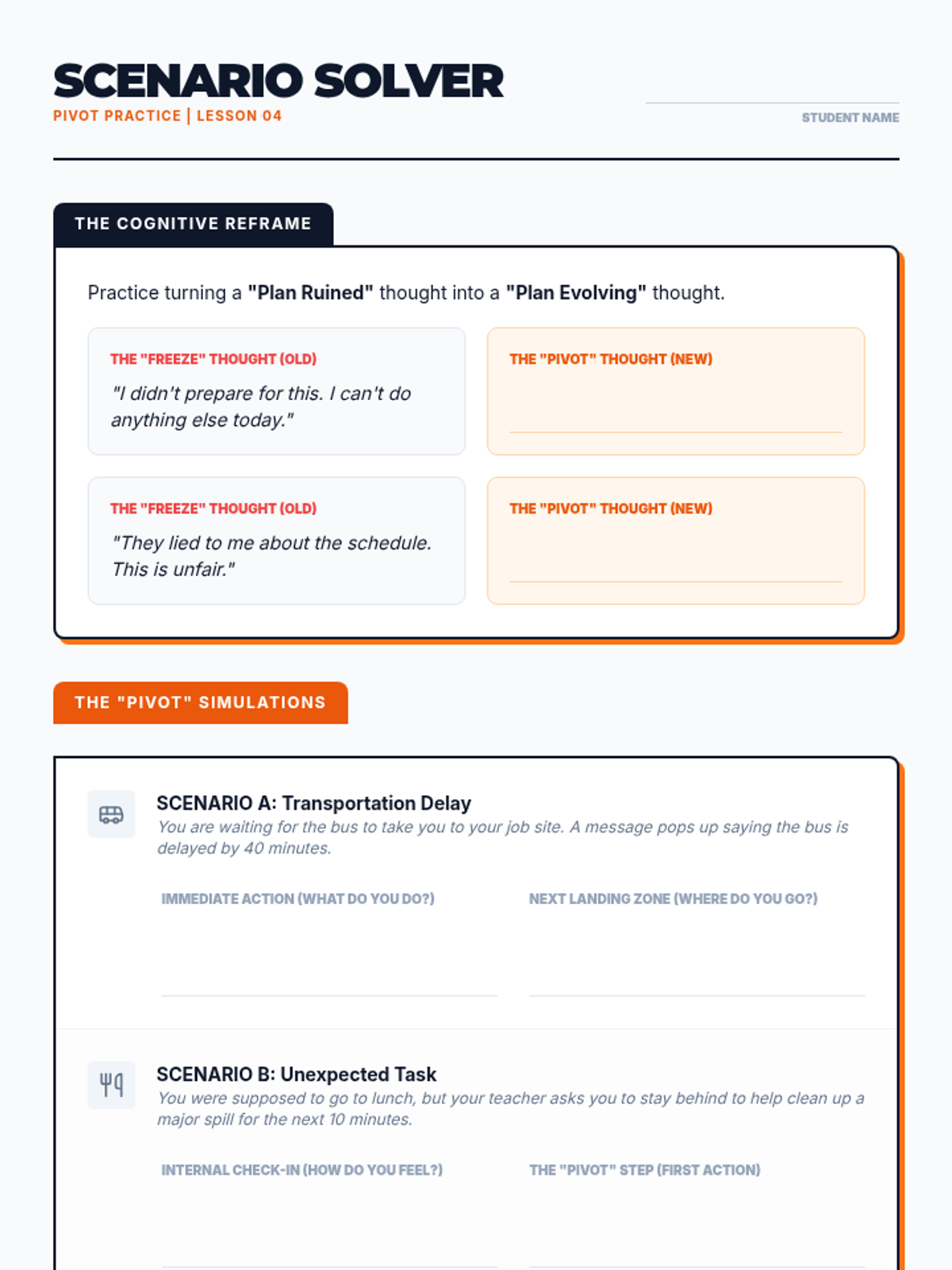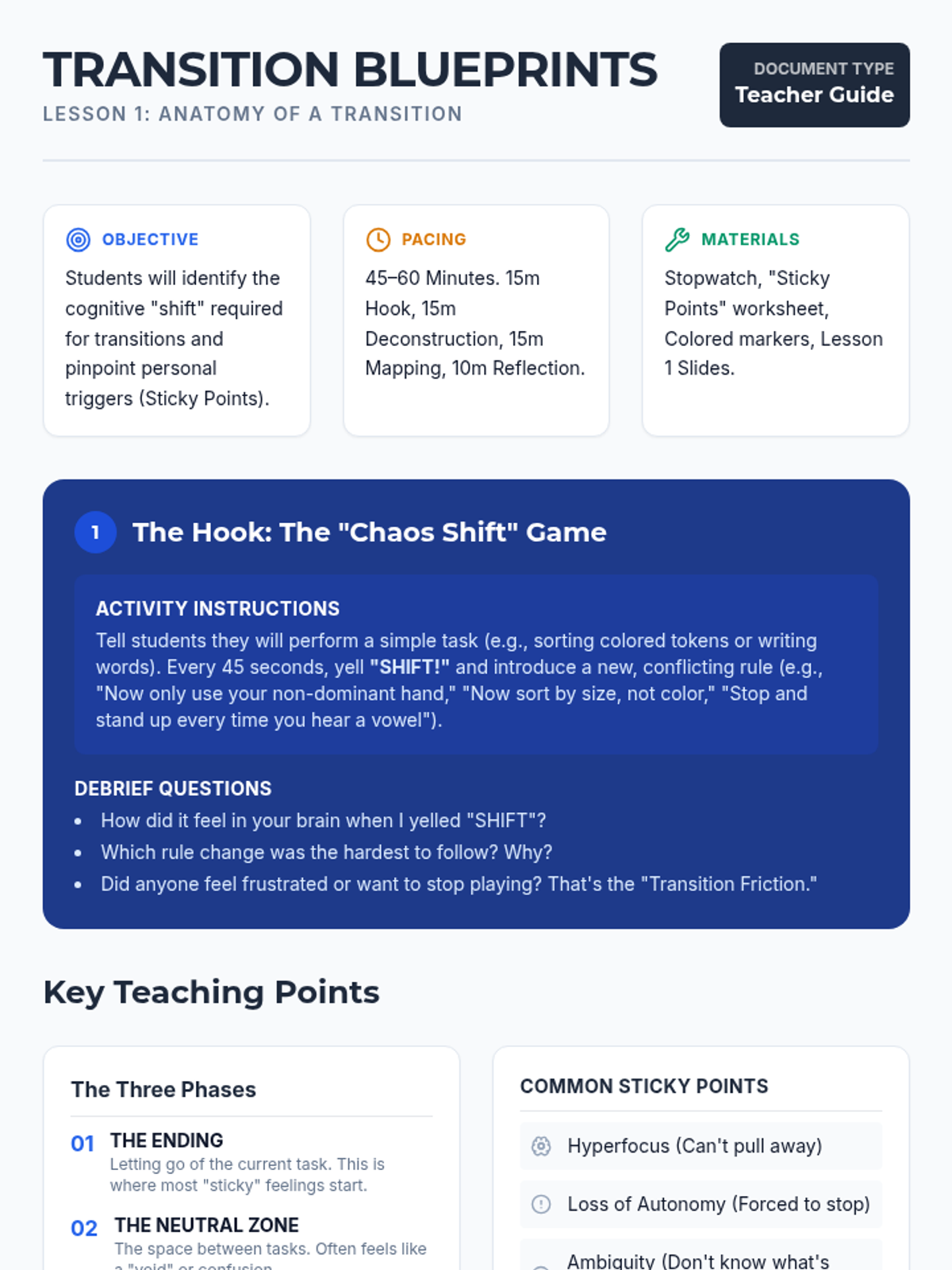 A comprehensive 12th-grade sequence focused on executive function and emotional regulation during schedule transitions. Students move from understanding the cognitive load of switching tasks to building a personalized toolkit of visual timers, schedules, and recovery protocols for unexpected changes.