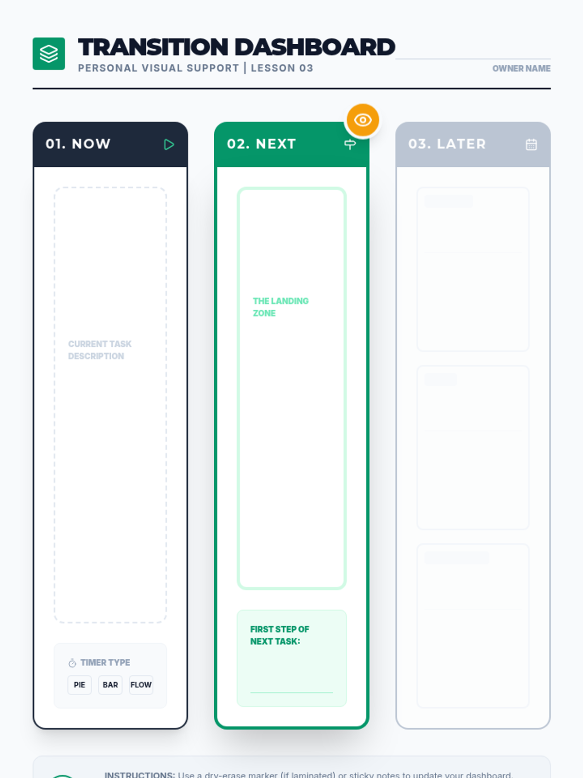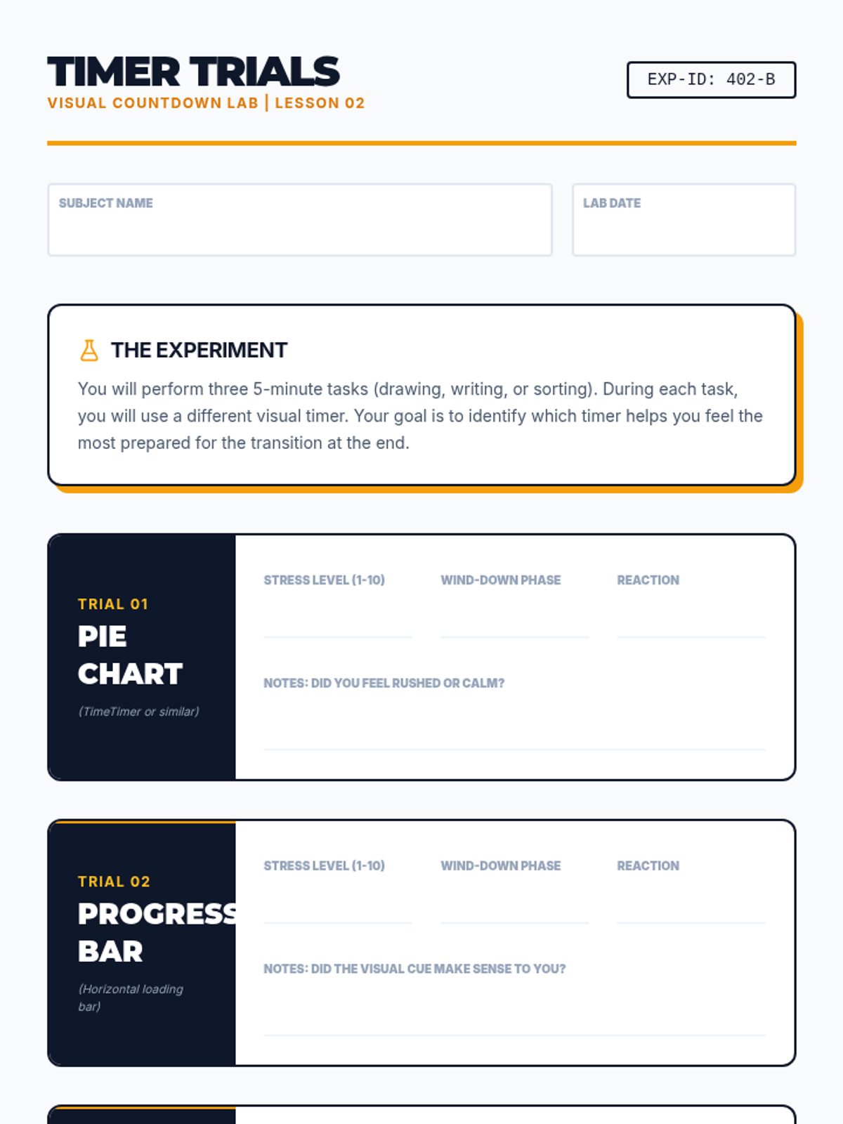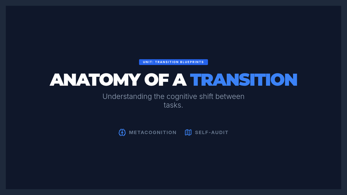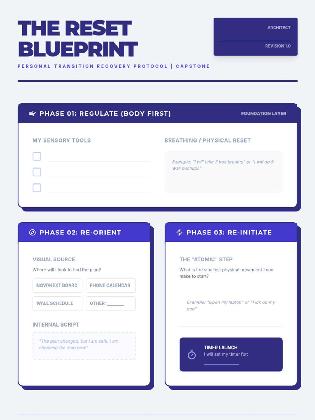 A comprehensive 12th-grade sequence focused on executive function and emotional regulation during schedule transitions. Students move from understanding the cognitive load of switching tasks to building a personalized toolkit of visual timers, schedules, and recovery protocols for unexpected changes.