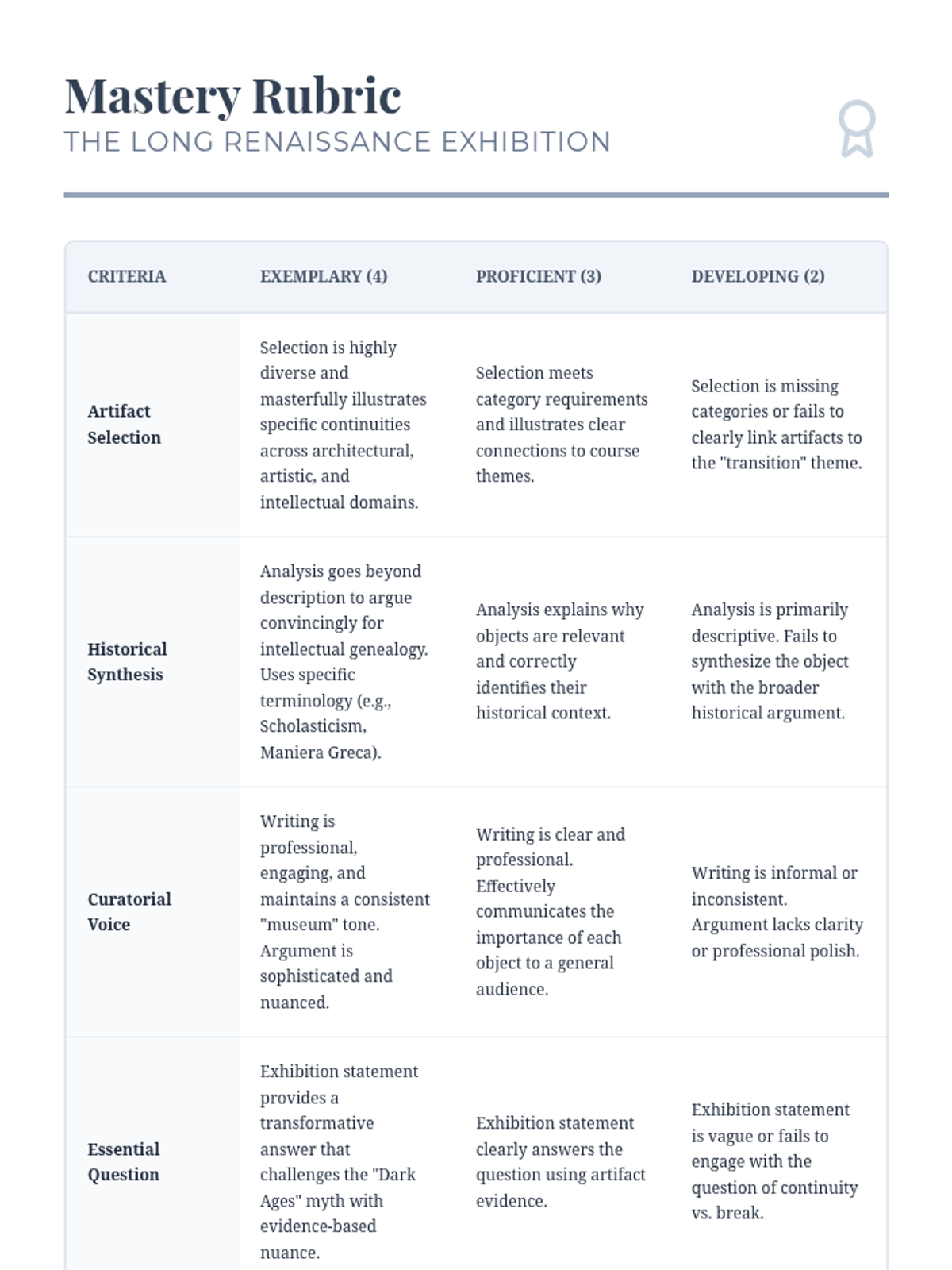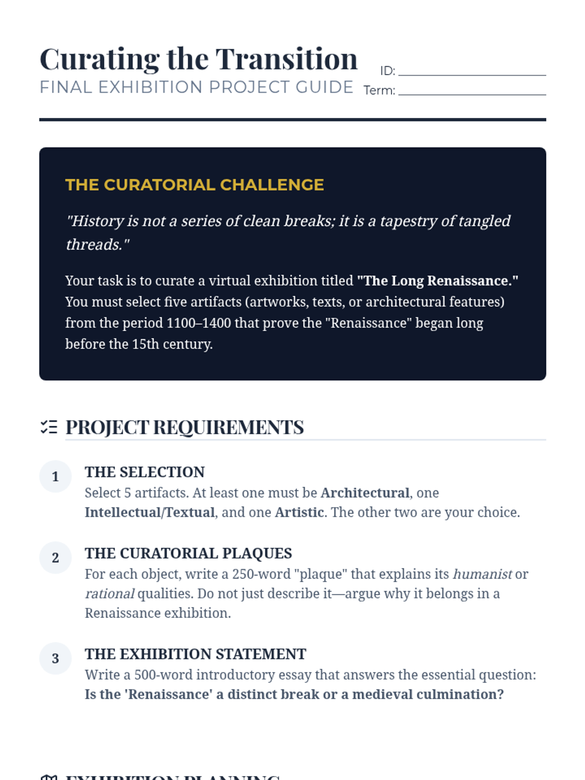 This undergraduate-level sequence challenges the traditional narrative of a sharp break between the Middle Ages and the Renaissance by exploring the intellectual and artistic continuities of the High Middle Ages. Students analyze the 12th-century renaissance, Gothic architecture, the rise of universities, and proto-Renaissance art to curate a final exhibition on historical continuity.