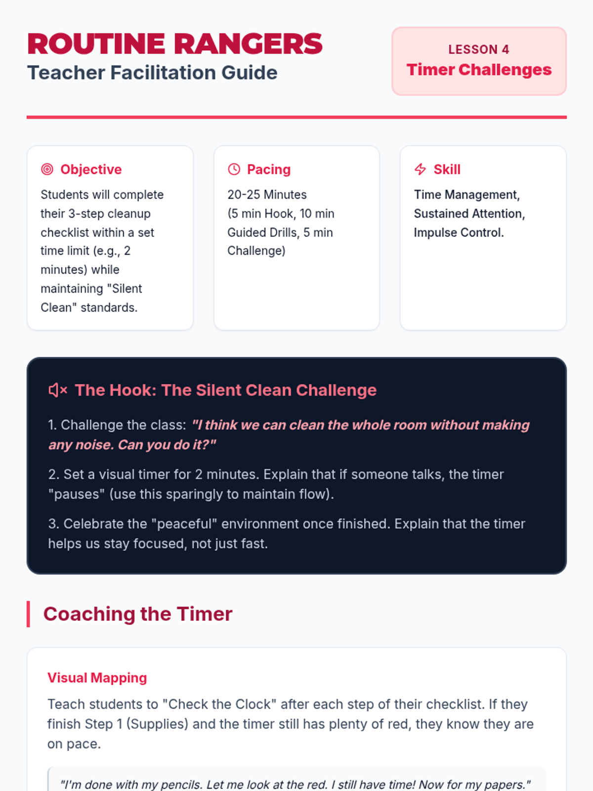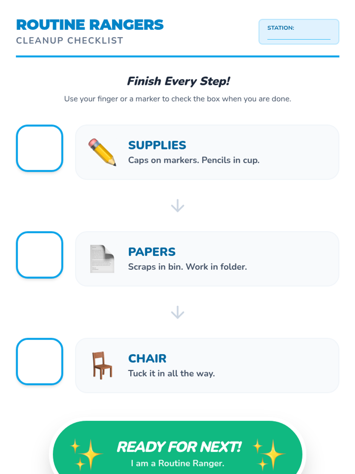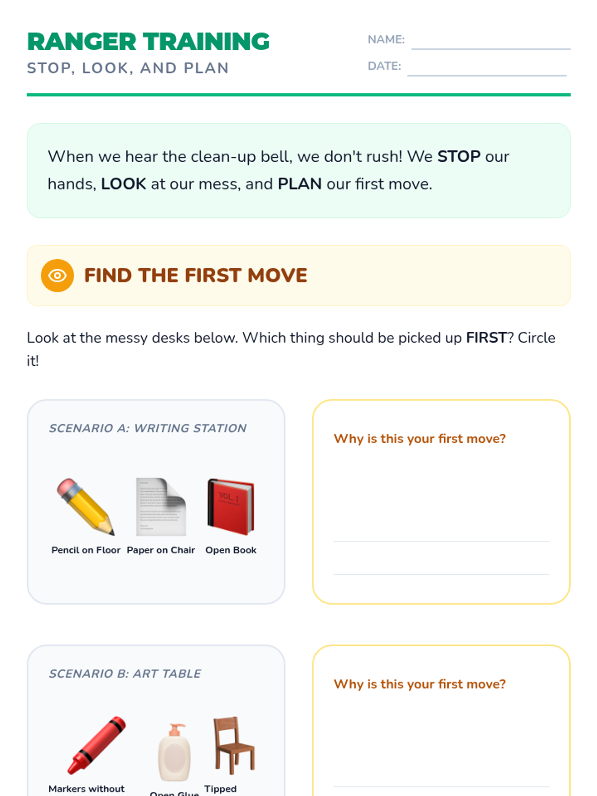 A 1st-grade special education sequence focused on physical organization and transition routines. Students learn to use visual schedules, planning techniques, checklists, and timers to gain independence during classroom cleanup.