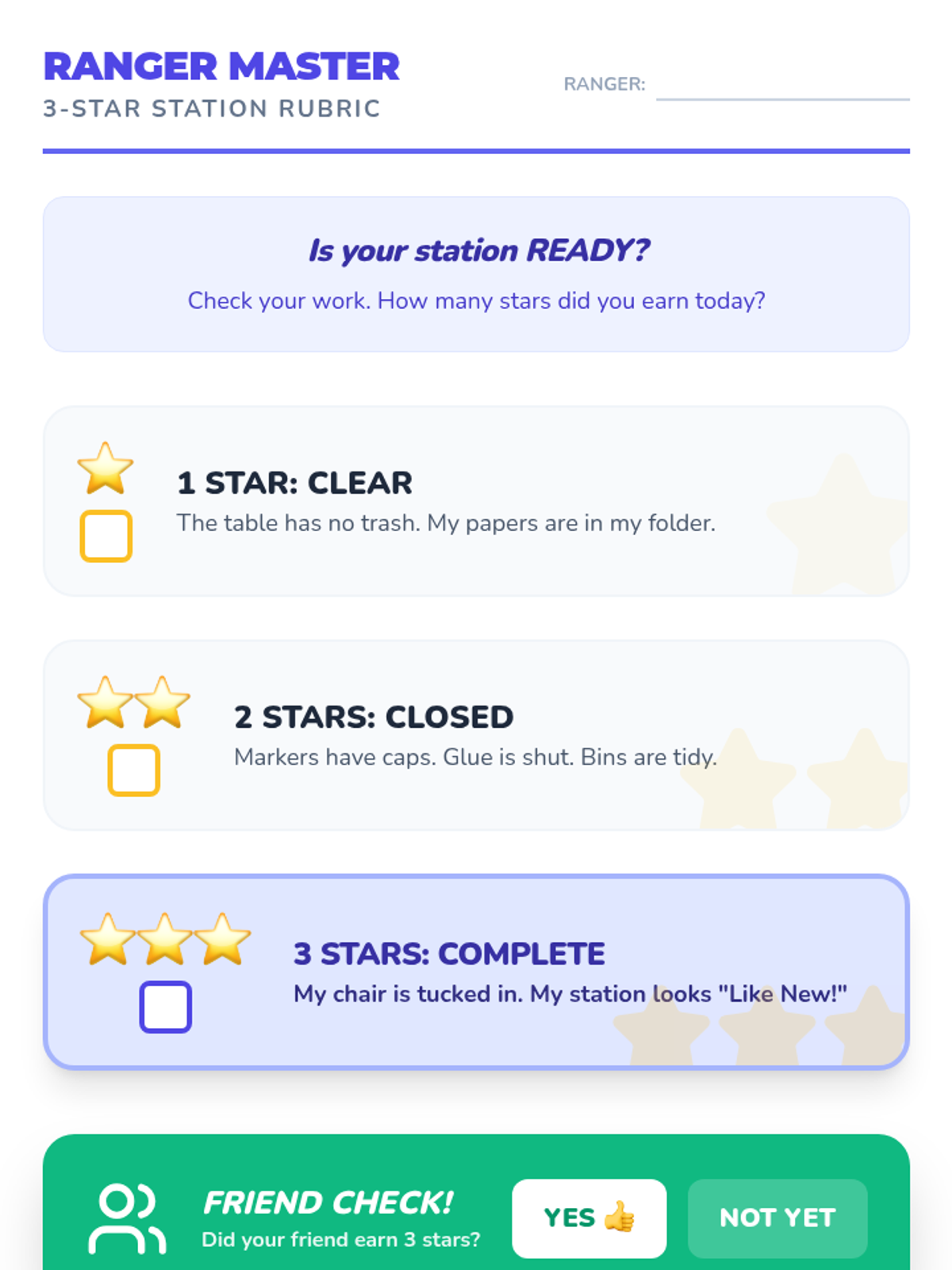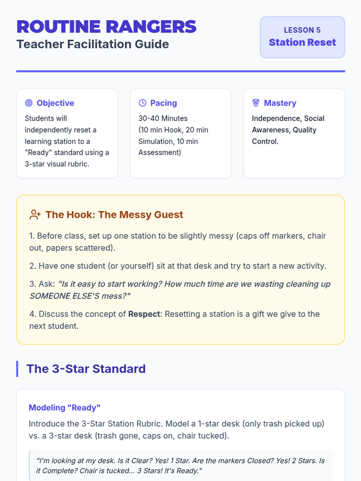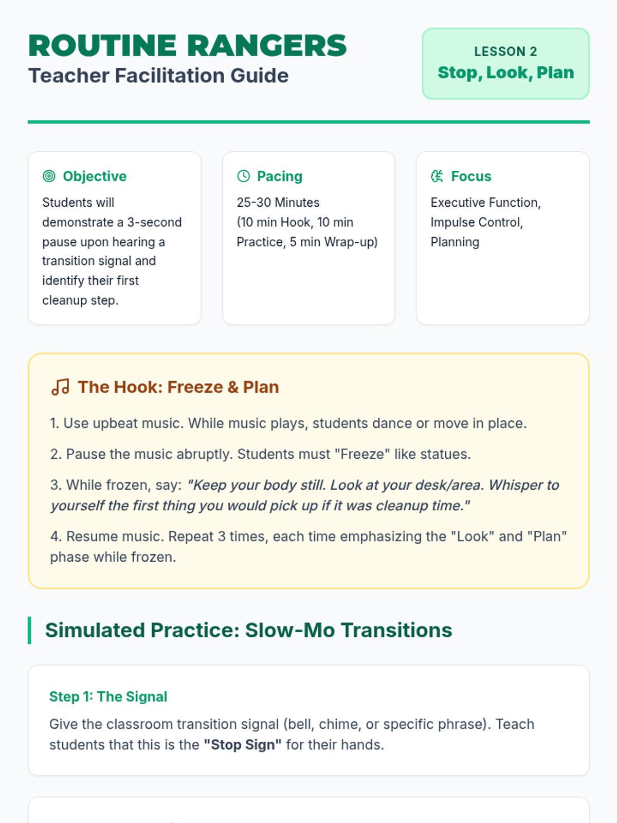 A 1st-grade special education sequence focused on physical organization and transition routines. Students learn to use visual schedules, planning techniques, checklists, and timers to gain independence during classroom cleanup.