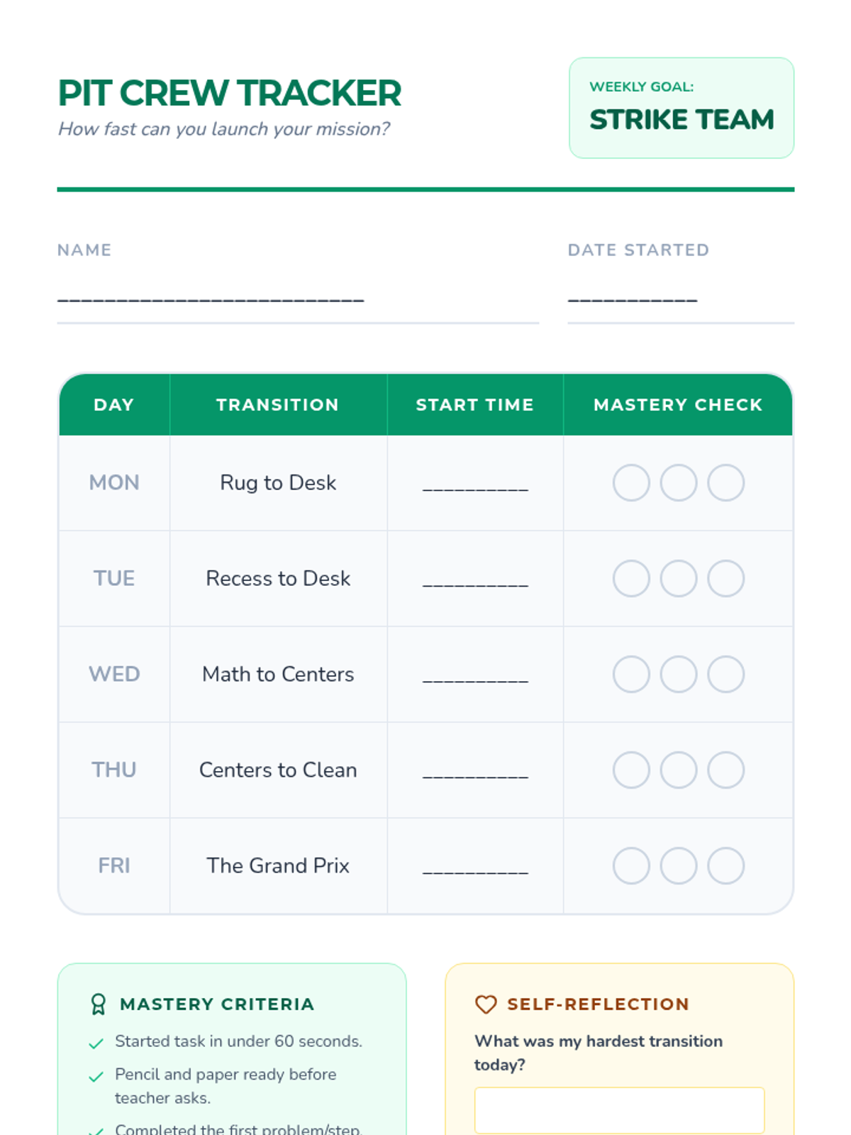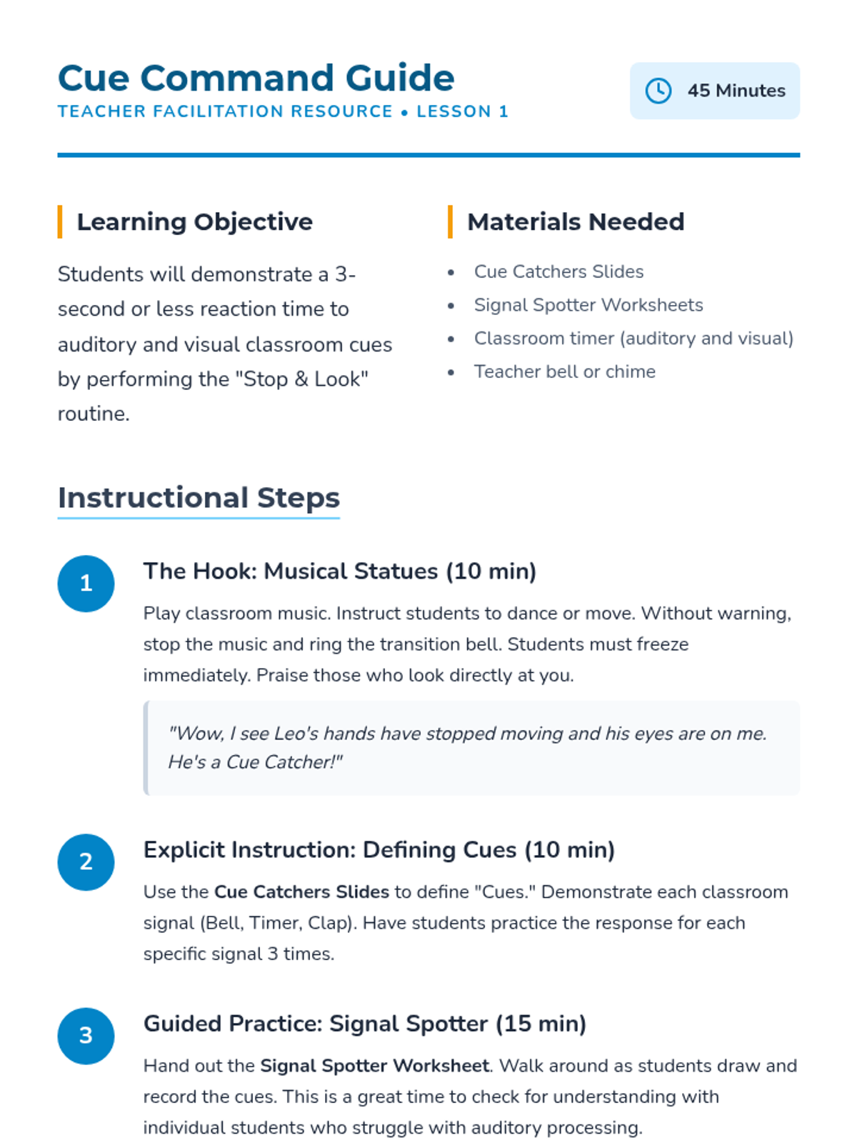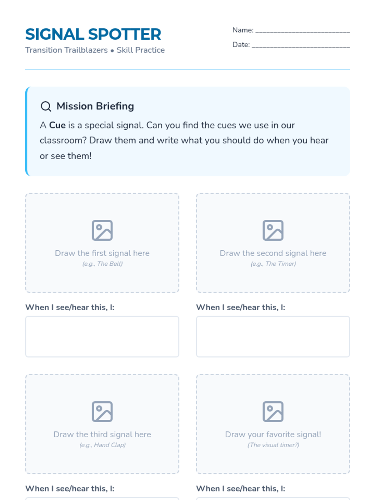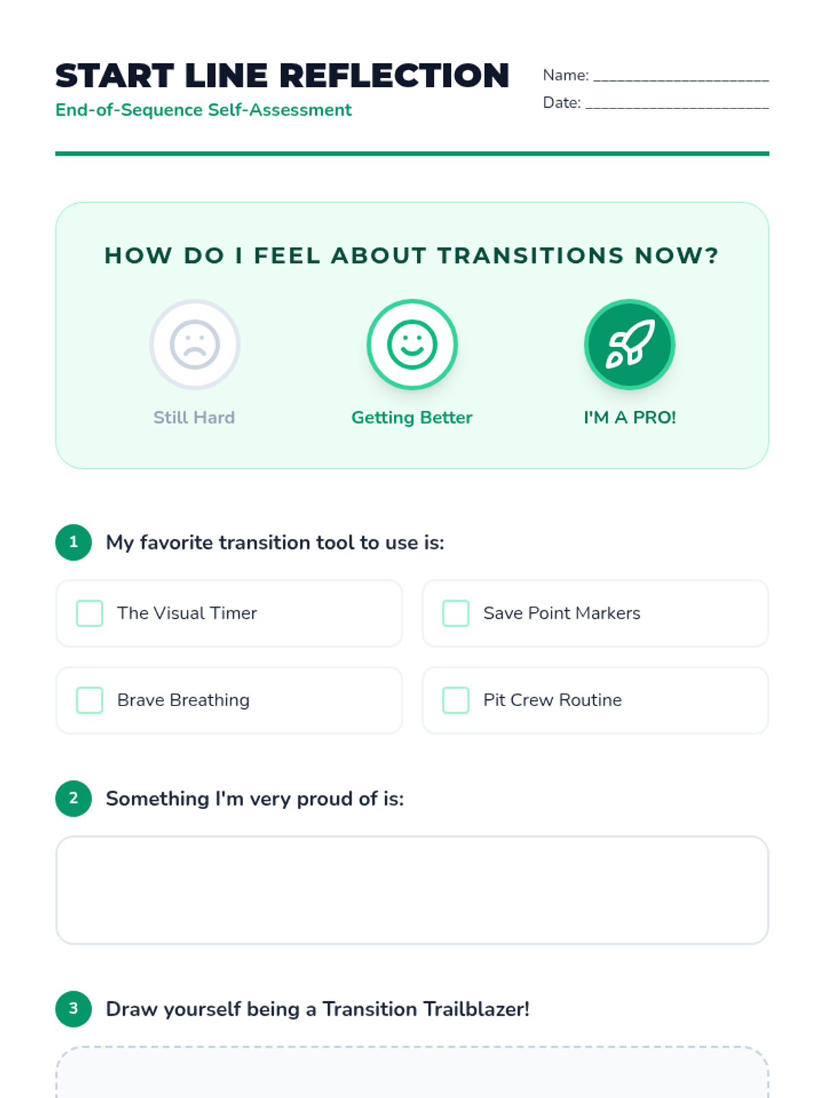 This sequence teaches 3rd-grade students with executive functioning challenges how to navigate transitions using visual schedules, timers, and cognitive shifting strategies. Students progress from recognizing signals to emotional regulation and immediate task initiation.