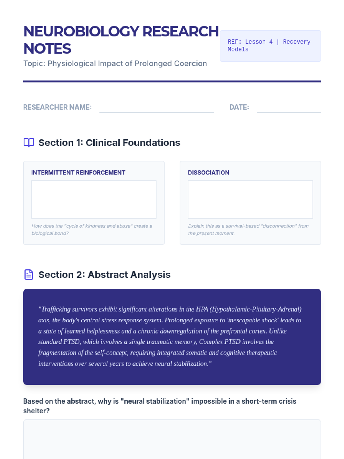 A comprehensive unit for undergraduate students focusing on the aftermath of human trafficking. Students explore trauma-informed care, legal advocacy for survivors, ethical storytelling, the neurological impacts of trauma, and community-based action planning to support recovery and reintegration.