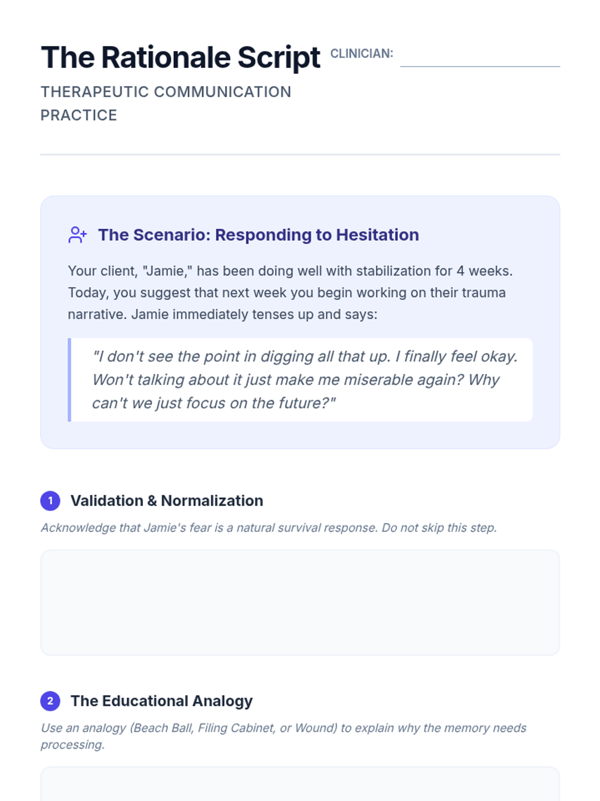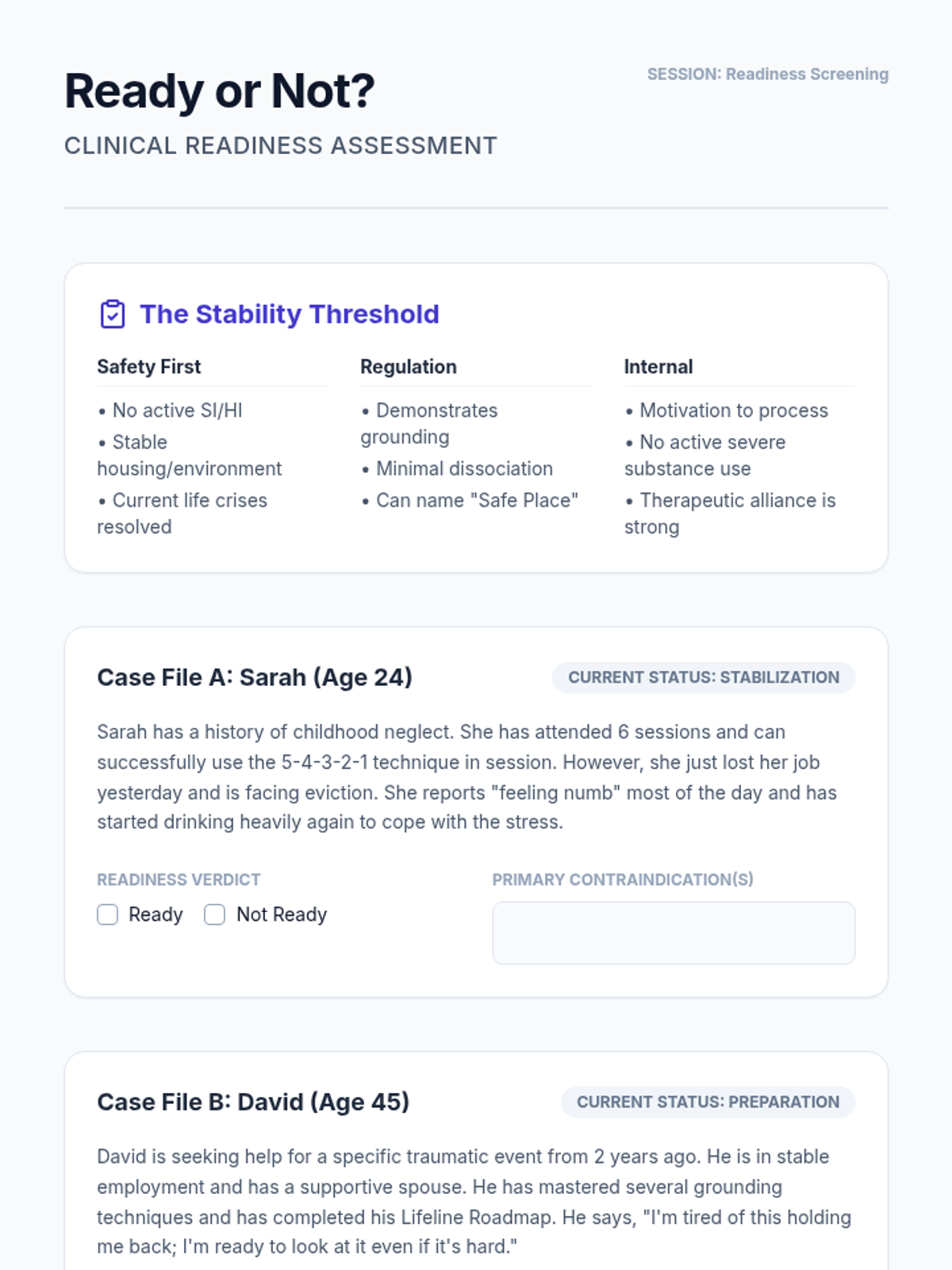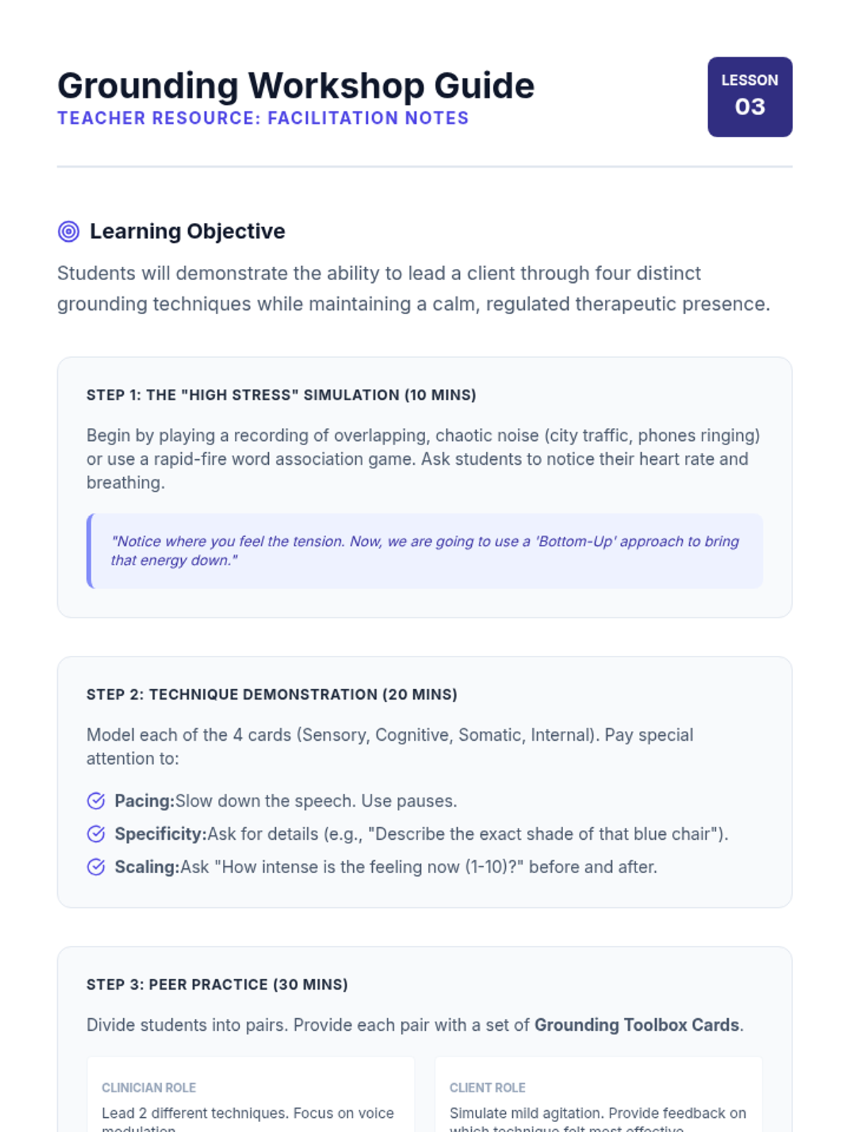 This sequence provides undergraduate students with the foundational knowledge and clinical skills necessary to prepare clients for trauma narrative work. It covers the neurobiology of traumatic memory, client stabilization techniques, and the ethical/practical assessment of client readiness.