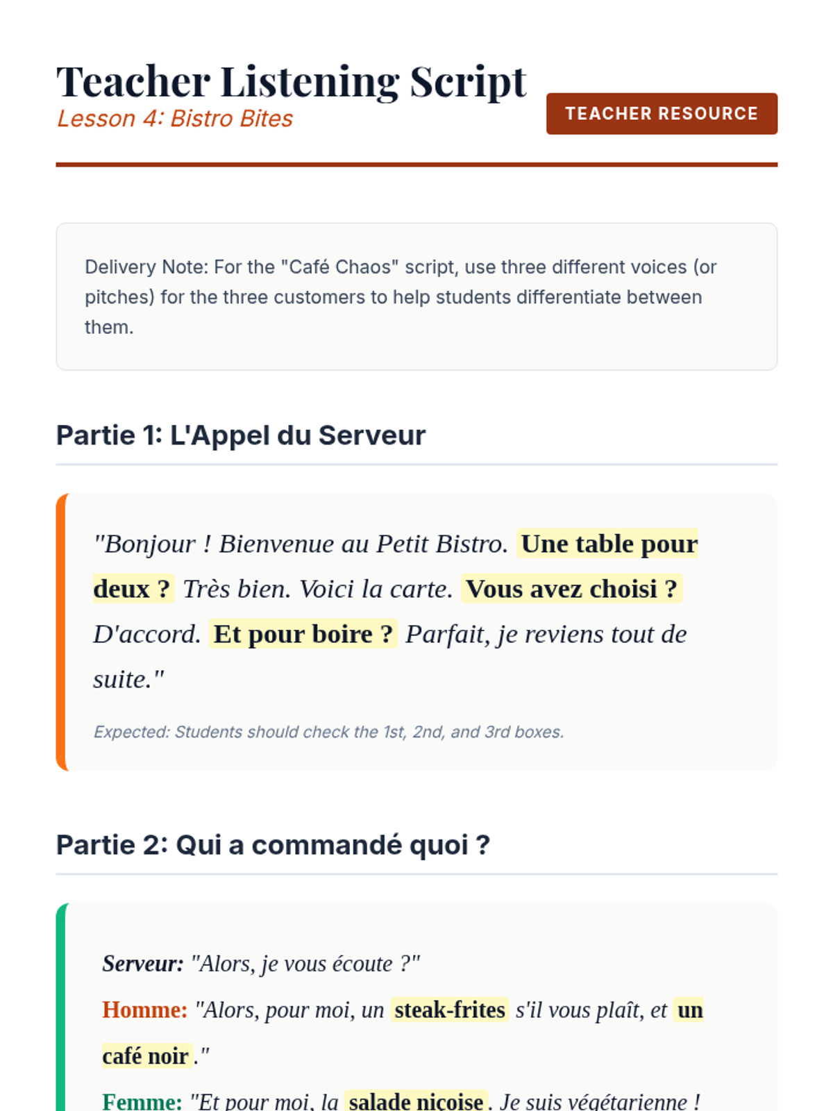 An immersive 9th-grade French sequence focused on 'survival listening'. Students navigate real-world travel scenarios including transportation, dining, and shopping, learning to extract essential data from spoken French.