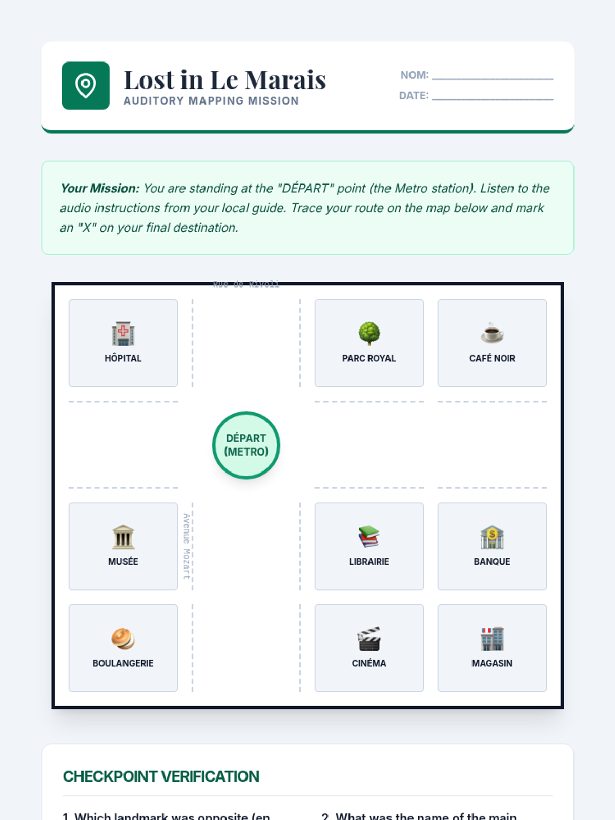 An inquiry-based French listening sequence for beginners focusing on functional navigation of public spaces in Francophone cities. Students learn to filter essential information from ambient noise in transport, weather, street directions, retail, and emergency contexts.