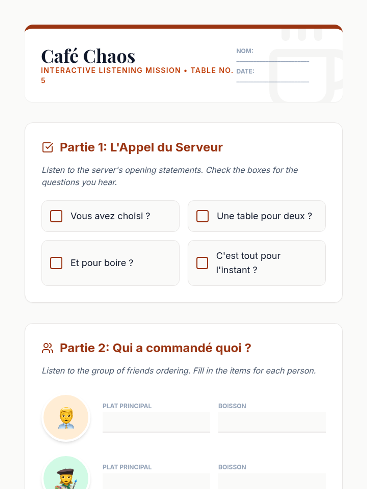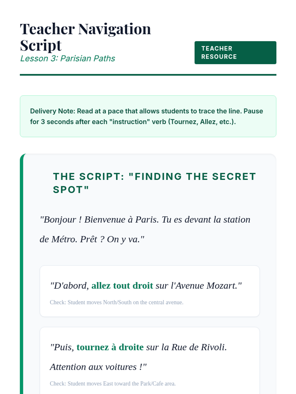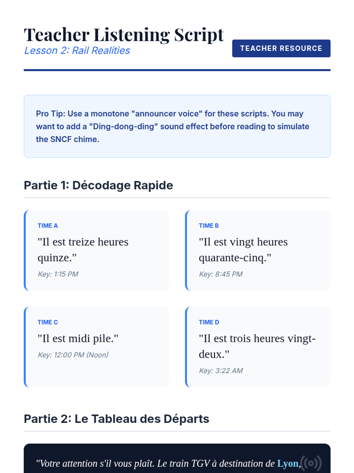 A high-stakes travel simulation building French listening proficiency in logistics: numbers, time, prices, and directions. Students navigate virtual 'survival' scenarios where accurate information processing is the key to a successful journey.