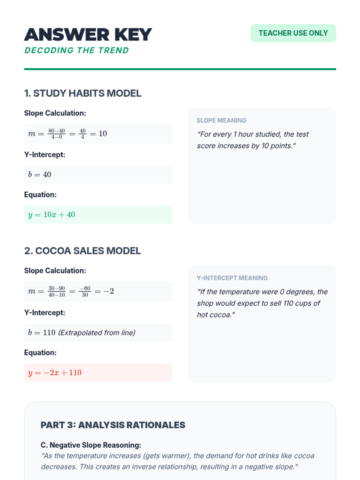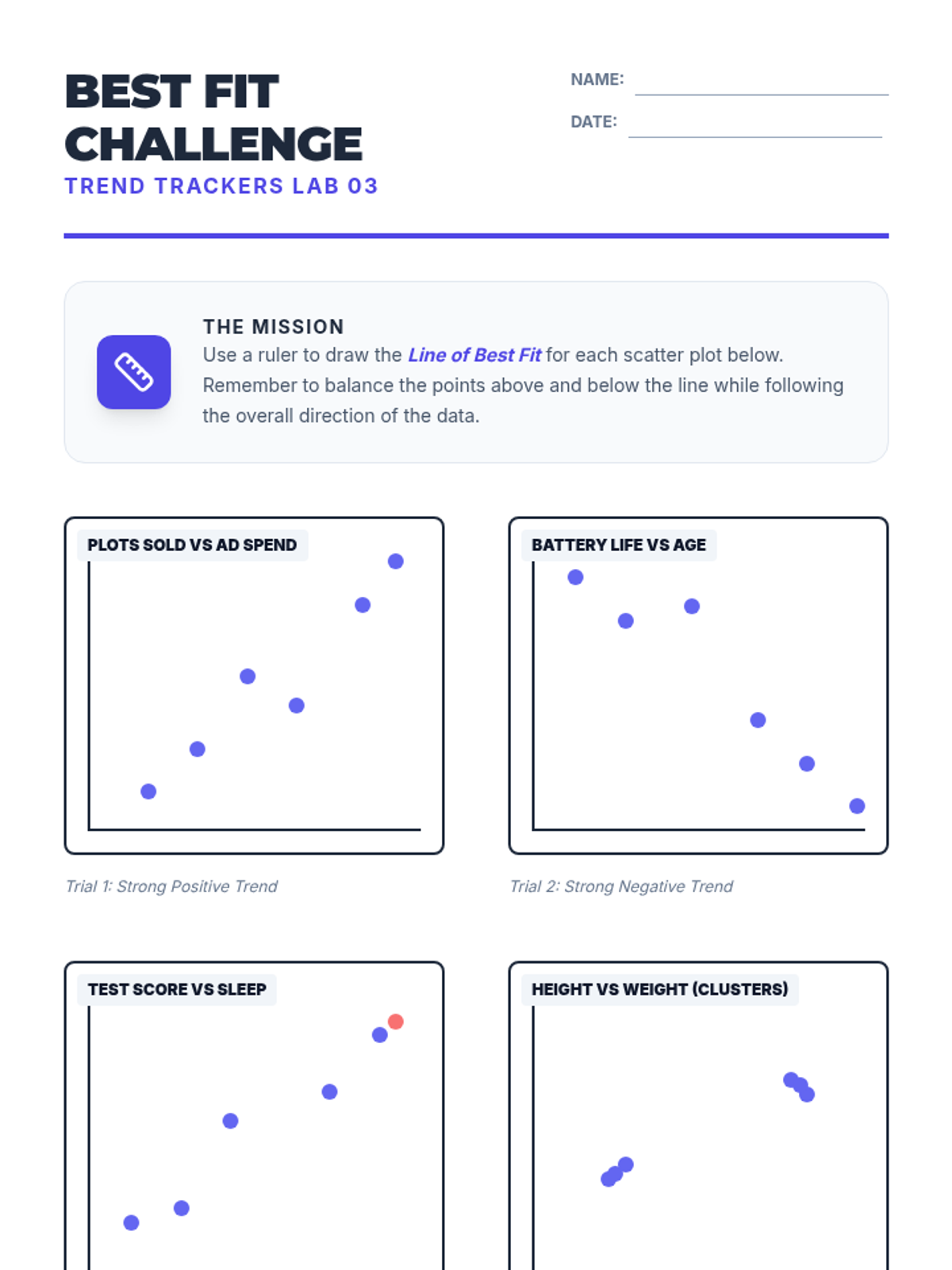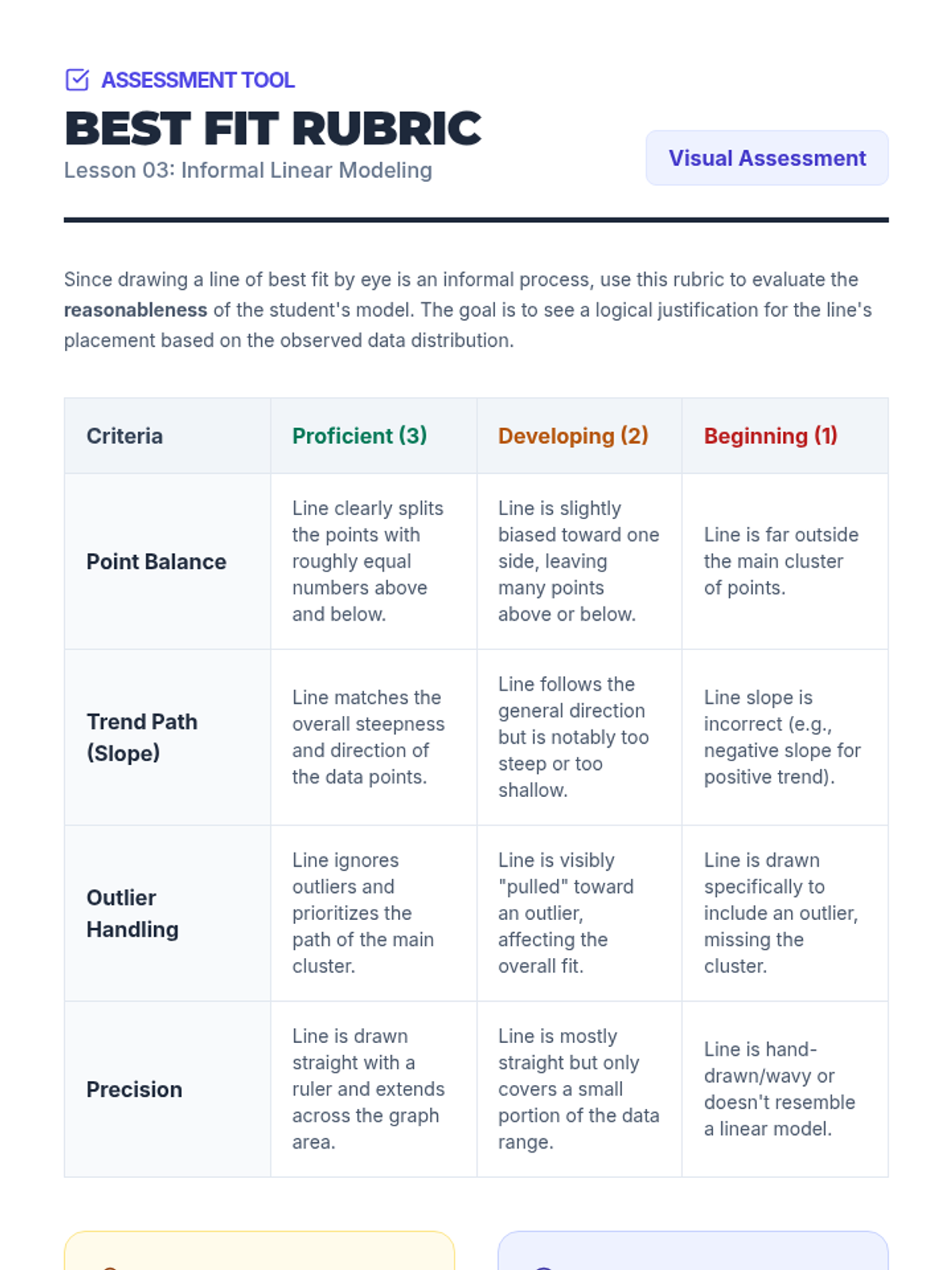 This sequence guides 8th-grade students through constructing scatter plots, identifying patterns of association, modeling trends with linear equations, and interpreting data in context while distinguishing correlation from causation.
