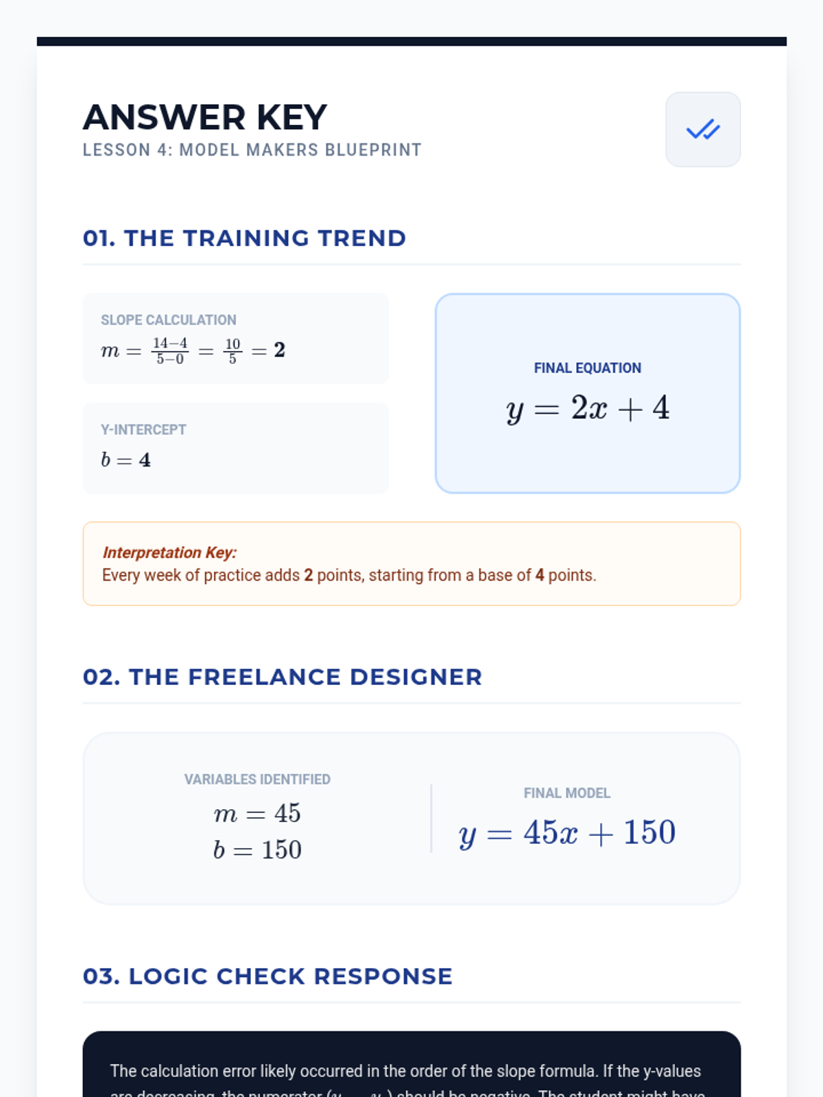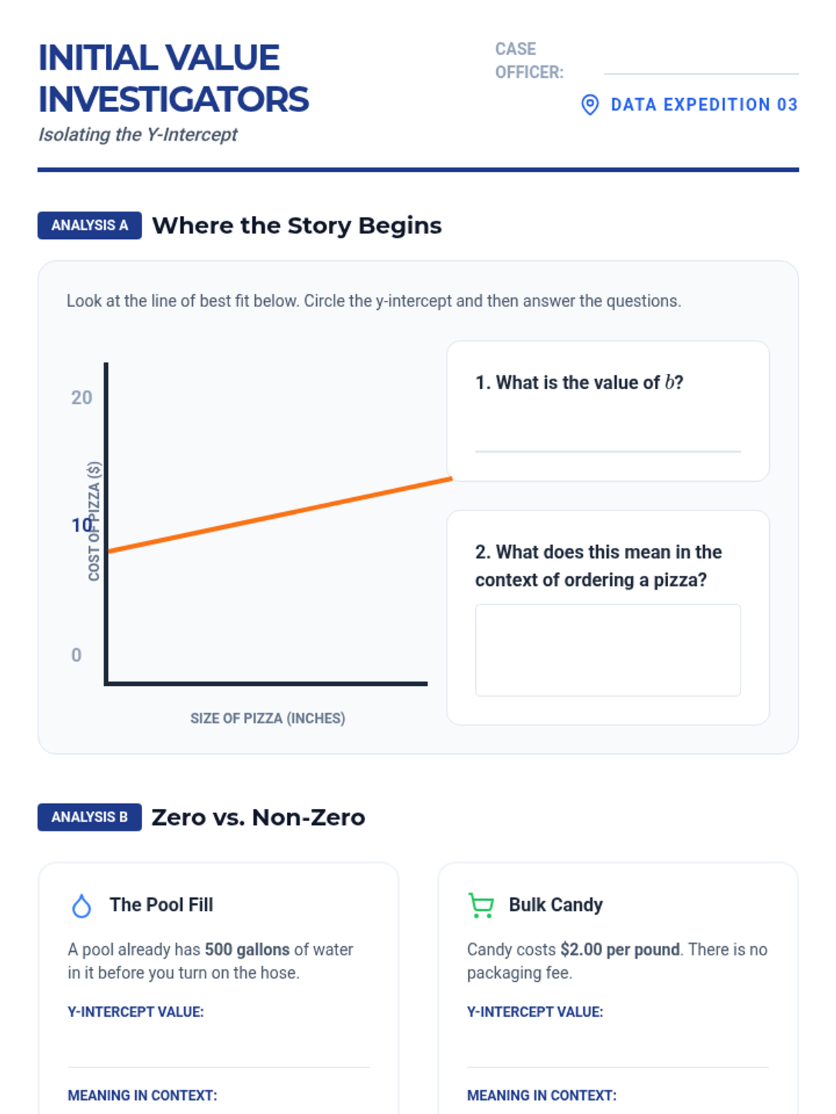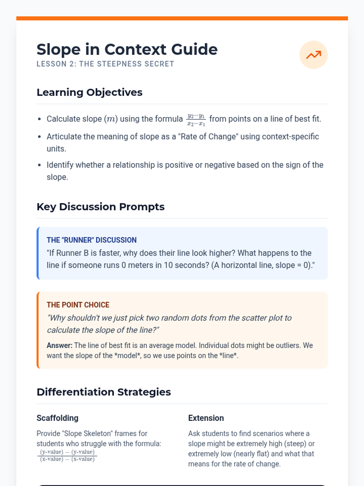 A comprehensive 5-lesson unit for 8th-grade students on interpreting linear models. Students progress from drawing lines of best fit to calculating slope and y-intercept in context, culminating in writing full equations and making predictions through interpolation and extrapolation.
