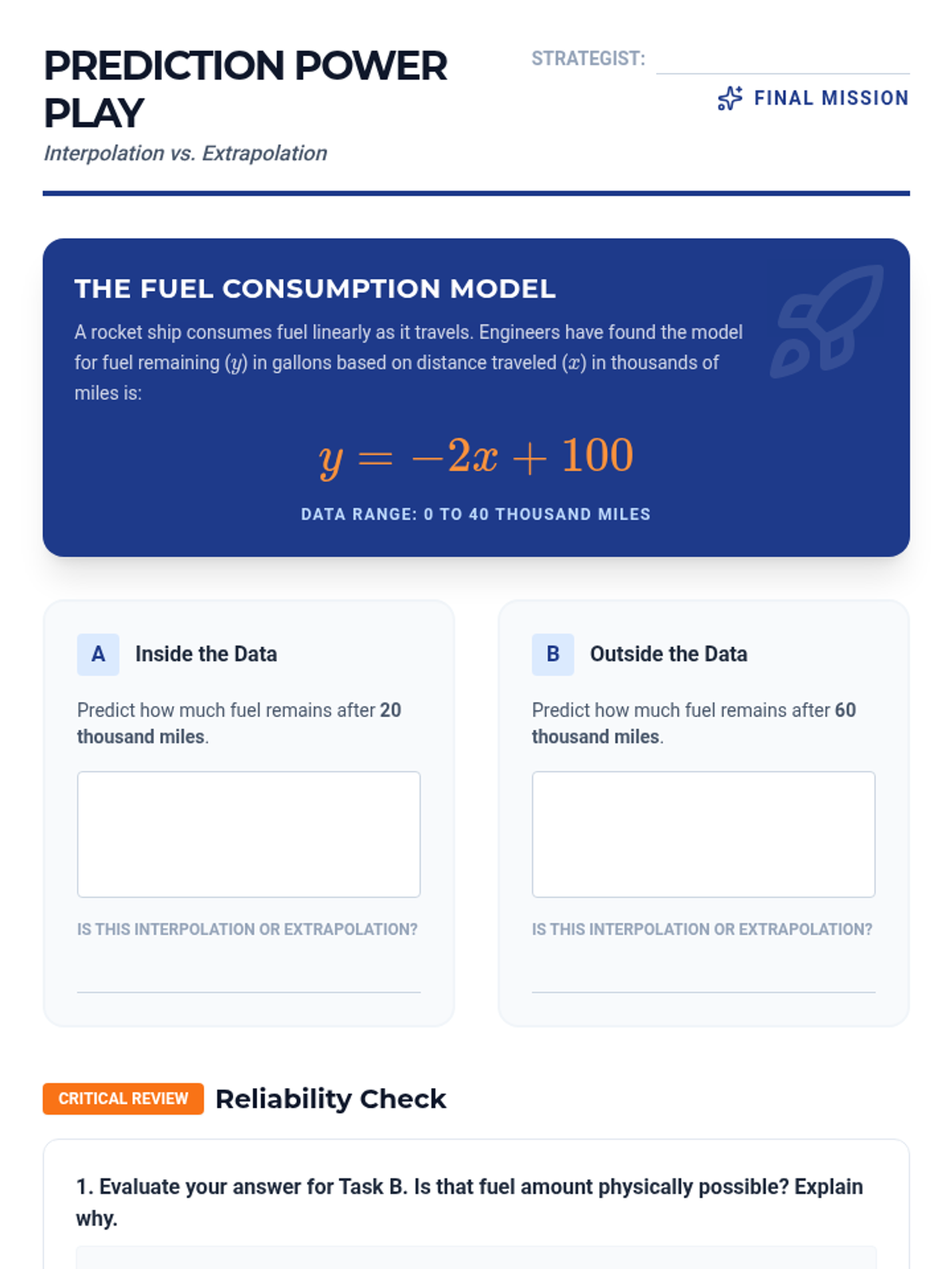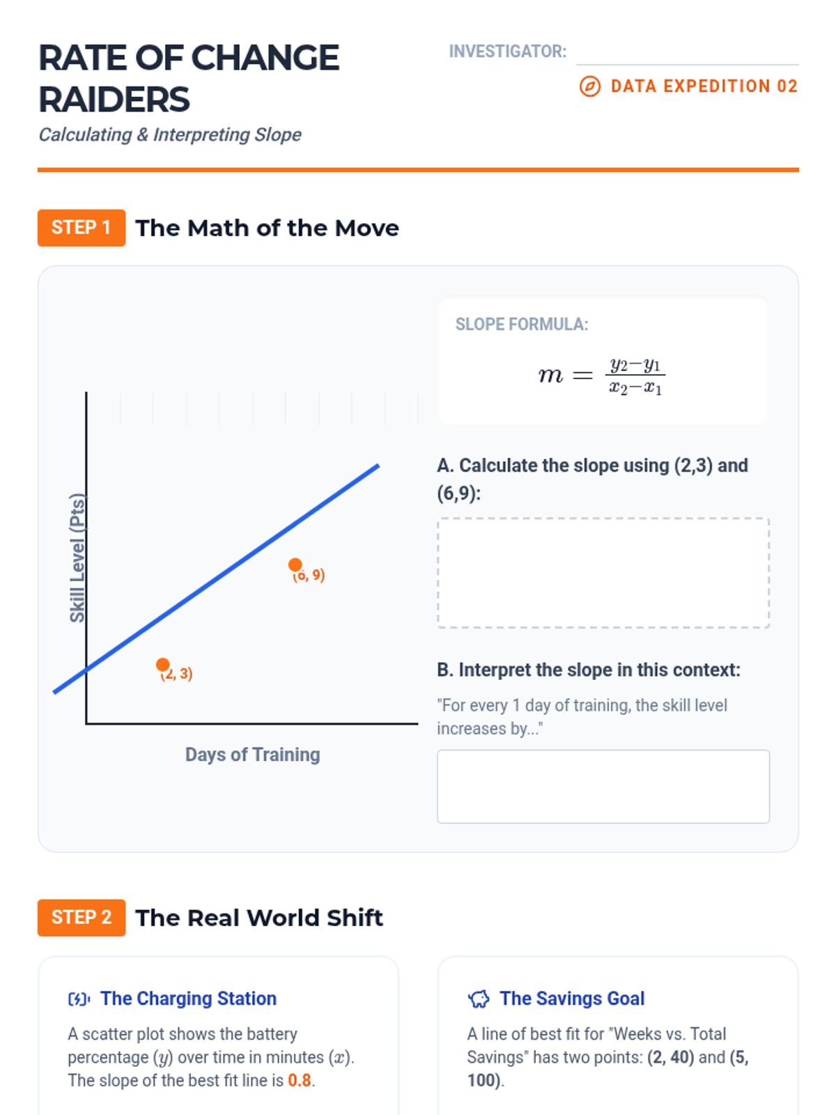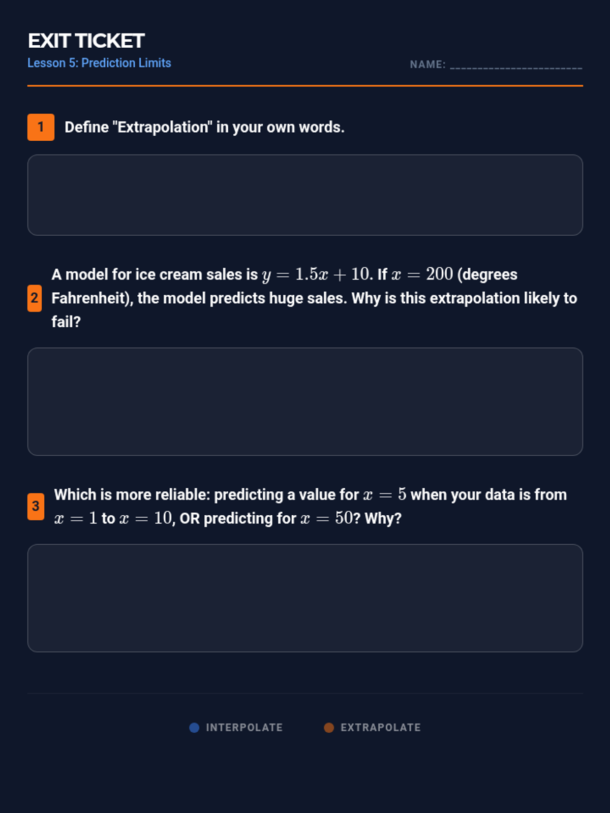 A comprehensive 5-lesson unit for 8th-grade students on interpreting linear models. Students progress from drawing lines of best fit to calculating slope and y-intercept in context, culminating in writing full equations and making predictions through interpolation and extrapolation.