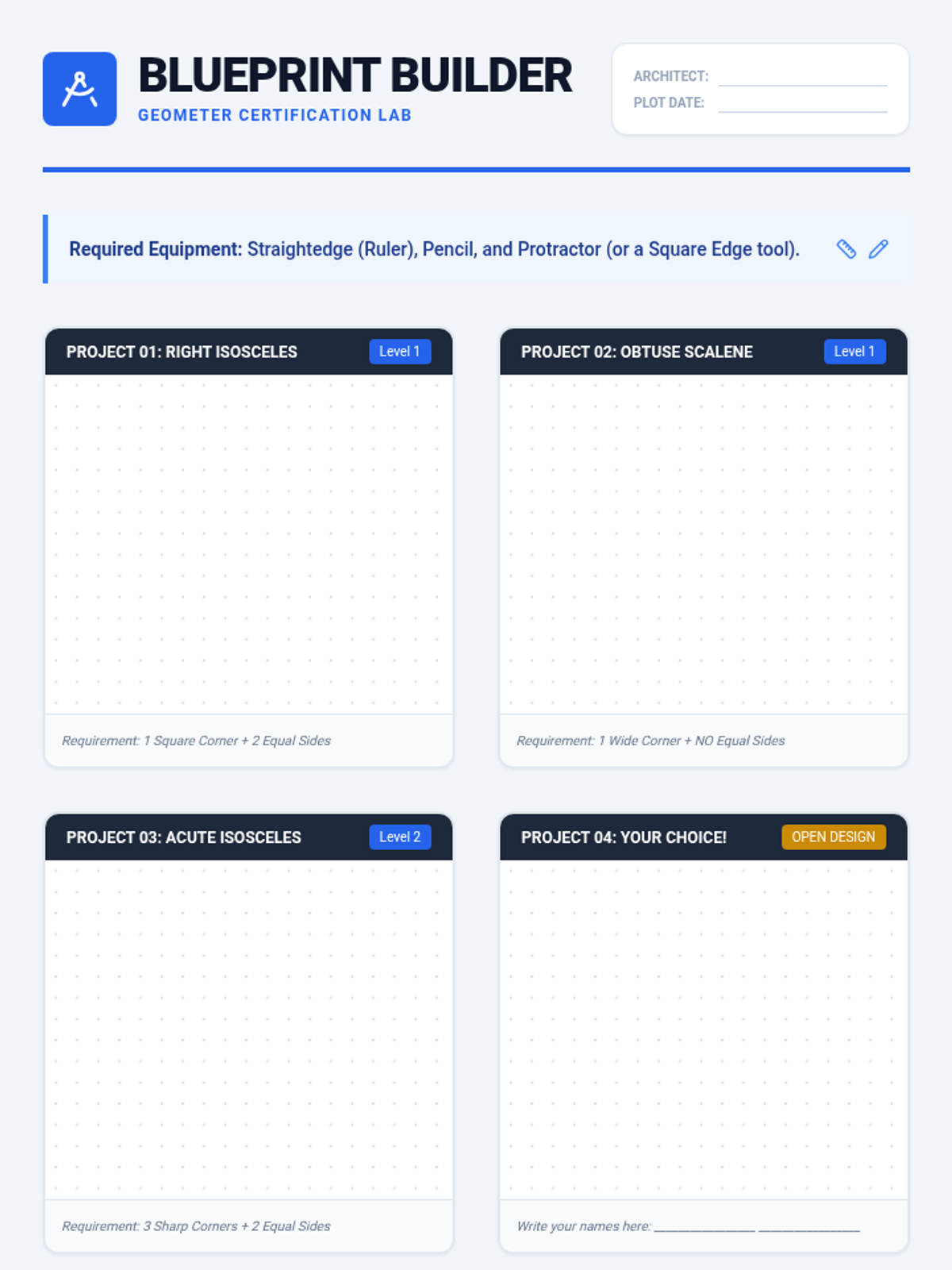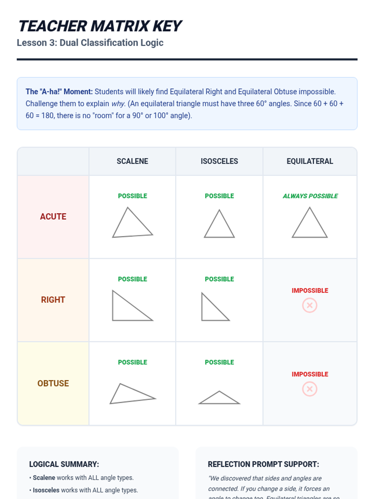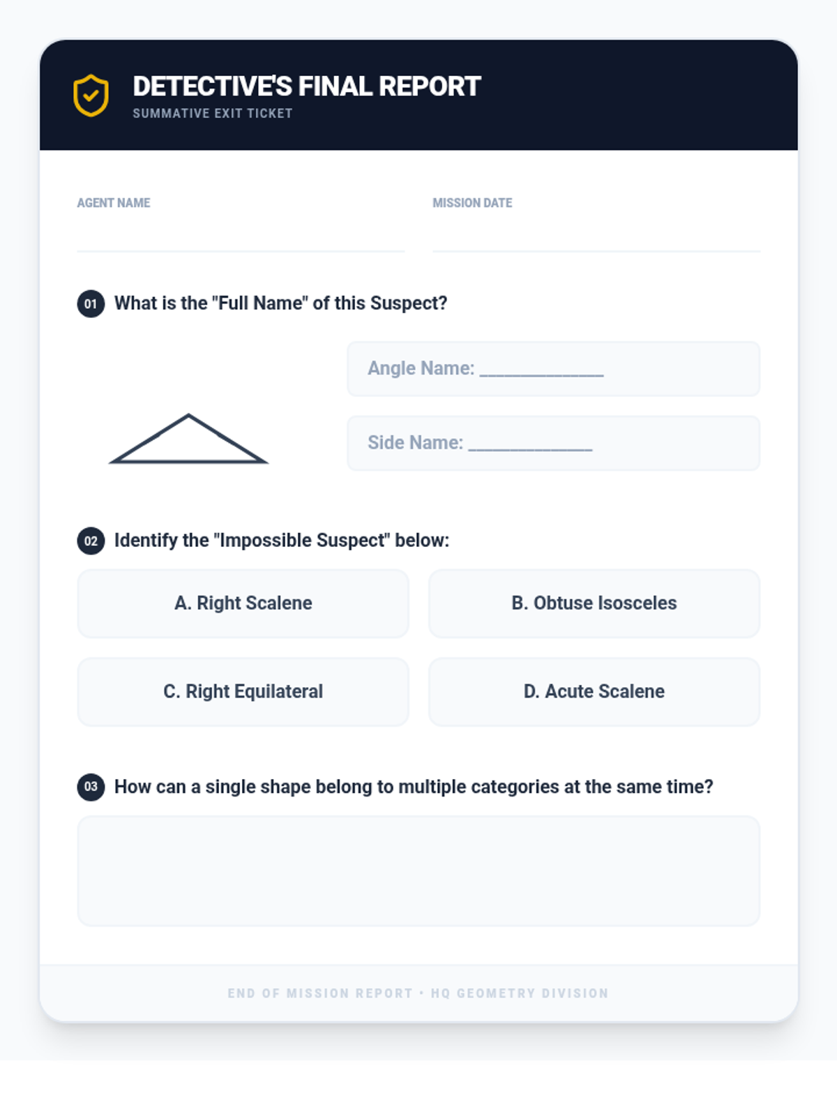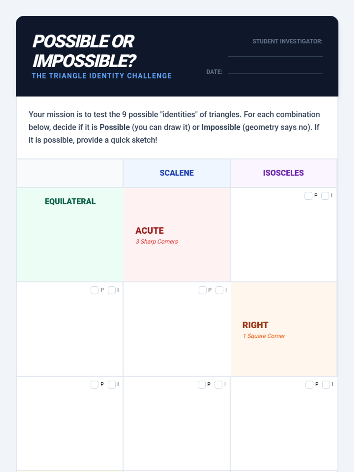 This sequence guides 4th-grade students through the rigorous classification of triangles by both angle measure (acute, right, obtuse) and side length (equilateral, isosceles, scalene). Students progress from simple sorting to dual-property categorization and construction, culminating in a deductive reasoning 'detective' challenge.