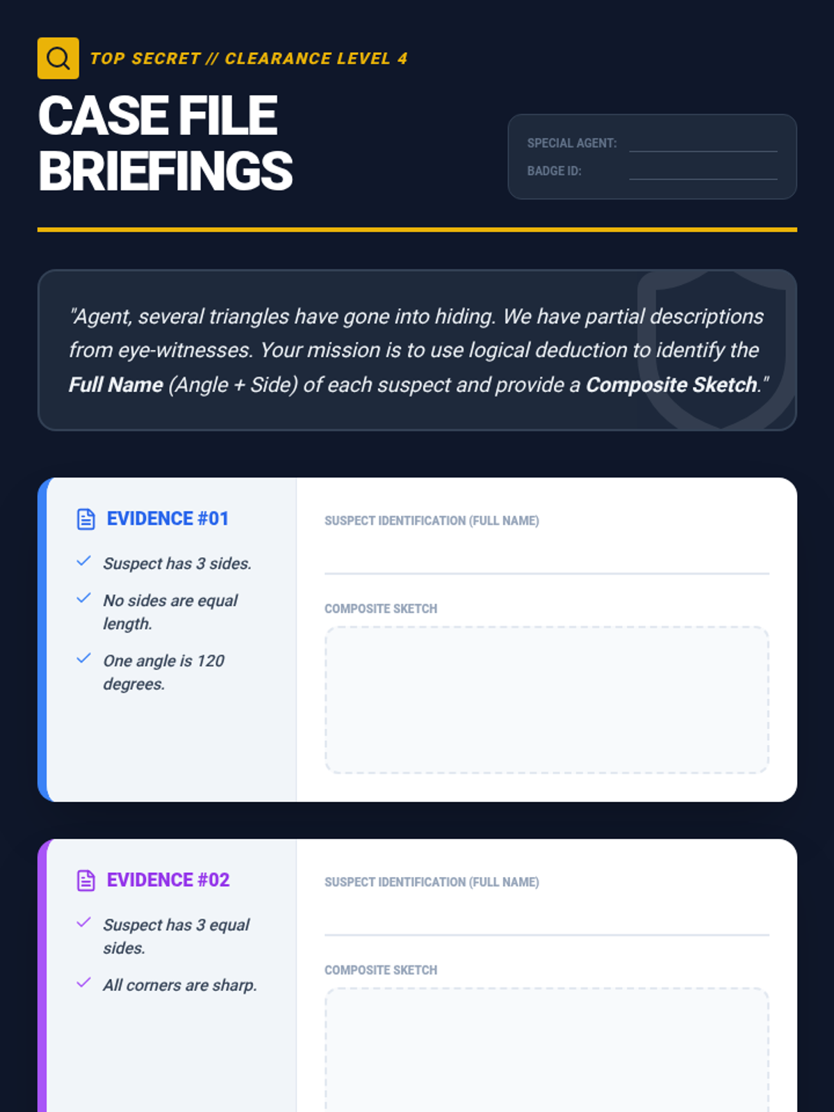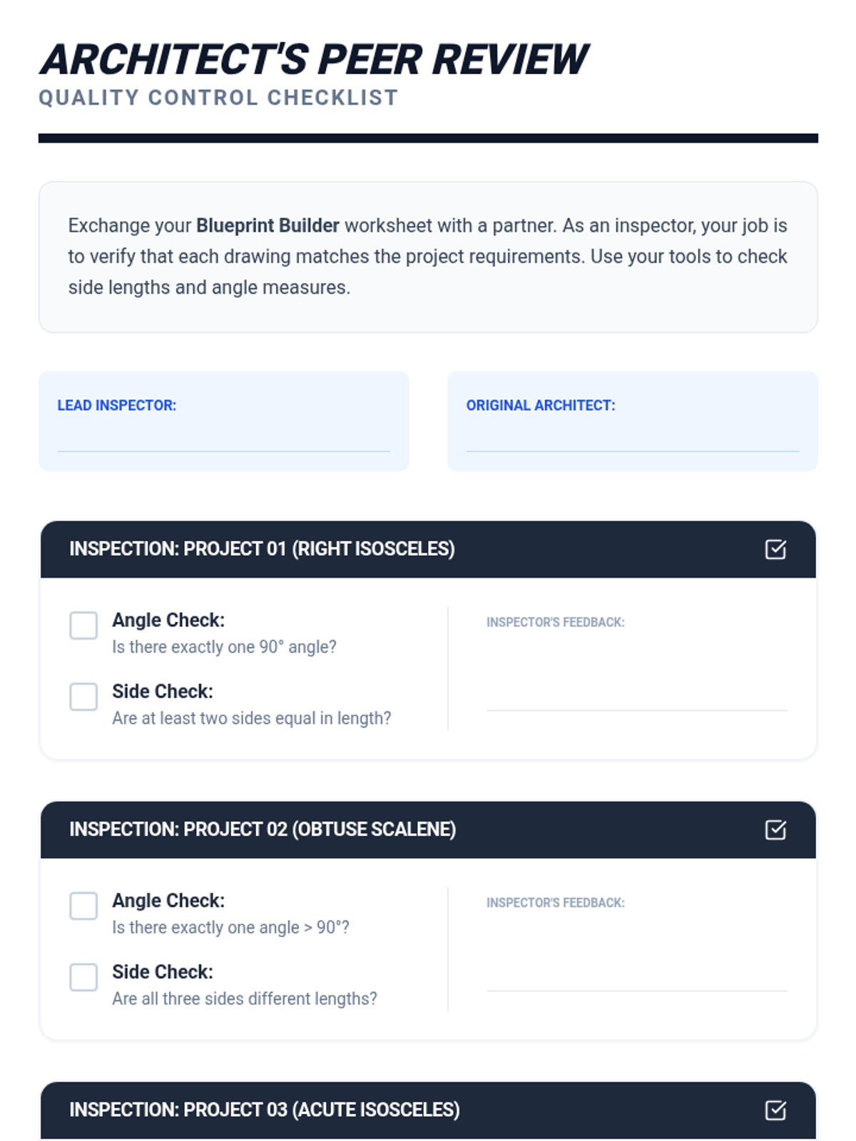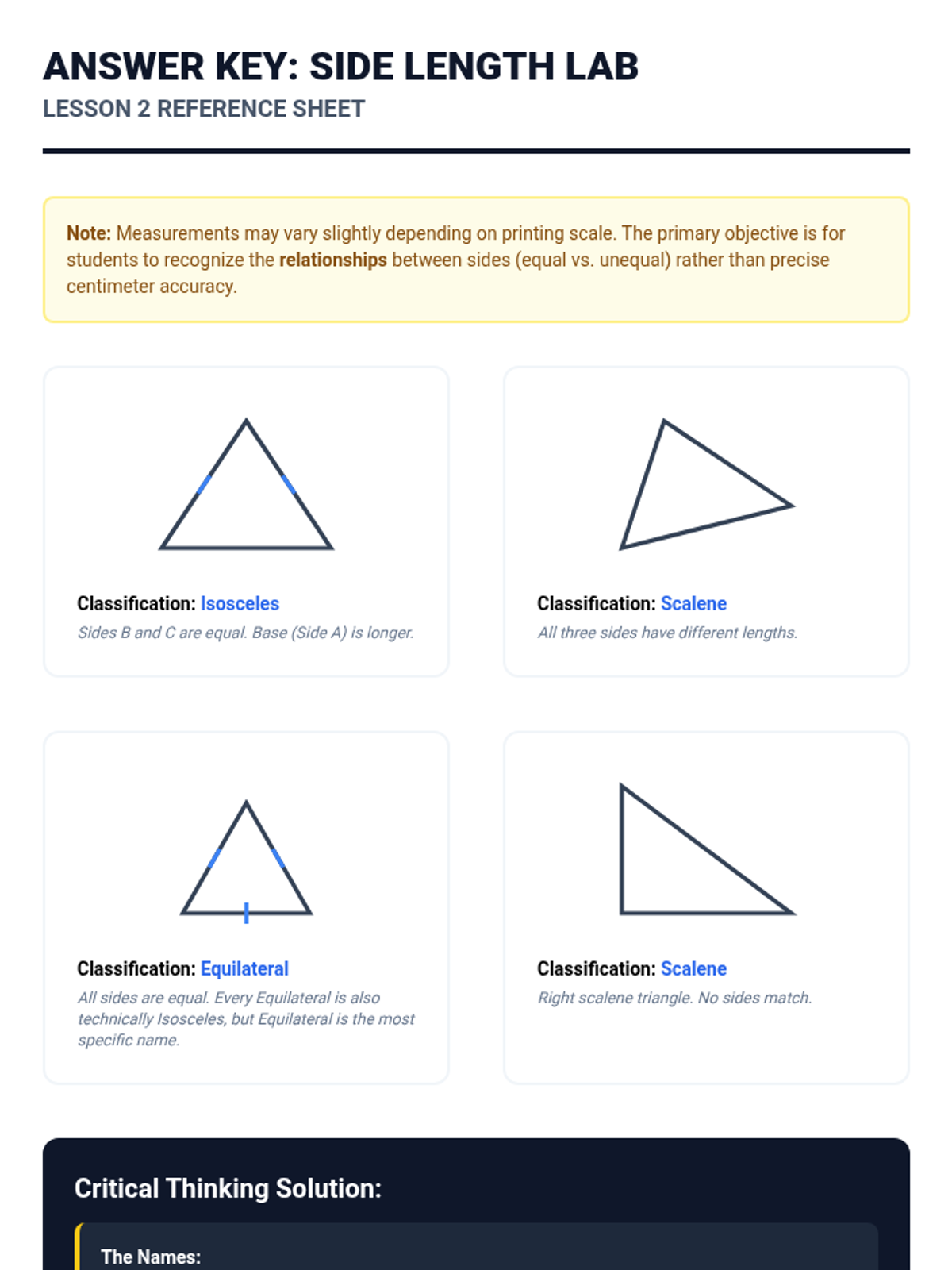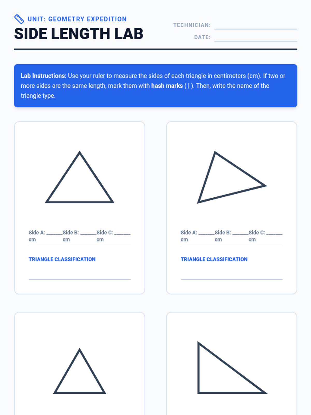 This sequence guides 4th-grade students through the rigorous classification of triangles by both angle measure (acute, right, obtuse) and side length (equilateral, isosceles, scalene). Students progress from simple sorting to dual-property categorization and construction, culminating in a deductive reasoning 'detective' challenge.
