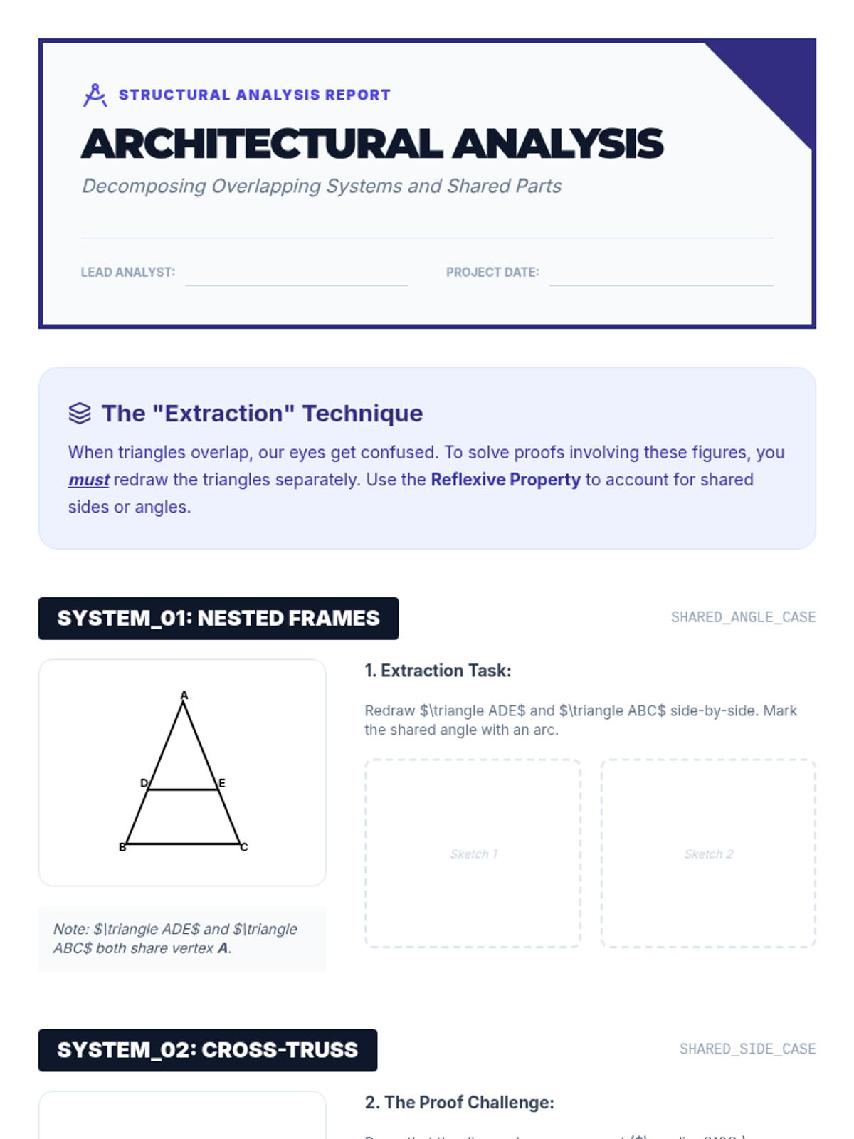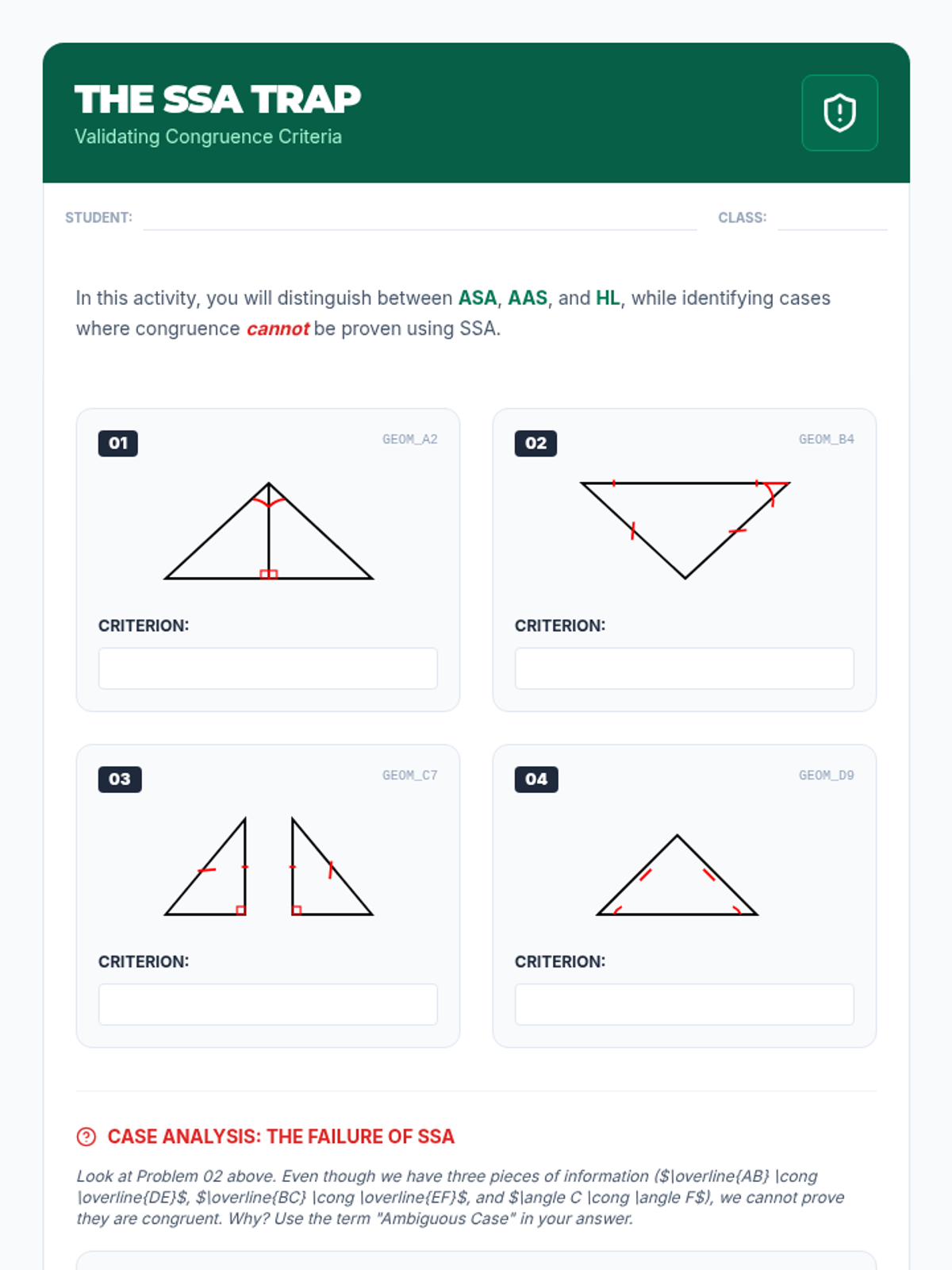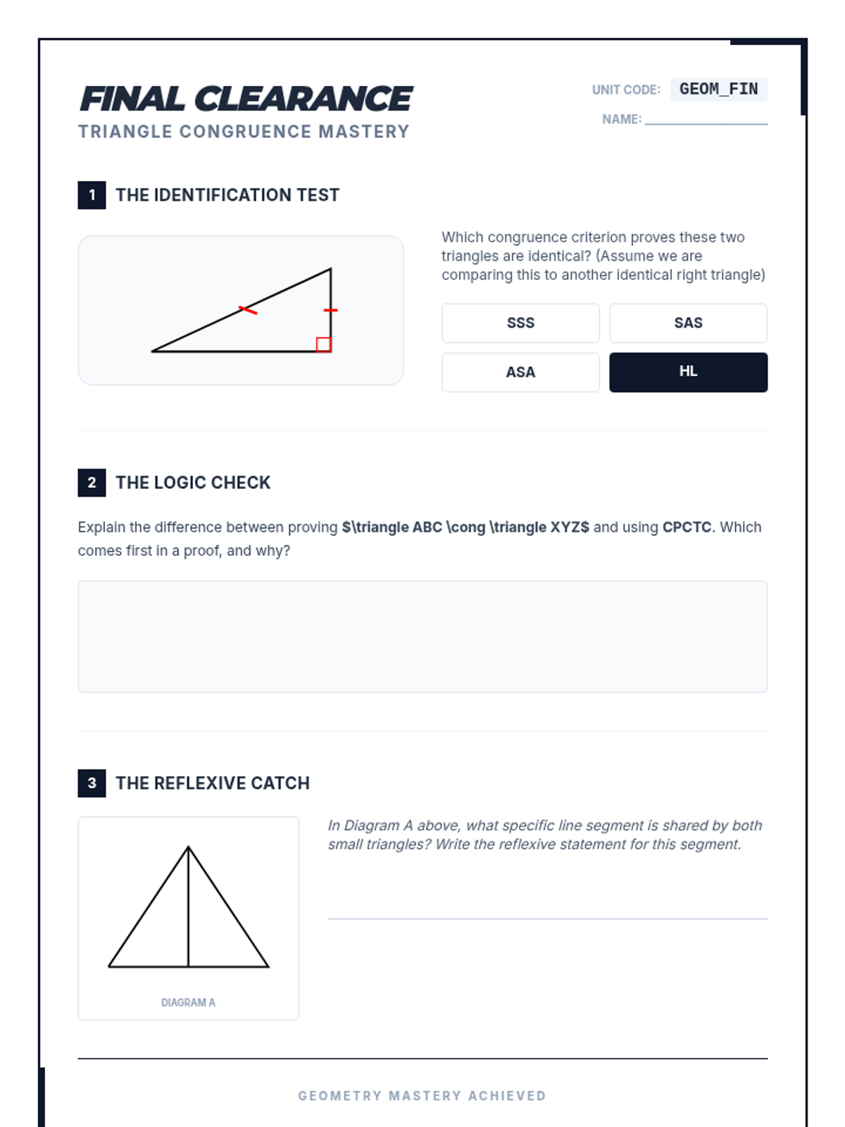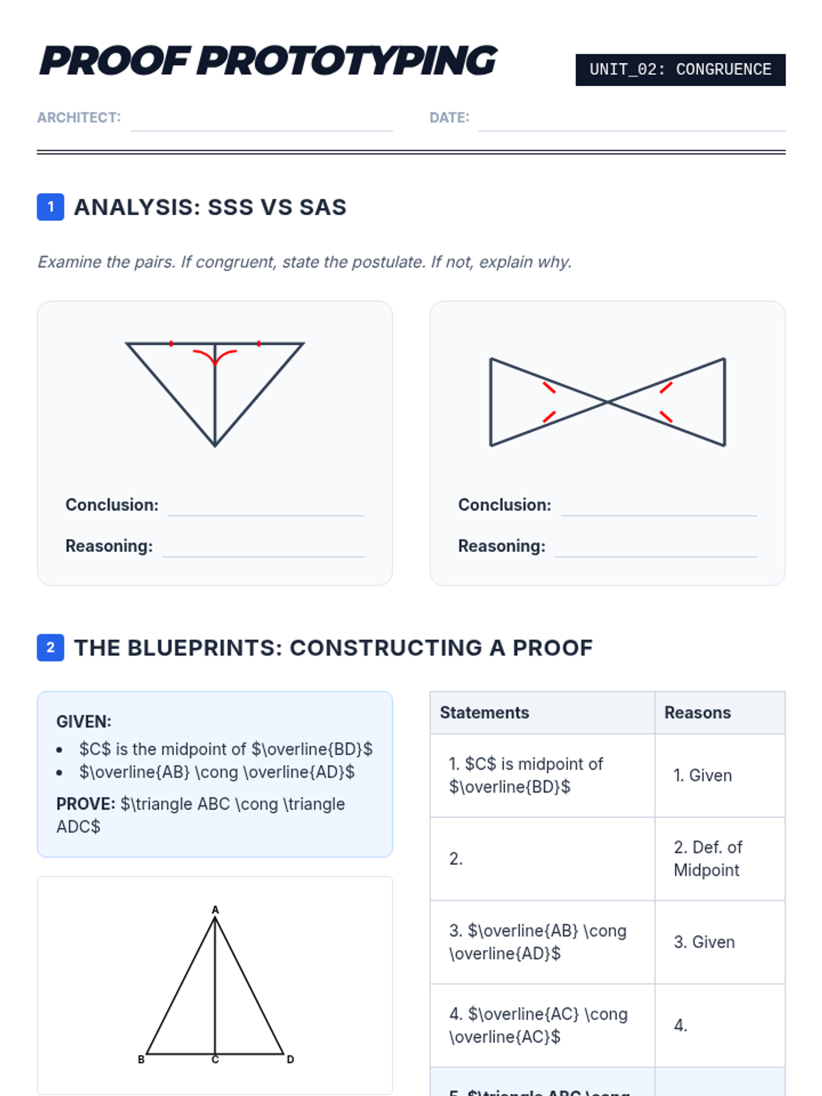 A comprehensive 10th-grade geometry sequence exploring triangle congruence through transformations, postulates, and rigorous multi-step proofs. Students move from physical manipulation to formal logical deduction, culminating in the analysis of complex, overlapping figures.