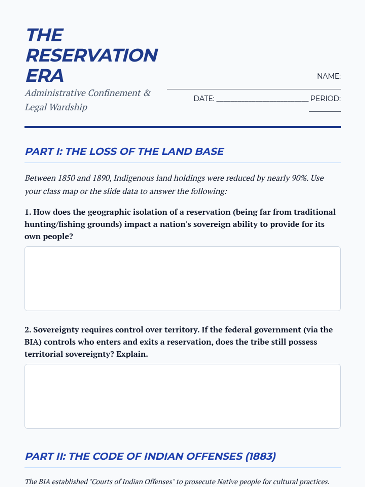 A comprehensive 12th-grade sequence exploring the legal history of tribal sovereignty in the United States, from foundational Supreme Court cases to the Indian Reorganization Act. Students analyze how federal policies shaped the legal status of Indigenous nations as 'domestic dependent nations.'