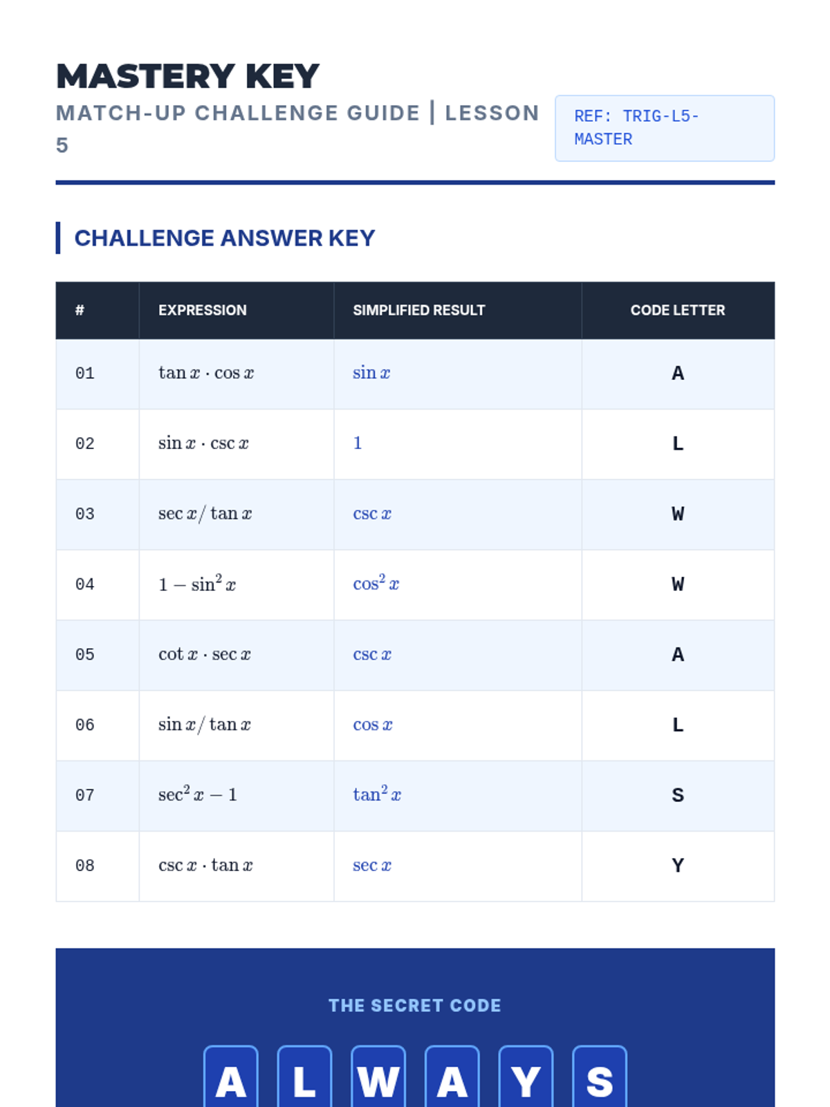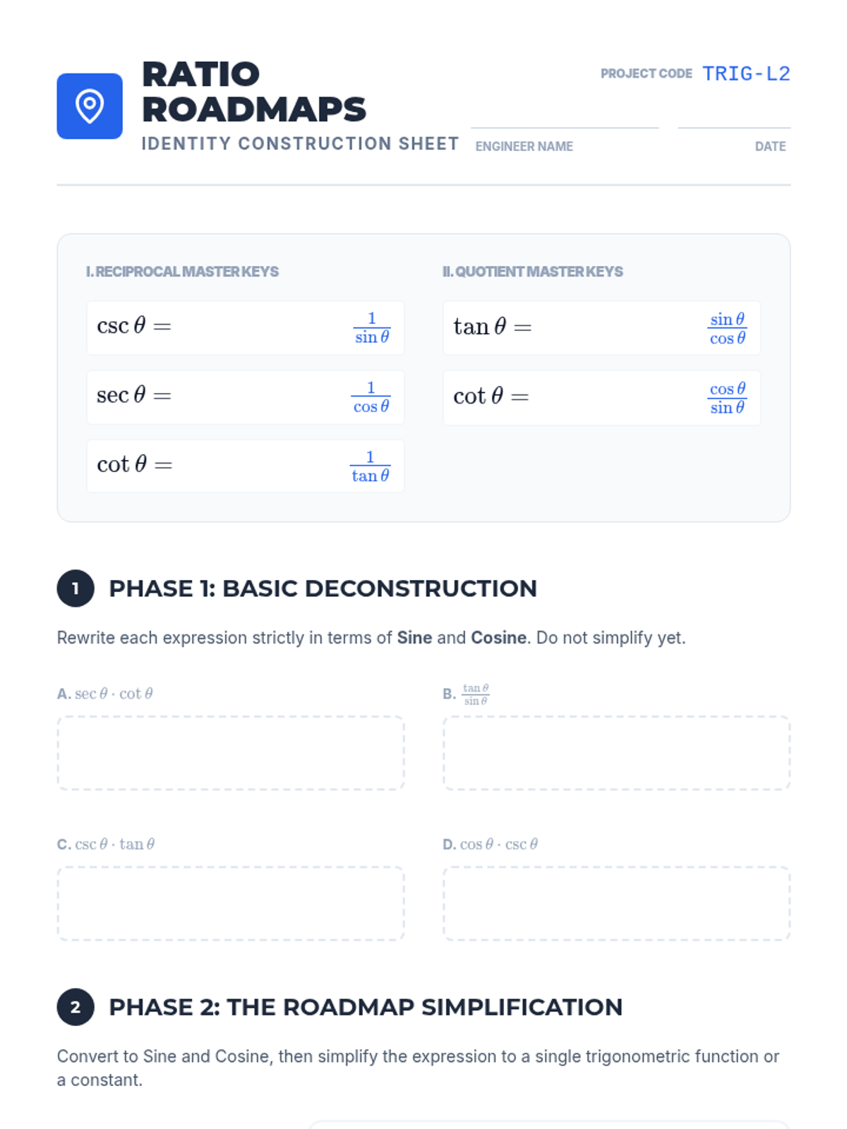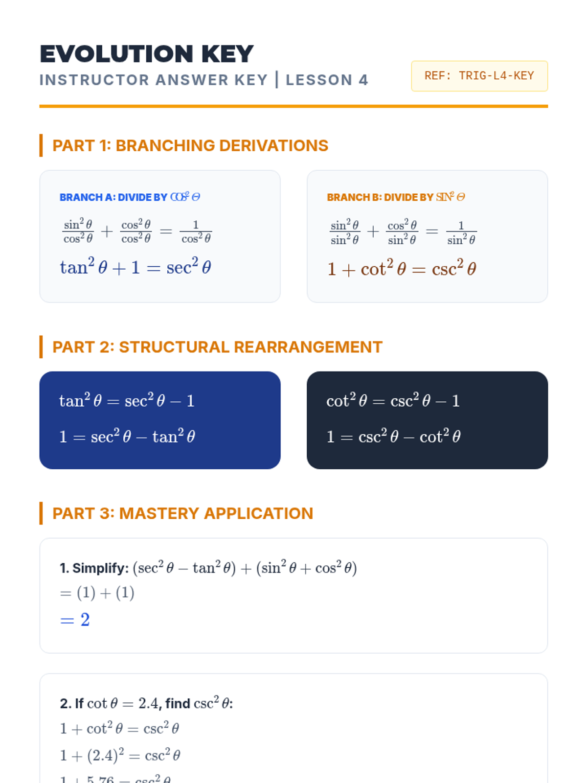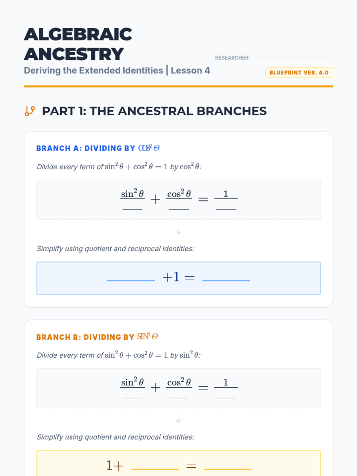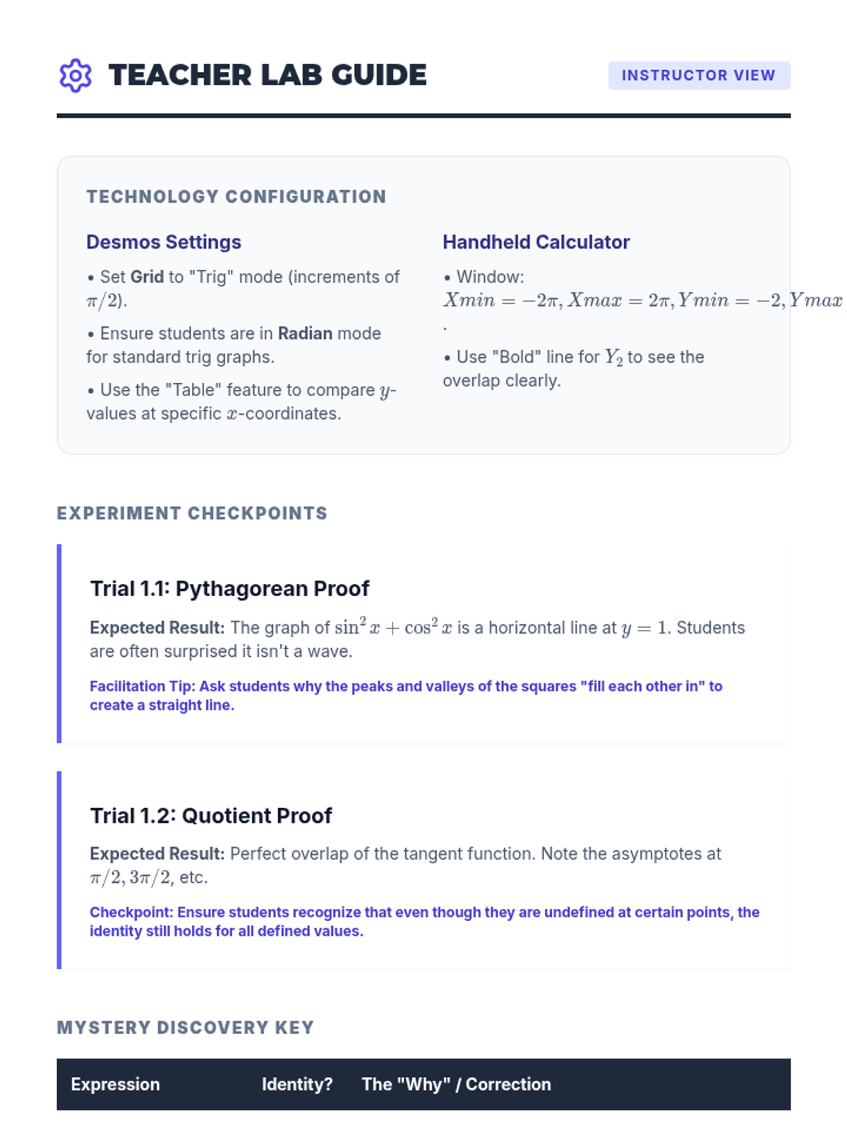 This inquiry-driven sequence connects the geometric definitions of the unit circle to algebraic trigonometric identities. Students derive Pythagorean, reciprocal, and quotient identities through visualization and algebraic proof to foster deep conceptual understanding.