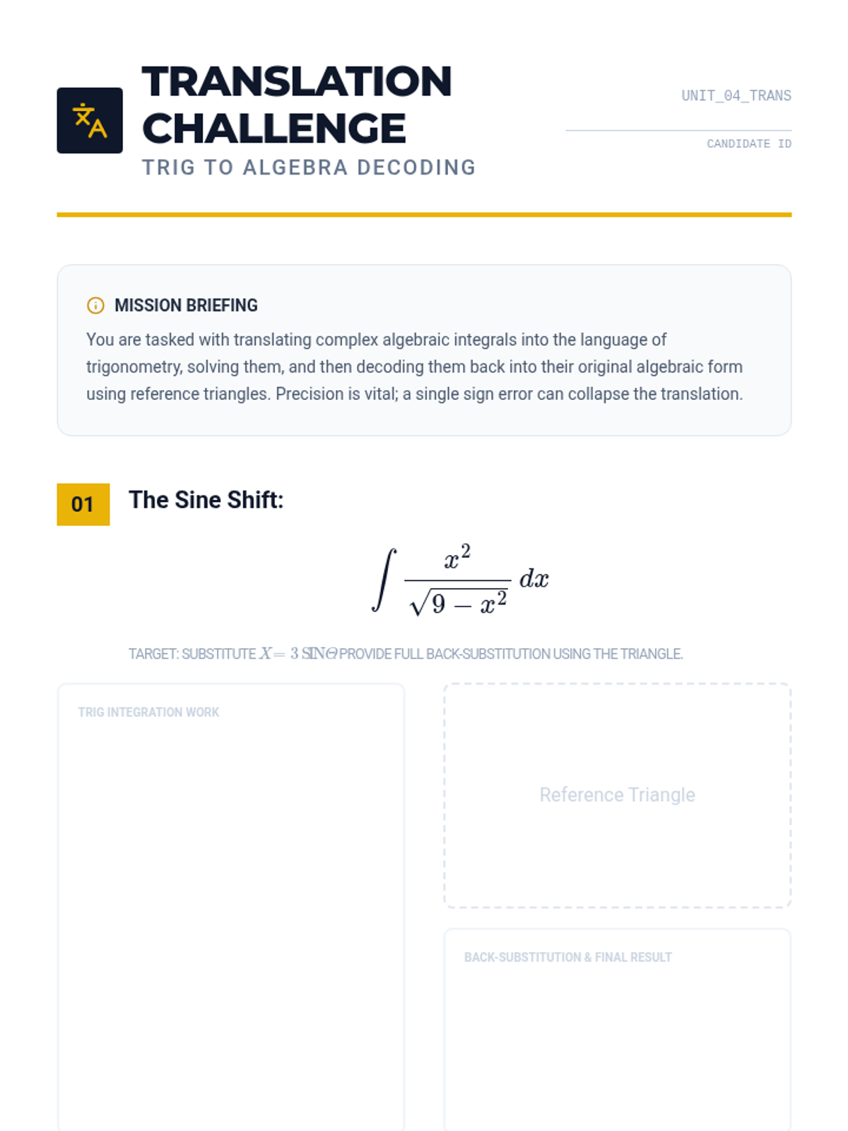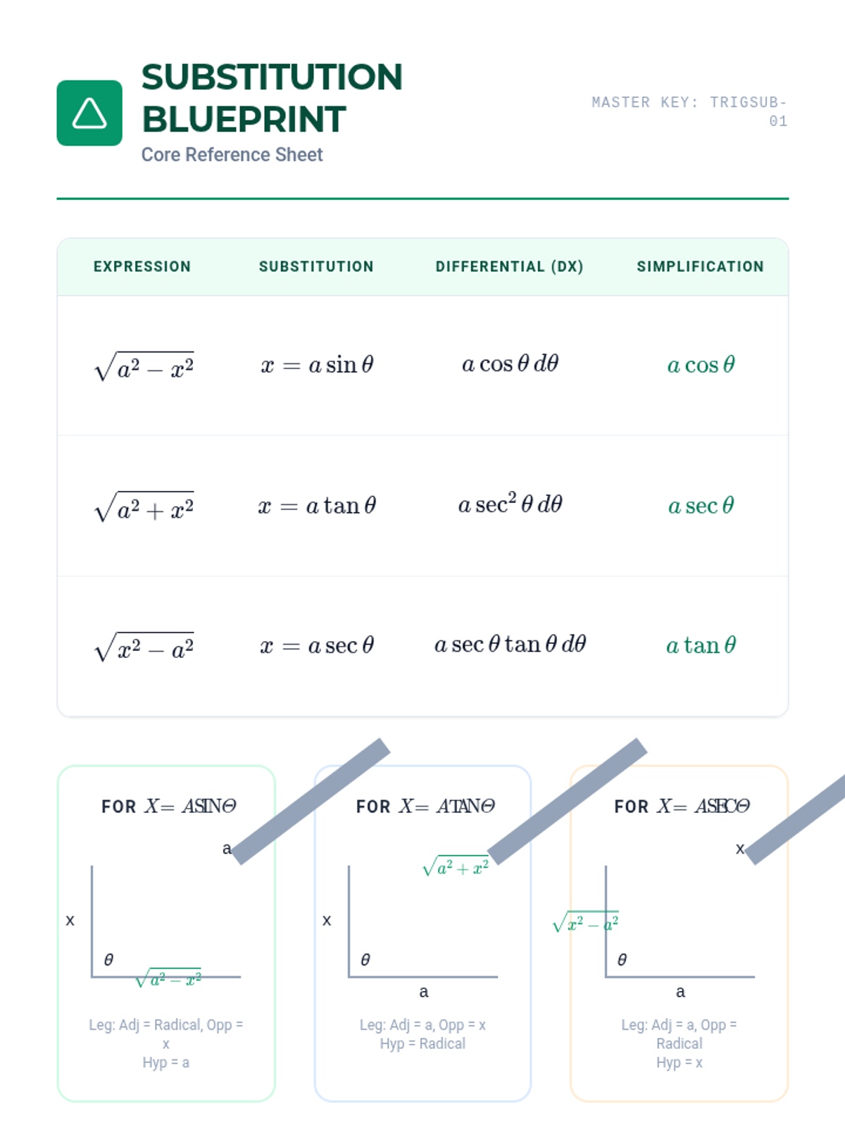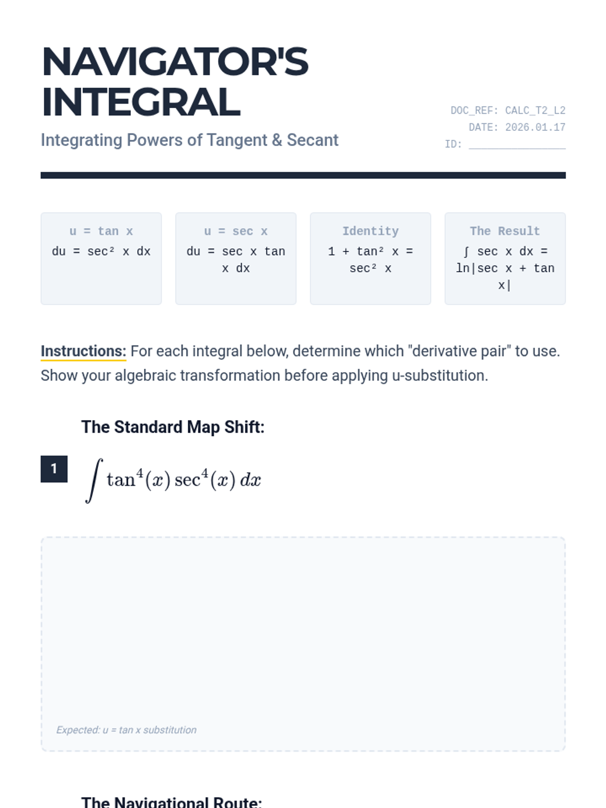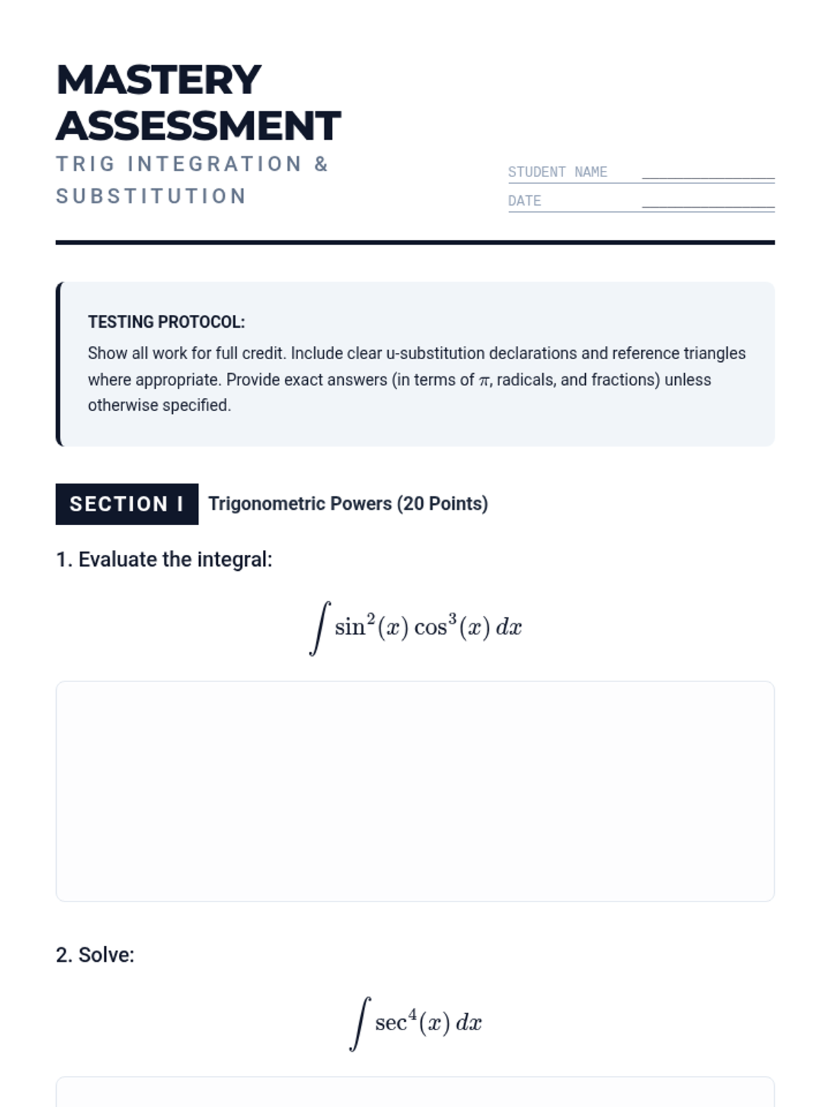 This sequence explores trigonometric integration techniques, from power reduction and identity manipulation to the geometric power of trigonometric substitution. Students learn to bridge the gap between algebraic radicals and right-triangle geometry.