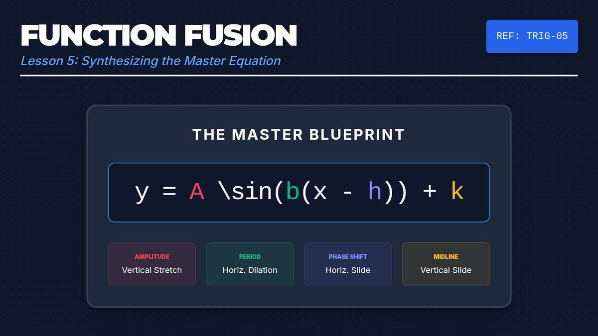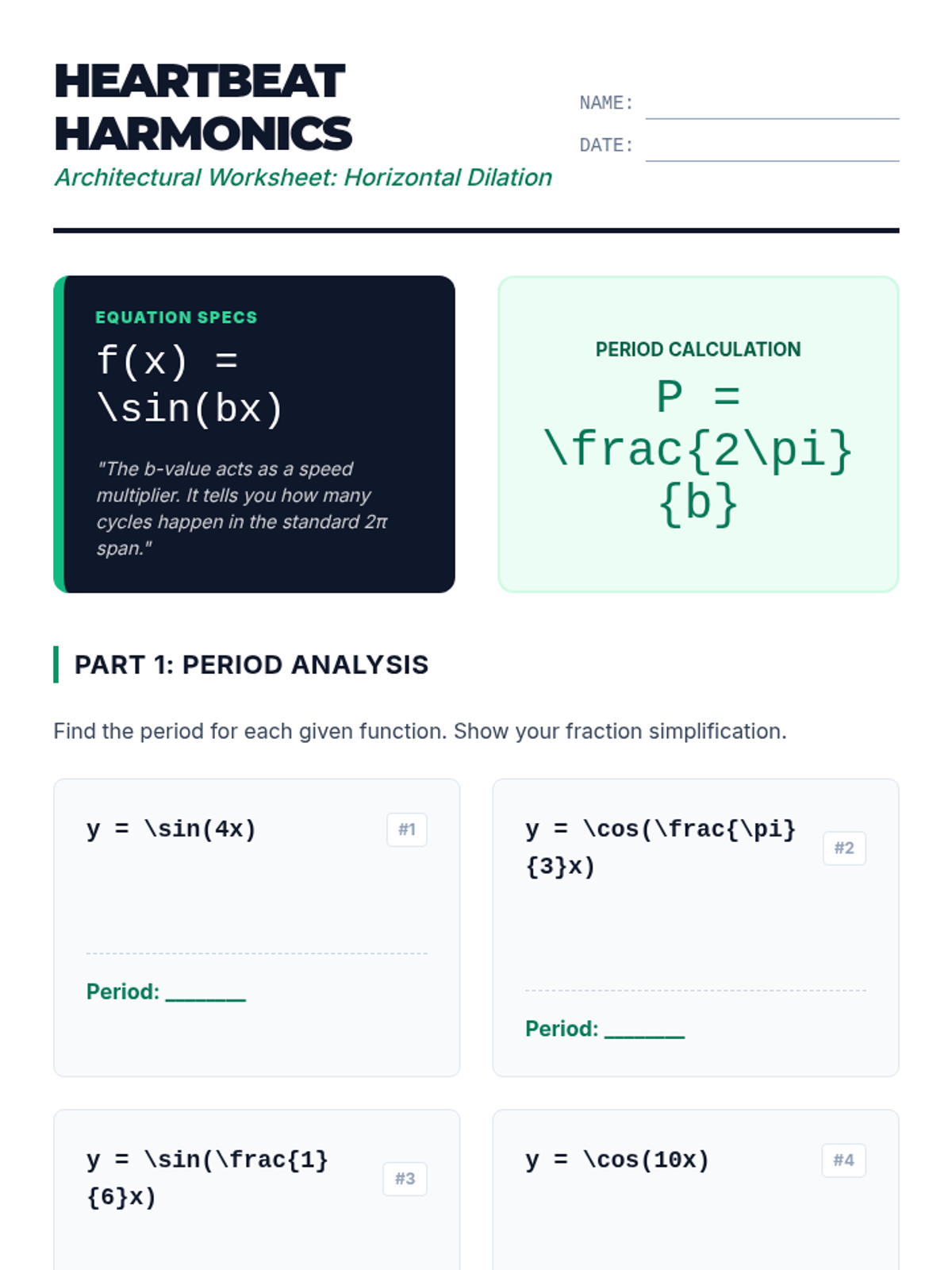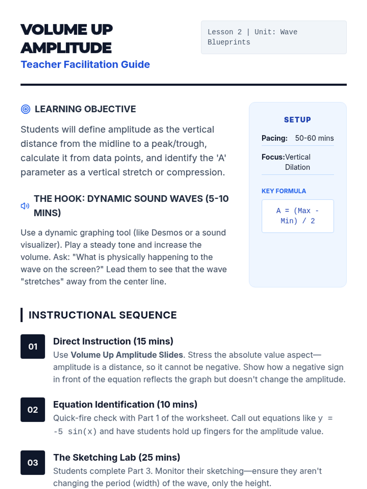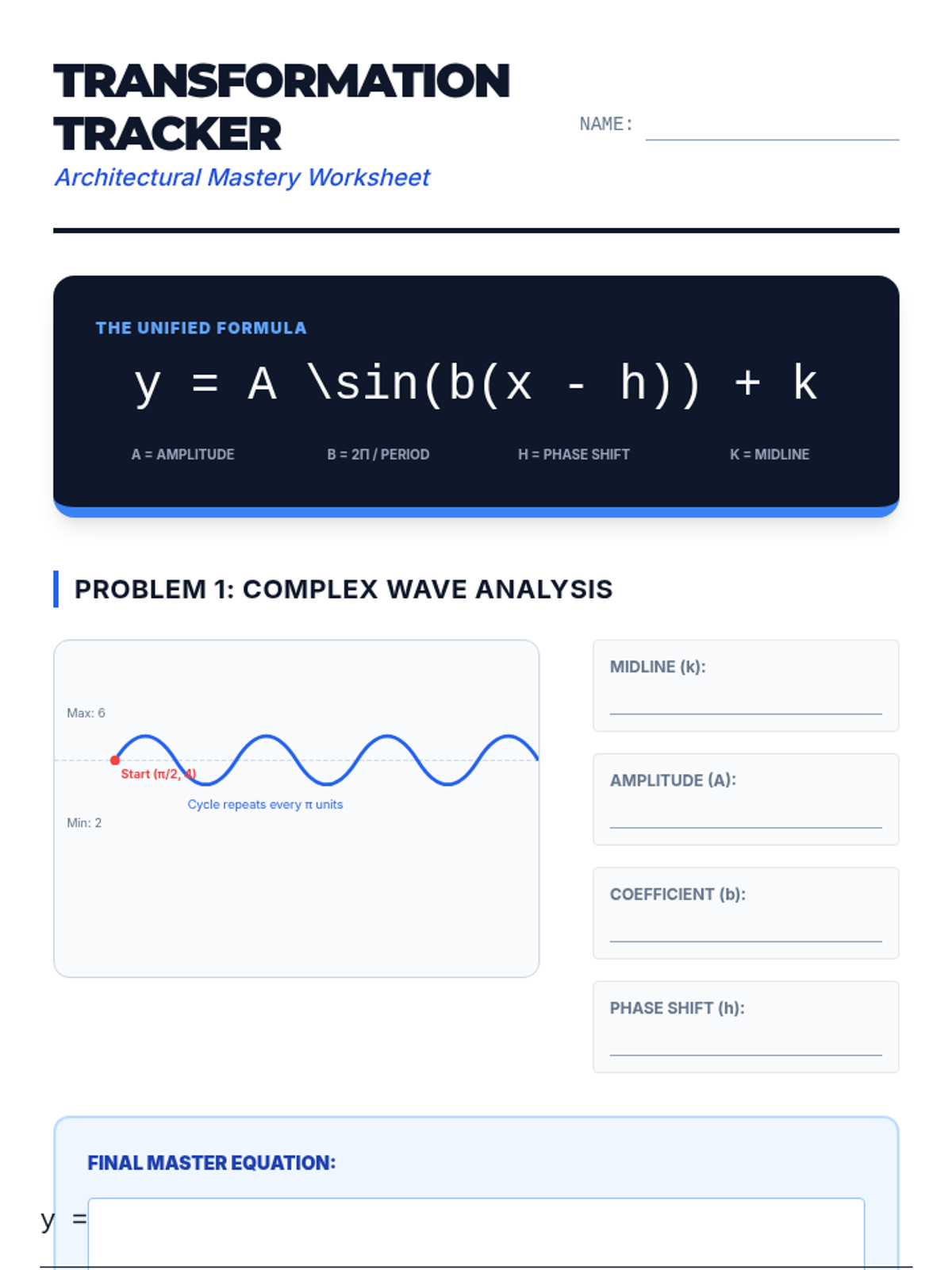 A comprehensive unit on trigonometric transformations, focusing on how parameters A, B, C, and D modify the parent sine and cosine functions. Students progress from simple vertical shifts to complex multi-parameter modeling.
