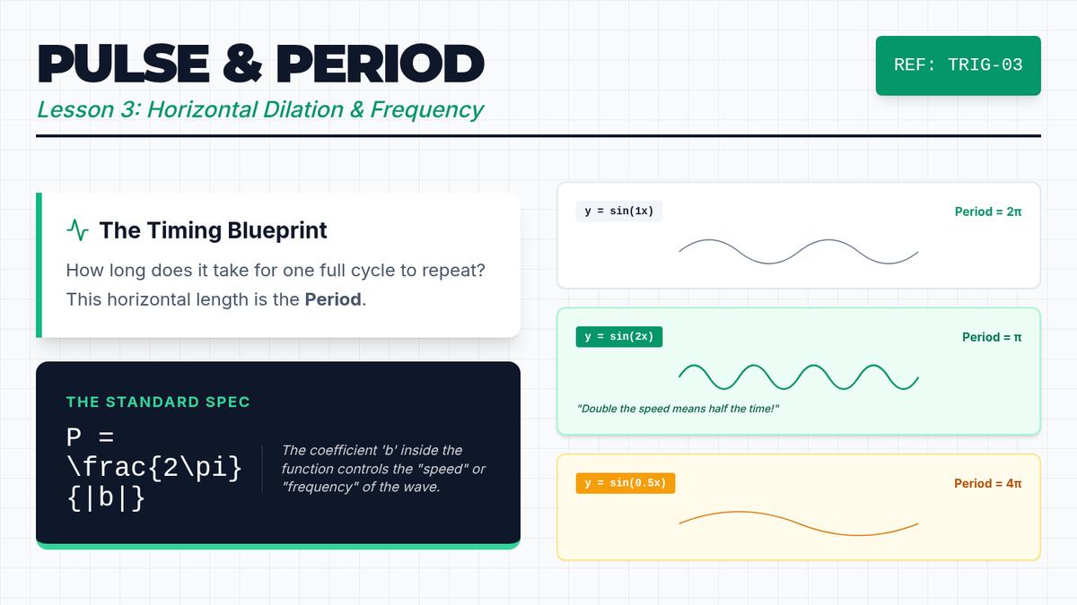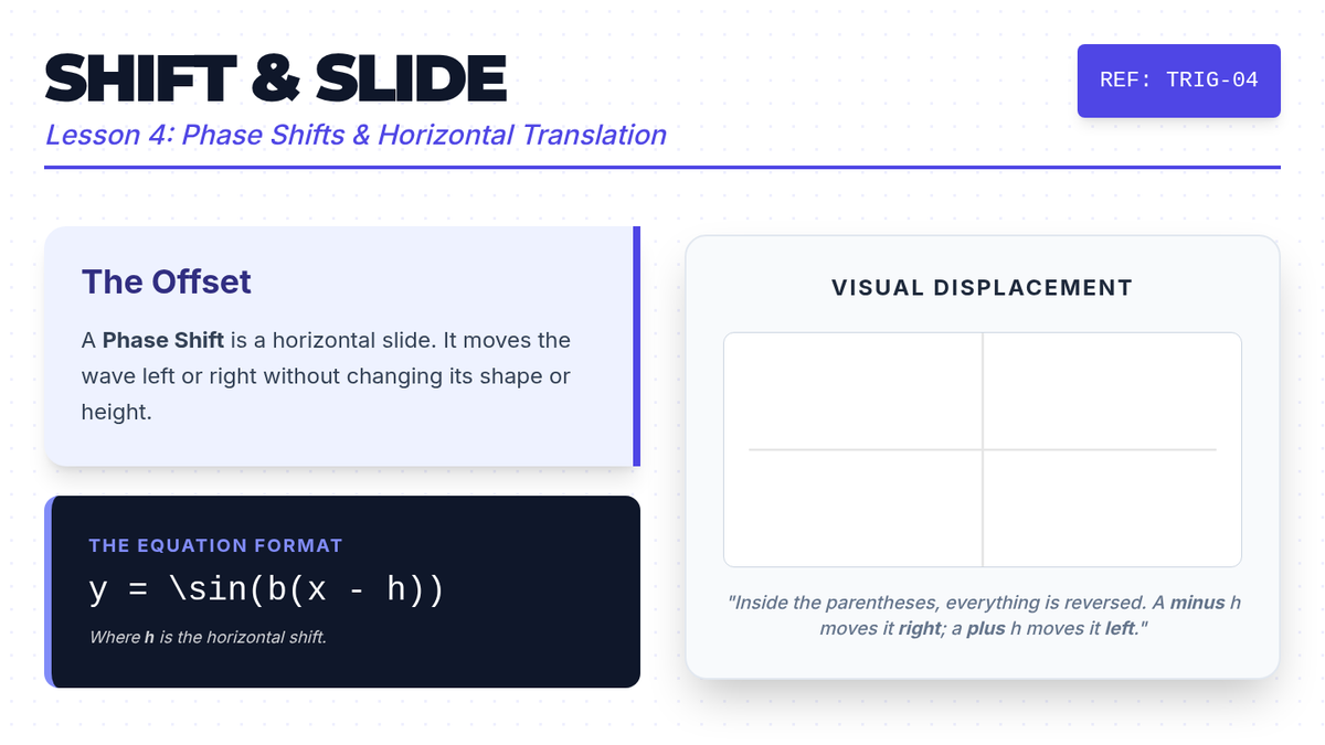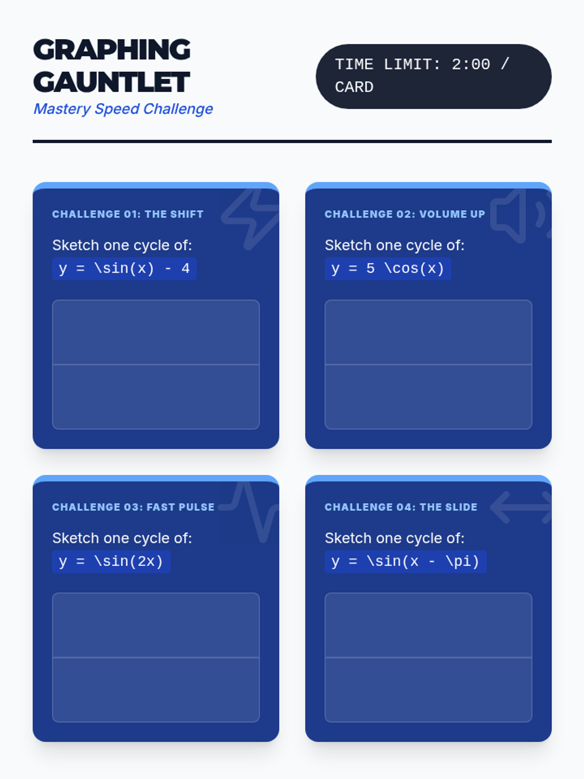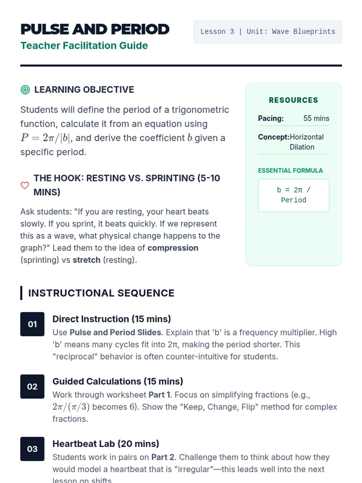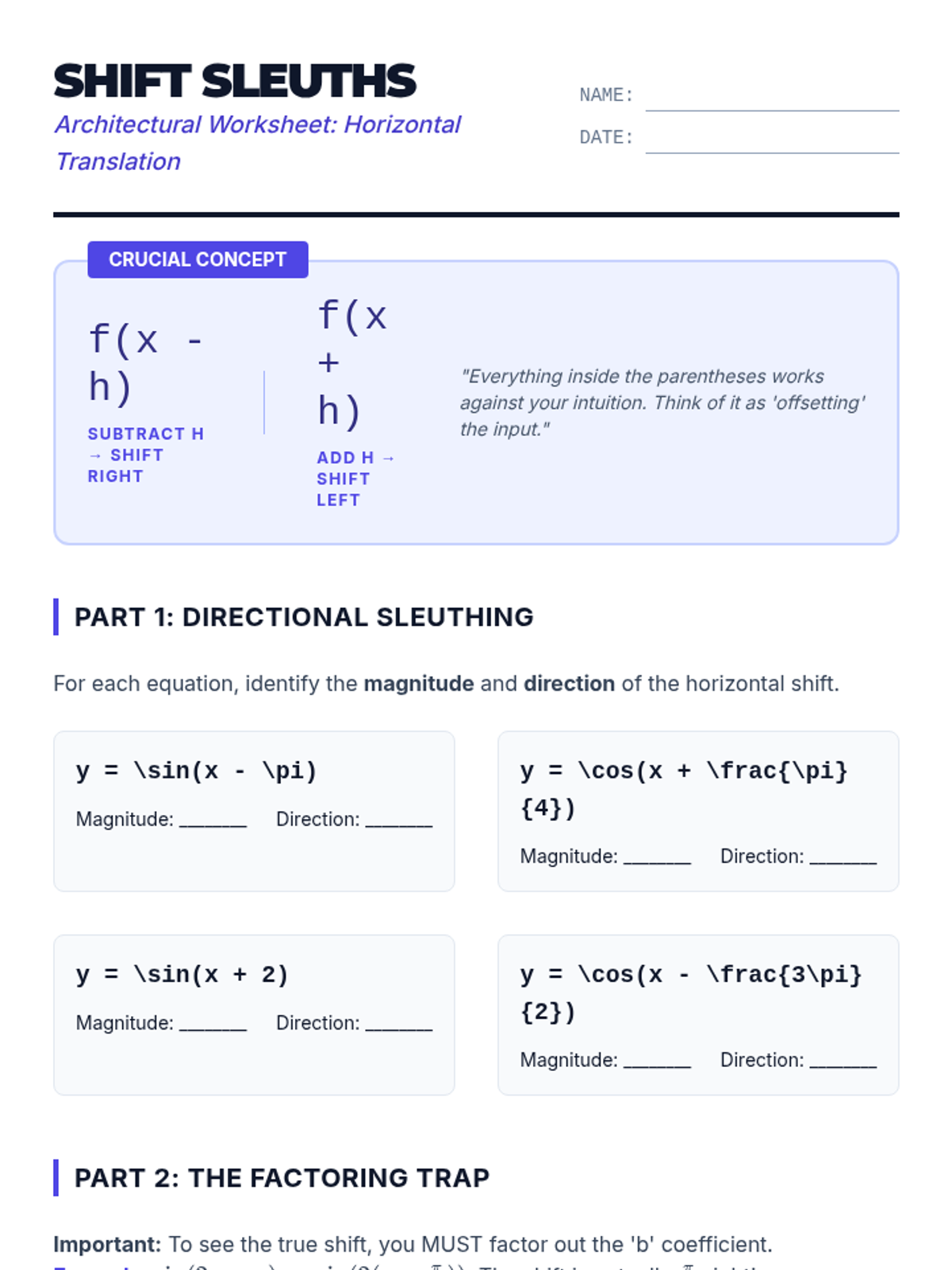 A comprehensive unit on trigonometric transformations, focusing on how parameters A, B, C, and D modify the parent sine and cosine functions. Students progress from simple vertical shifts to complex multi-parameter modeling.