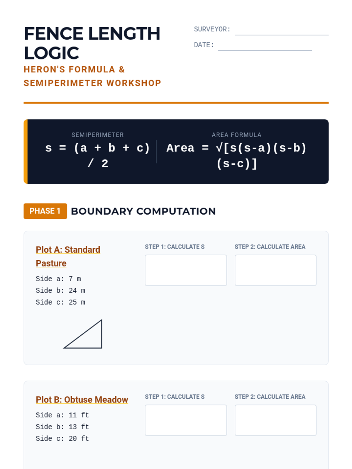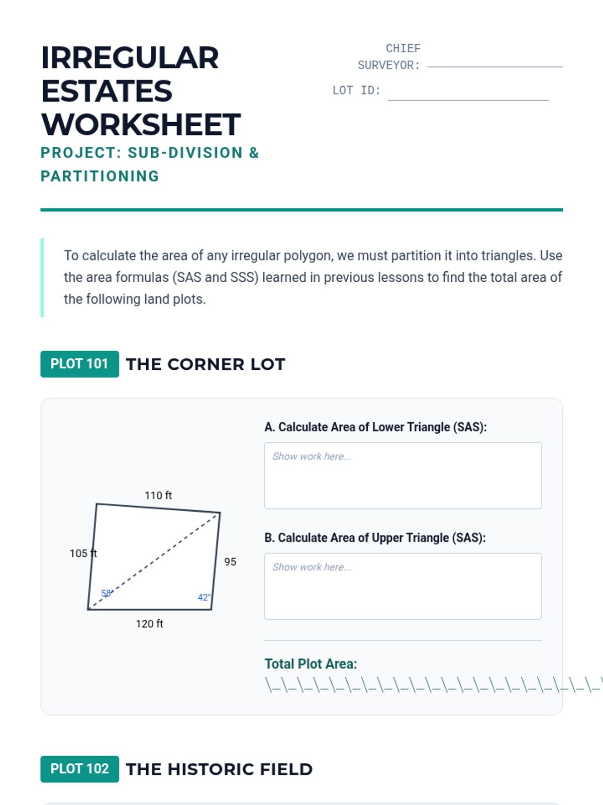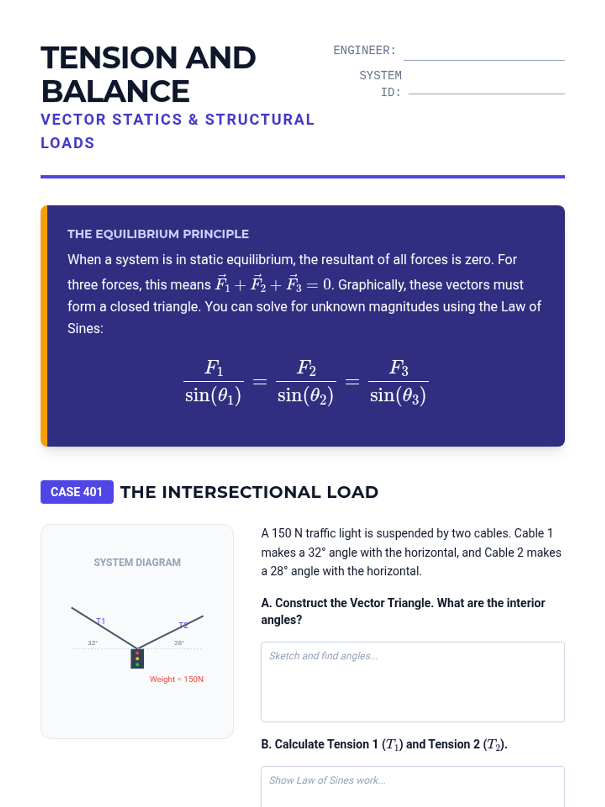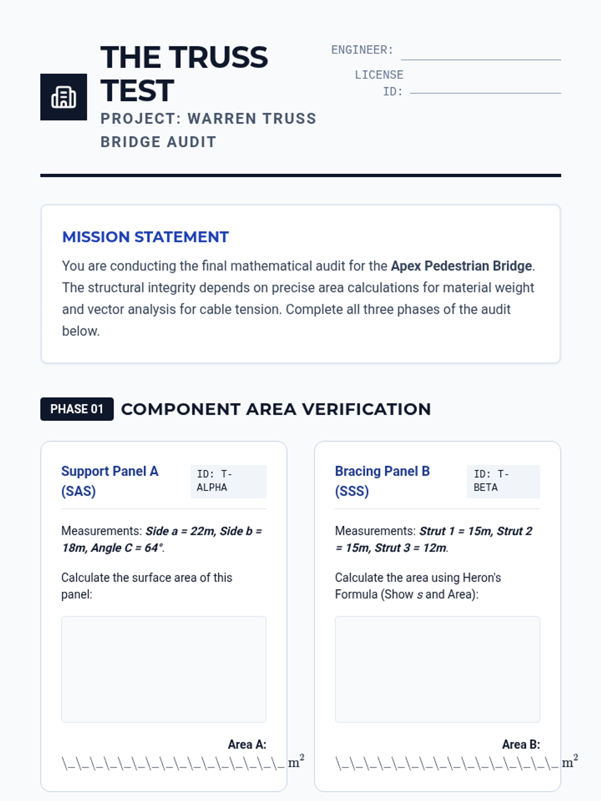 This sequence explores the measurement of area and the analysis of forces using general triangles. Students move beyond the basic 1/2 bh formula to discover how sine and perimeter can define area in oblique scenarios, specifically using Heron's Formula and vector analysis.