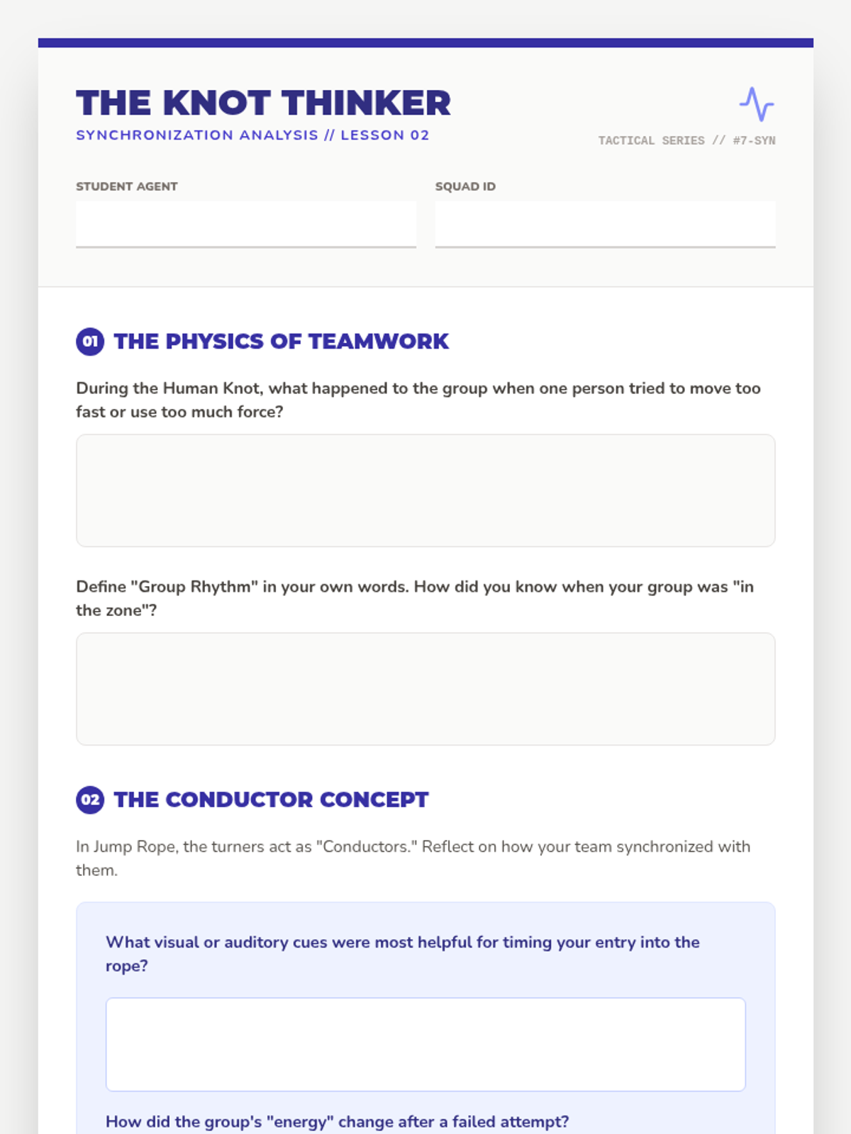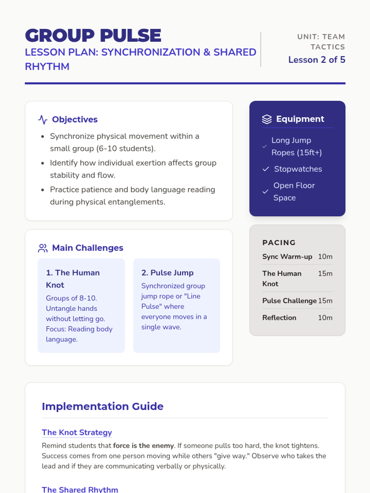 A 5-lesson unit for 7th-grade PE focused on developing communication, trust, and strategic planning through cooperative physical challenges. Students progress from partner trust activities to complex group problem-solving tasks.