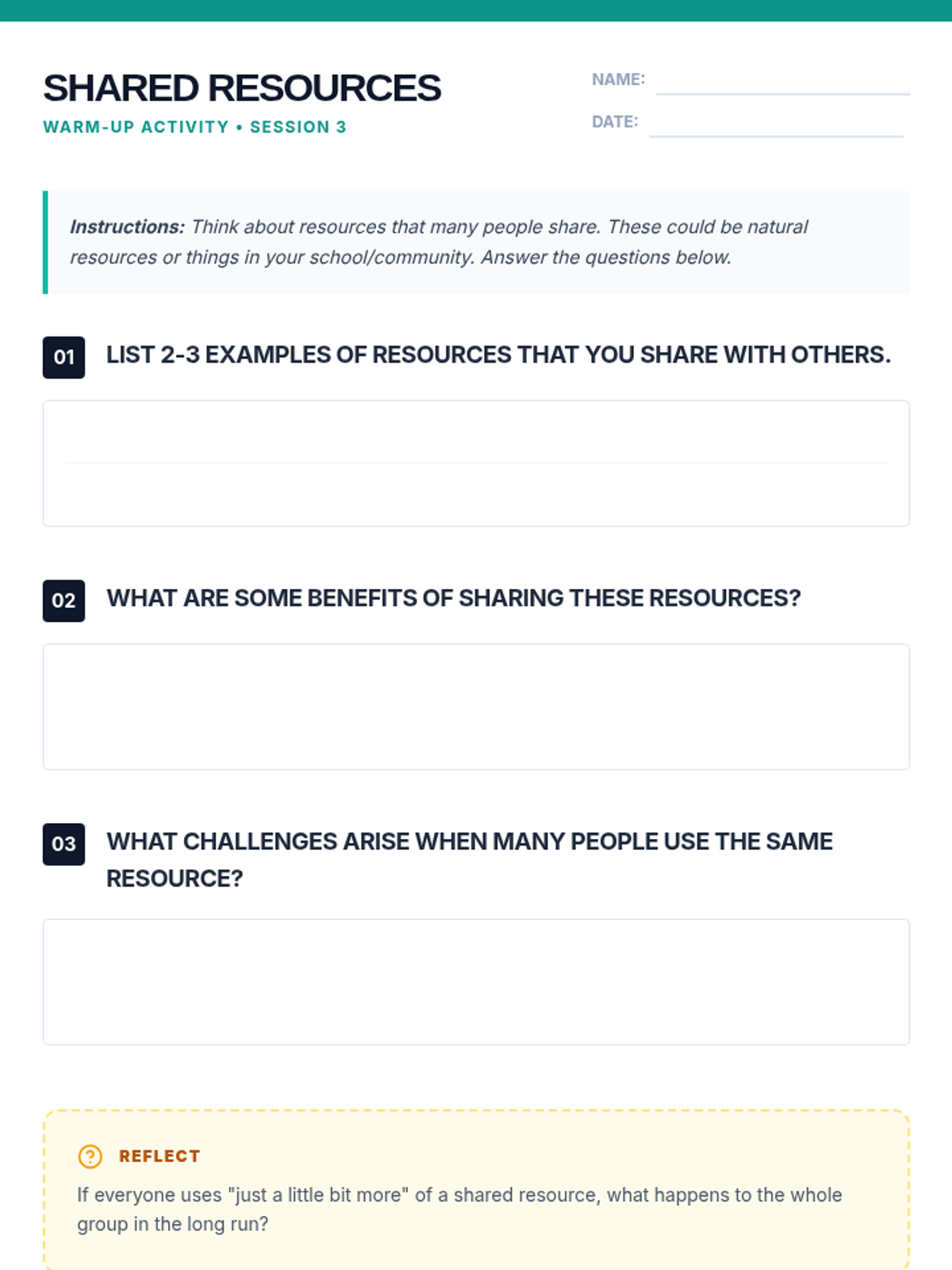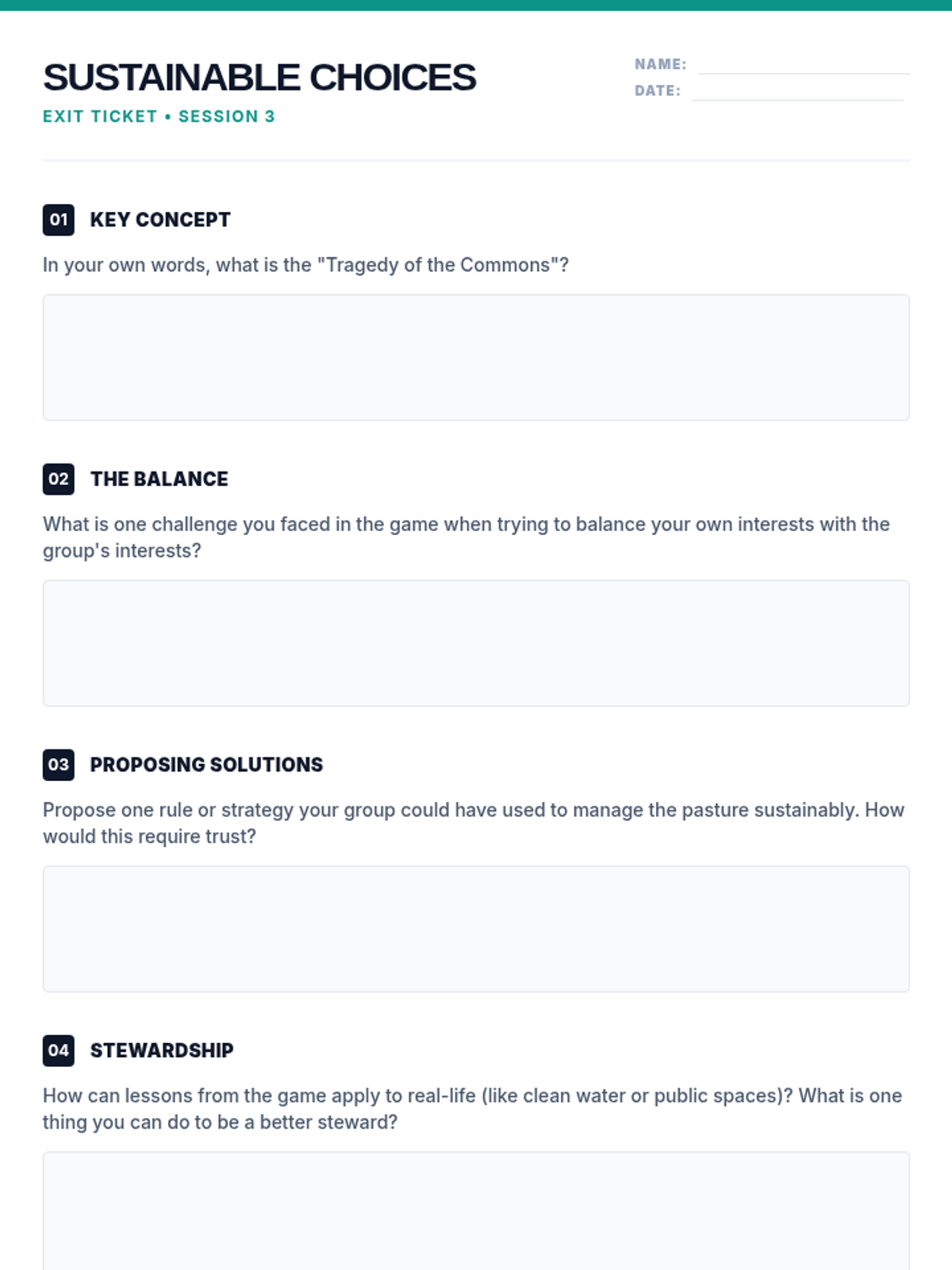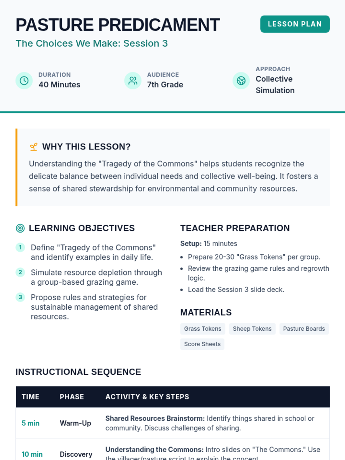 A three-session unit for 7th graders exploring trust, cooperation, and collective responsibility through interactive games like the Prisoner's Dilemma and the Tragedy of the Commons.