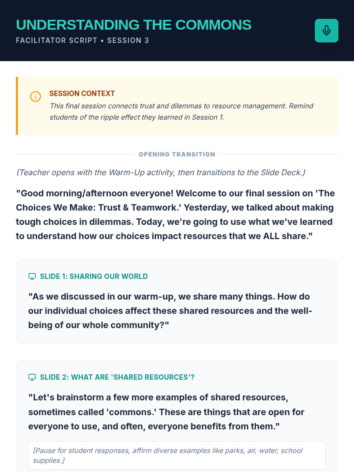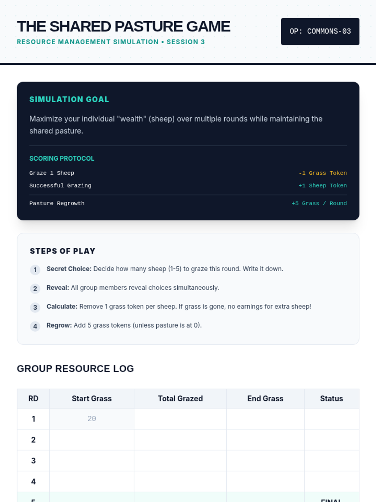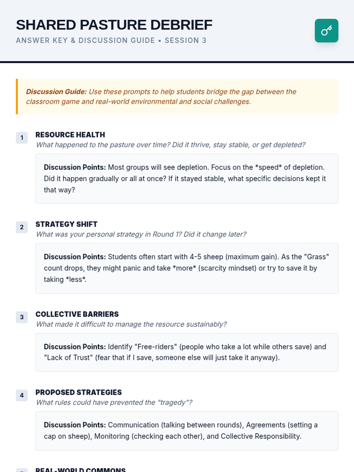 A three-session unit for 7th graders exploring trust, cooperation, and collective responsibility through interactive games like the Prisoner's Dilemma and the Tragedy of the Commons.