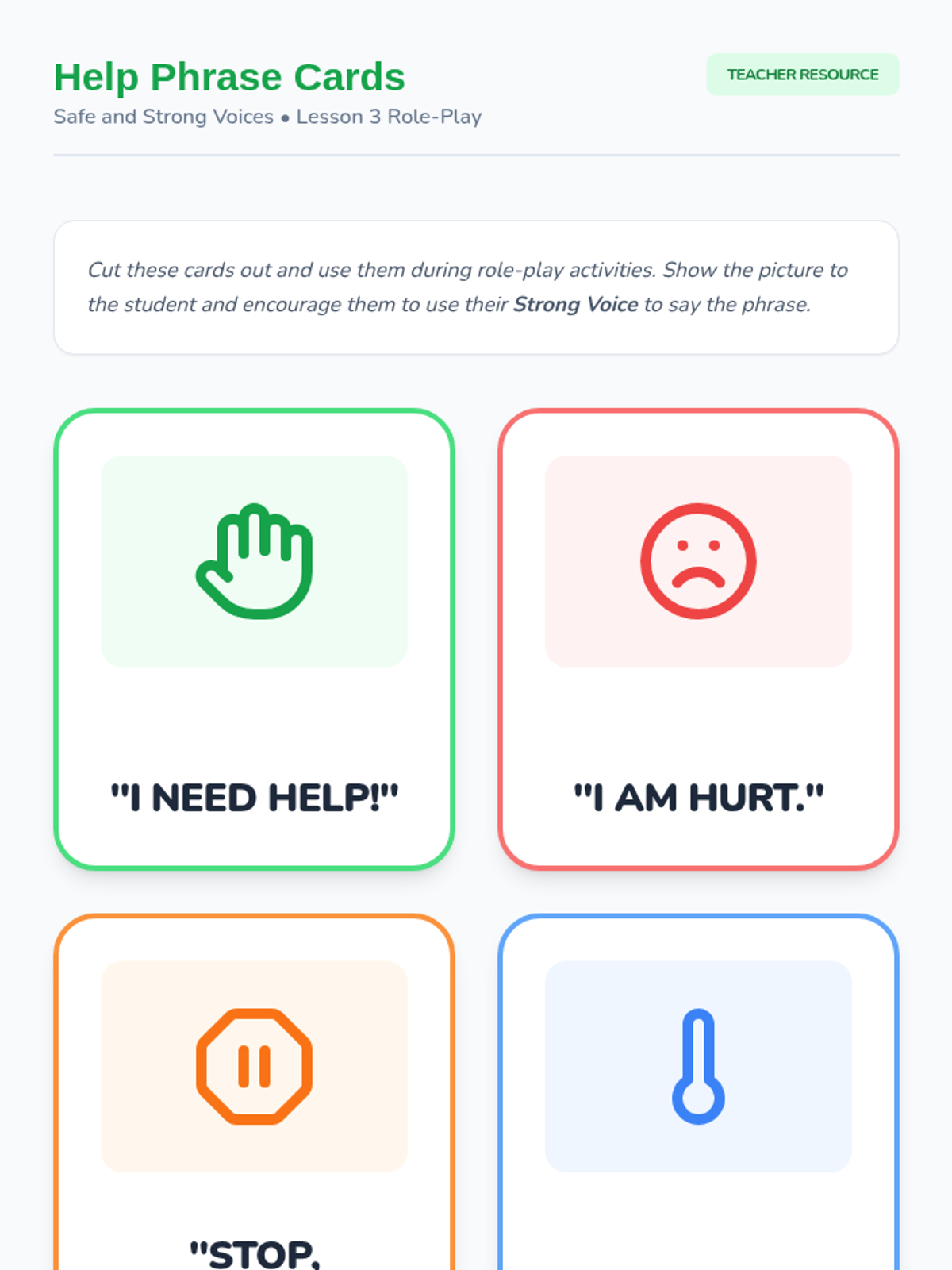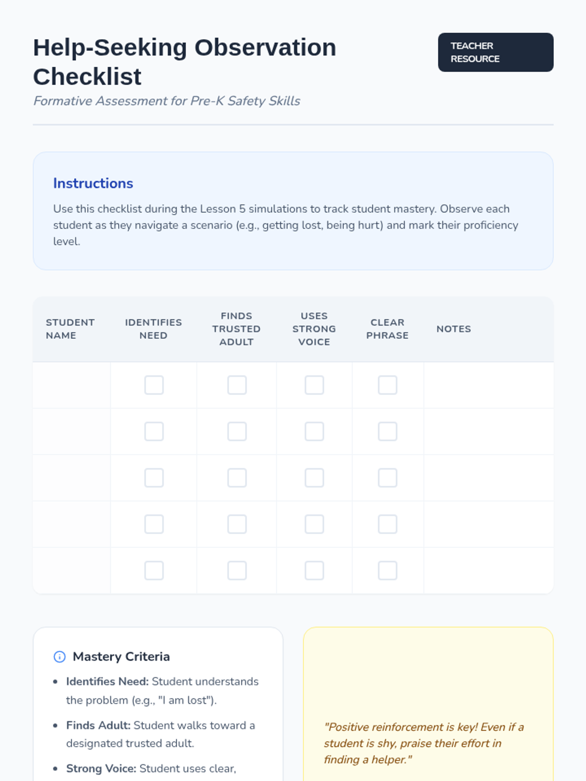 A 5-lesson sequence for Pre-K students focusing on identifying personal needs, recognizing trusted adults, practicing assertive communication, and establishing personal boundaries to ensure safety and health.
