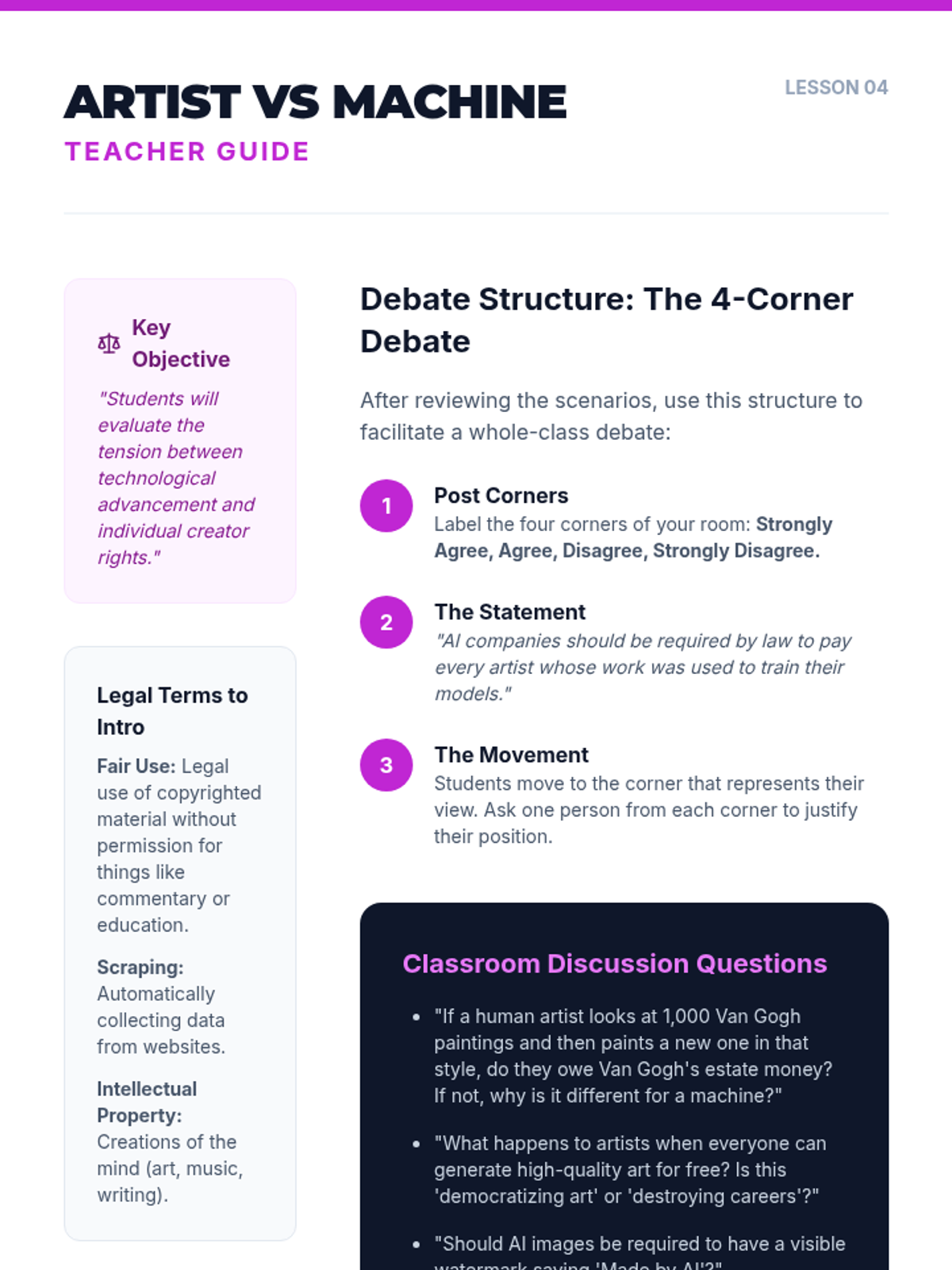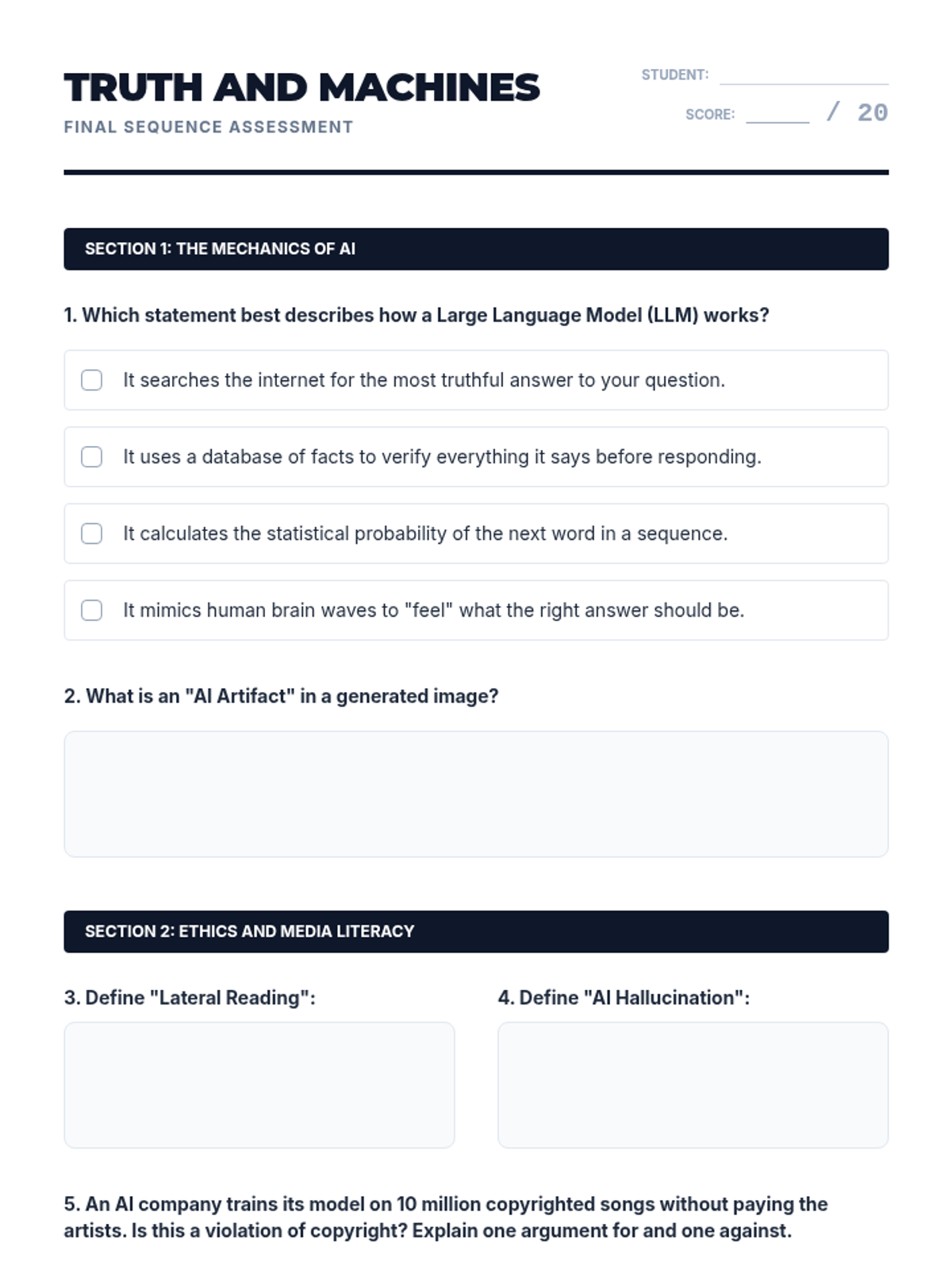 A comprehensive sequence for 8th-grade students exploring the mechanics, ethics, and societal impacts of Generative AI. Students will learn how AI models predict data, identify deepfakes, manage hallucinations, and navigate copyright issues to become responsible digital citizens.