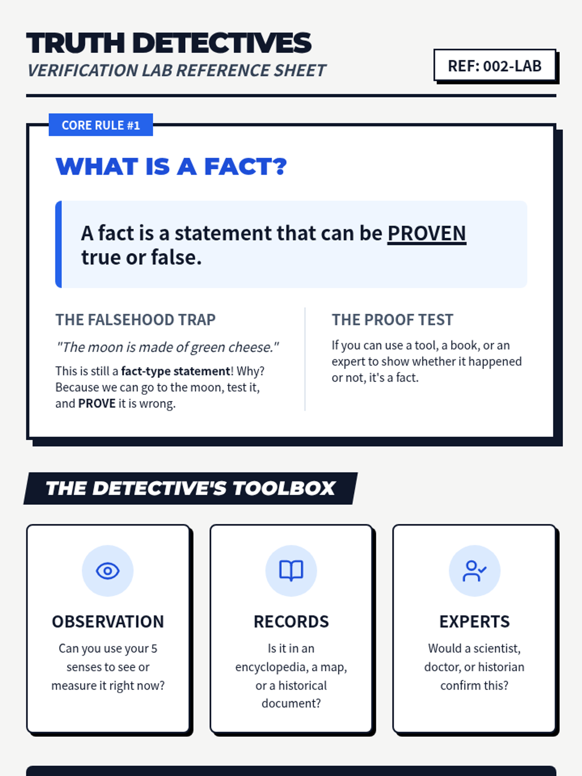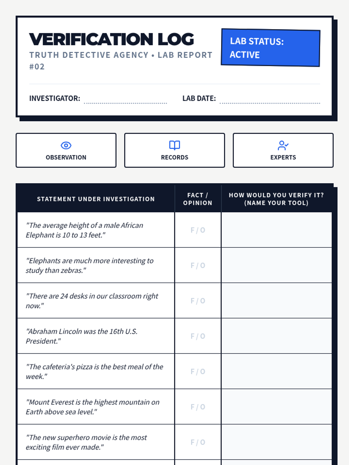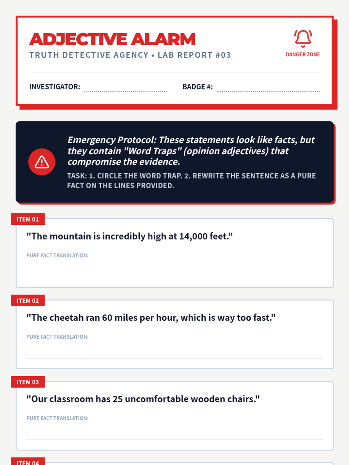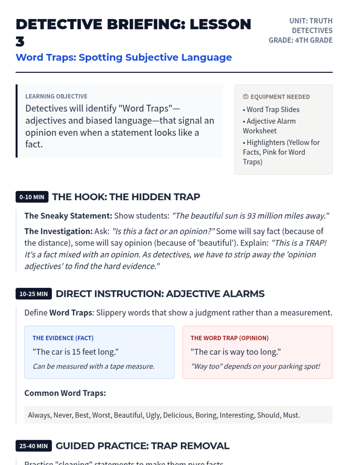 A comprehensive 10-day 4th grade unit themed around a detective agency where students learn to distinguish between verifiable facts and subjective opinions through investigation and analysis.