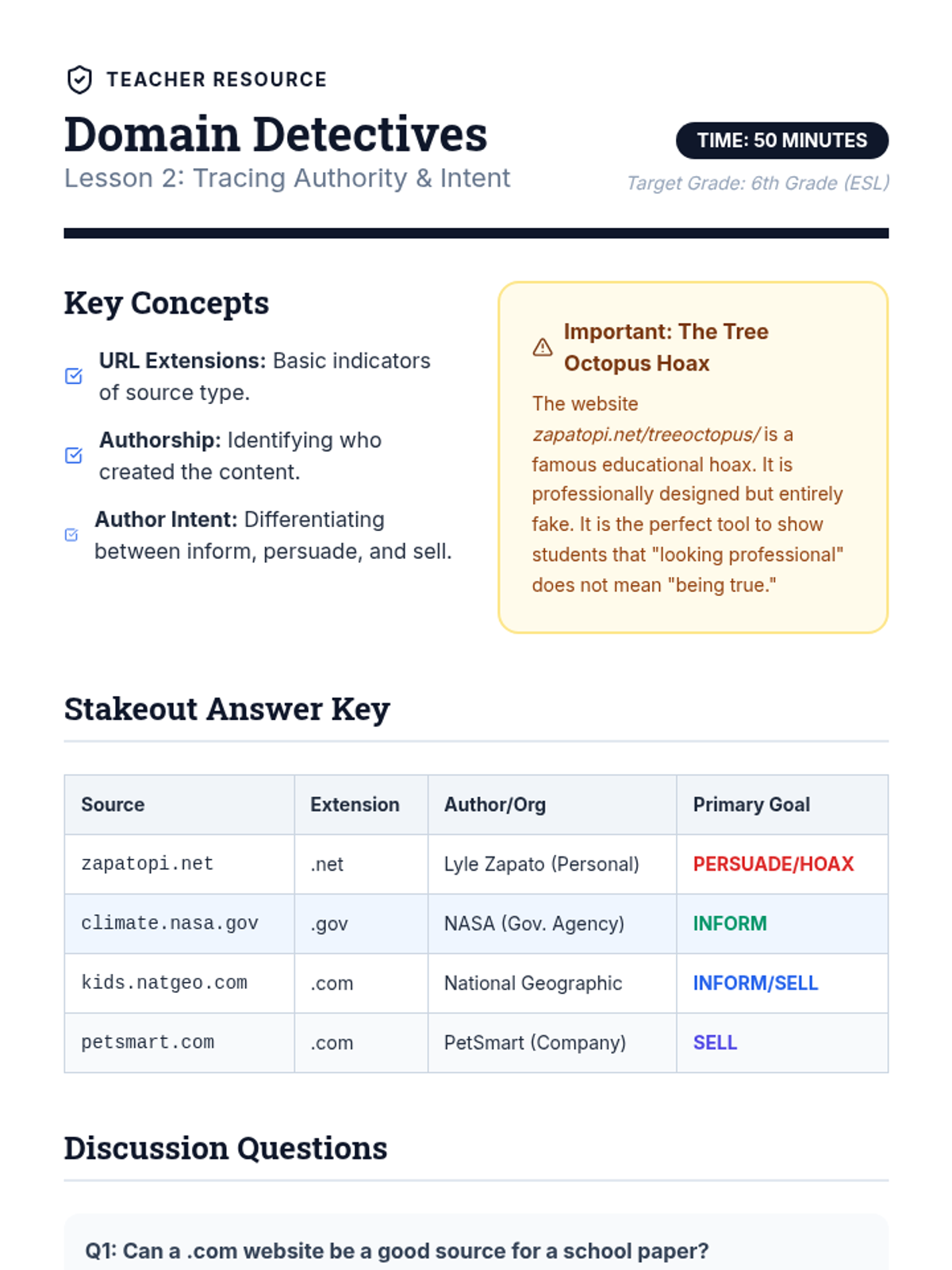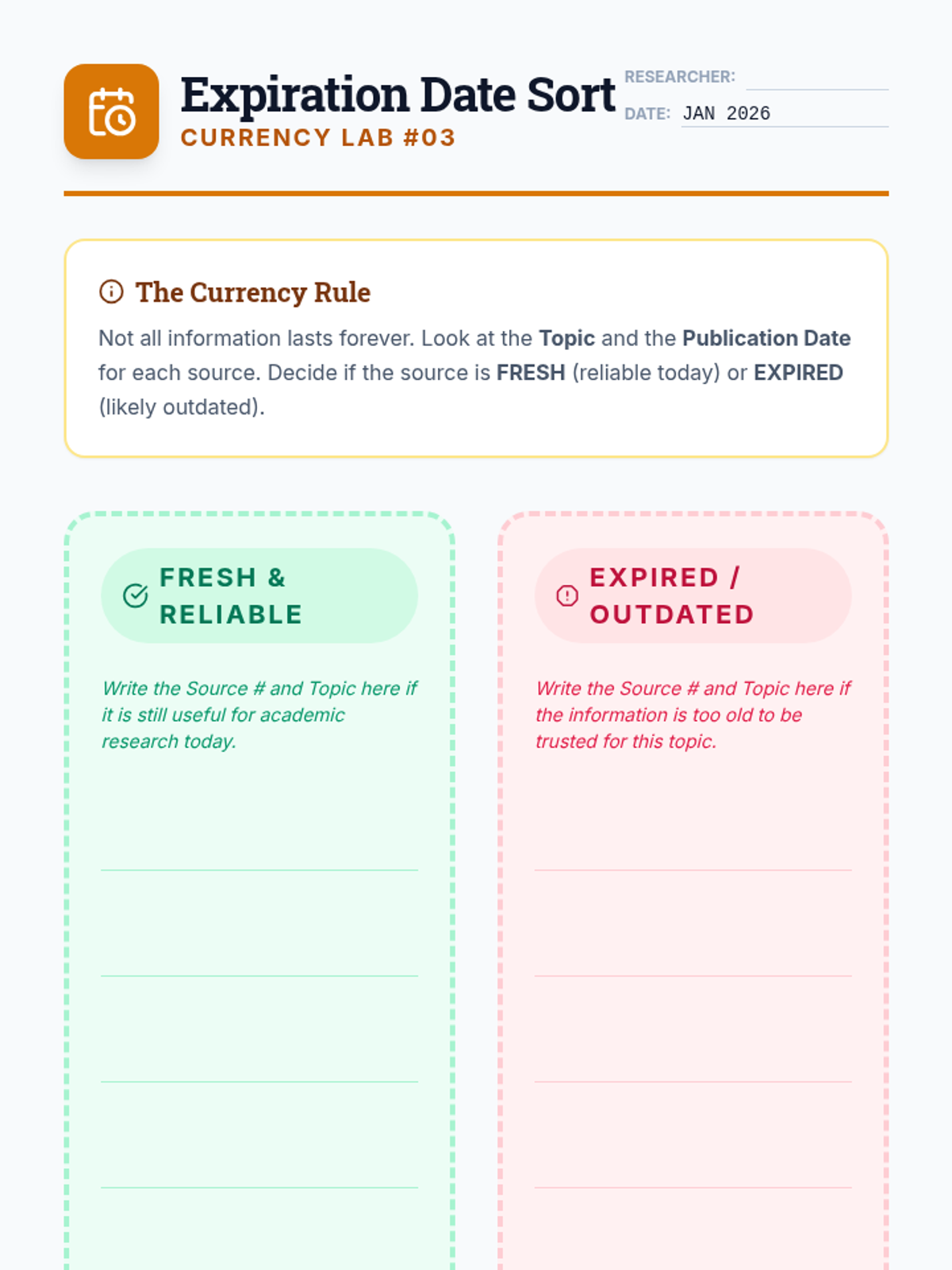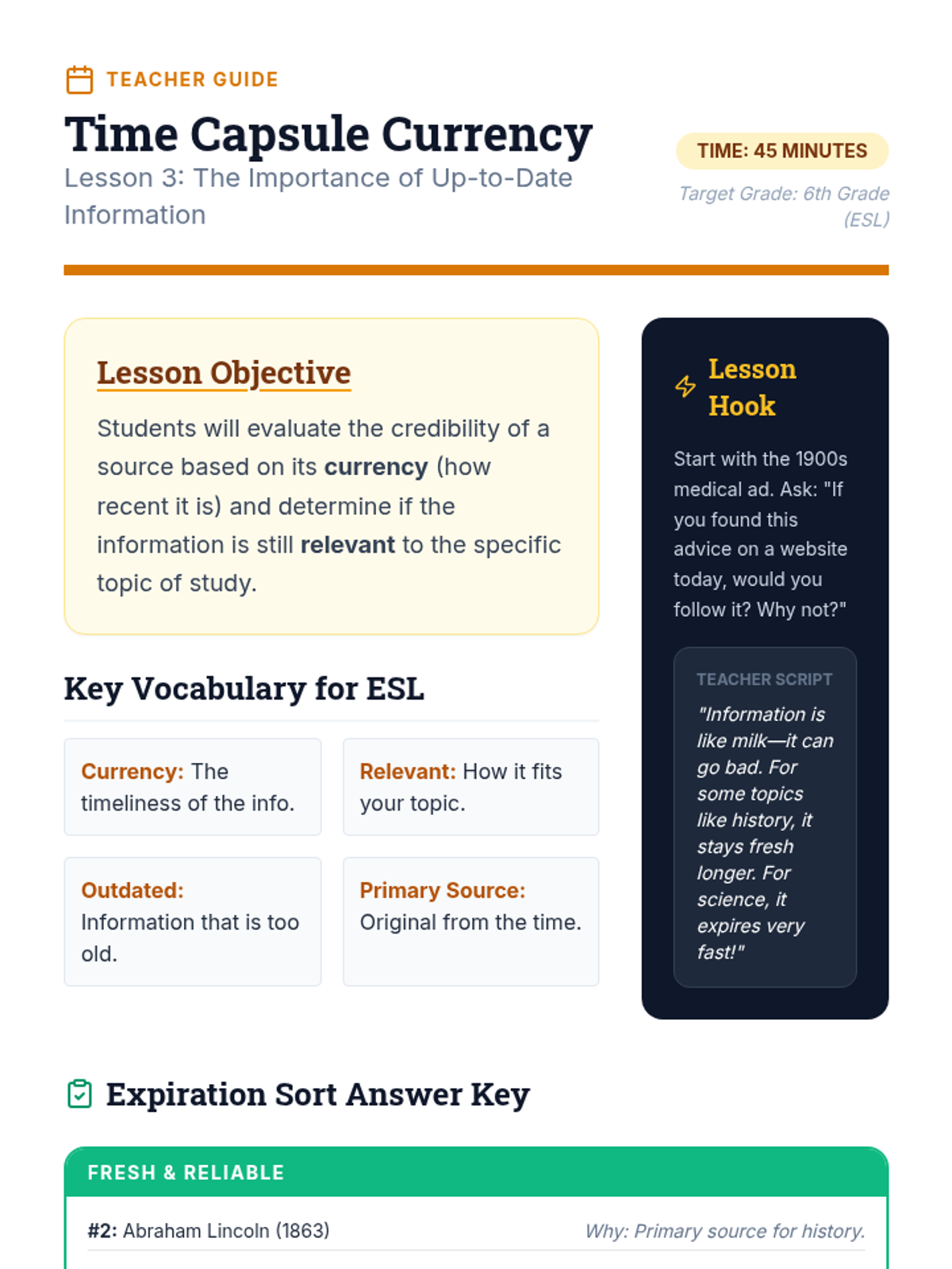 A comprehensive sequence for 6th Grade ESL students to develop critical research and information literacy skills. Students progress from distinguishing basic facts and opinions to applying professional evaluation frameworks like the CRAAP test to determine source credibility.
