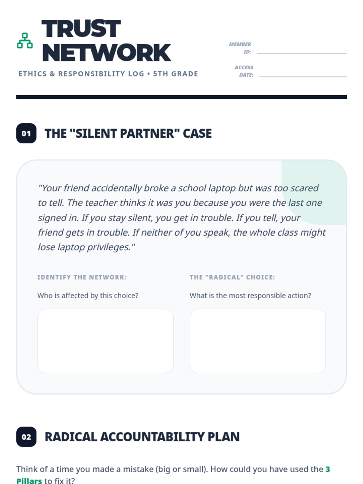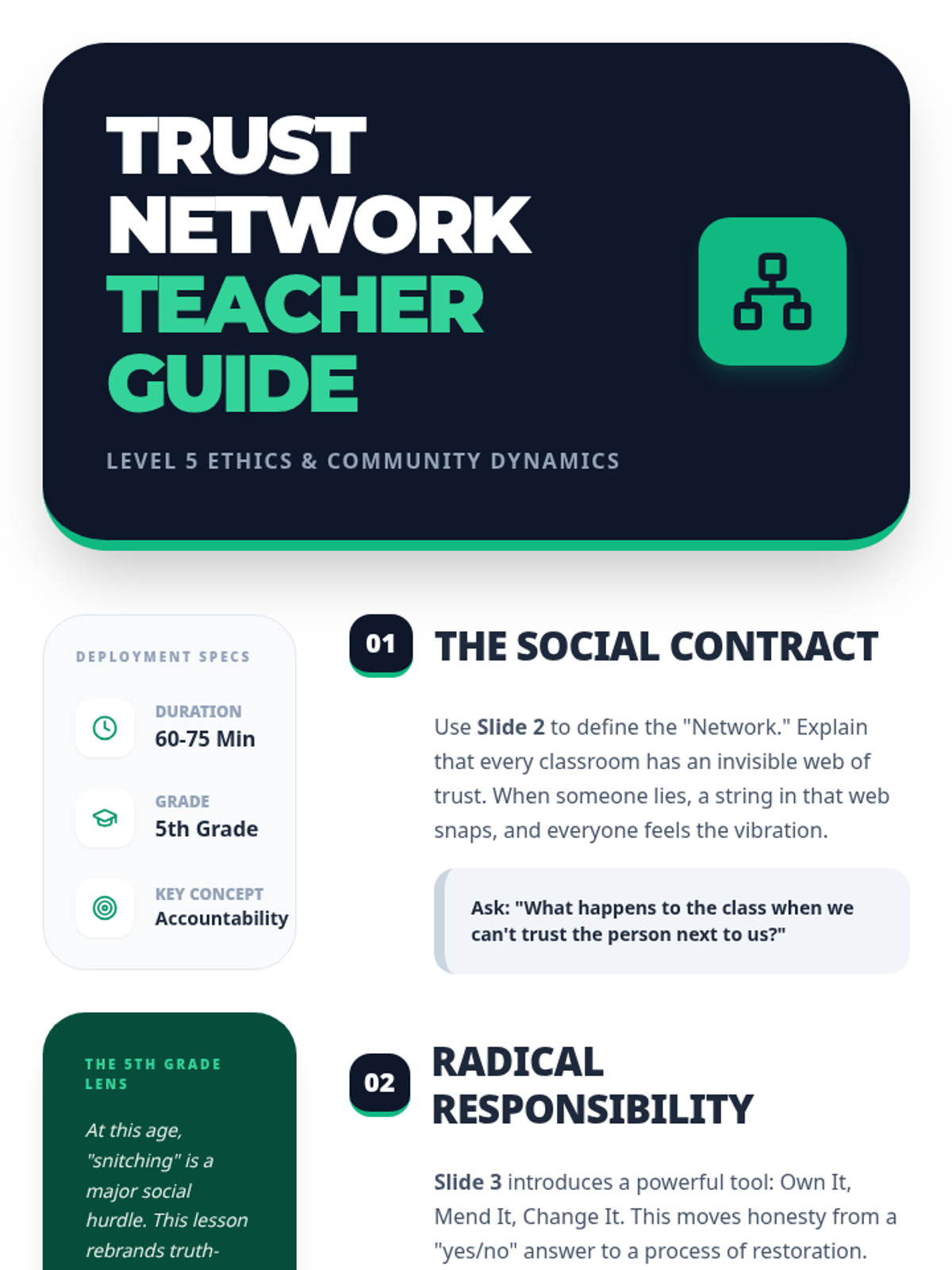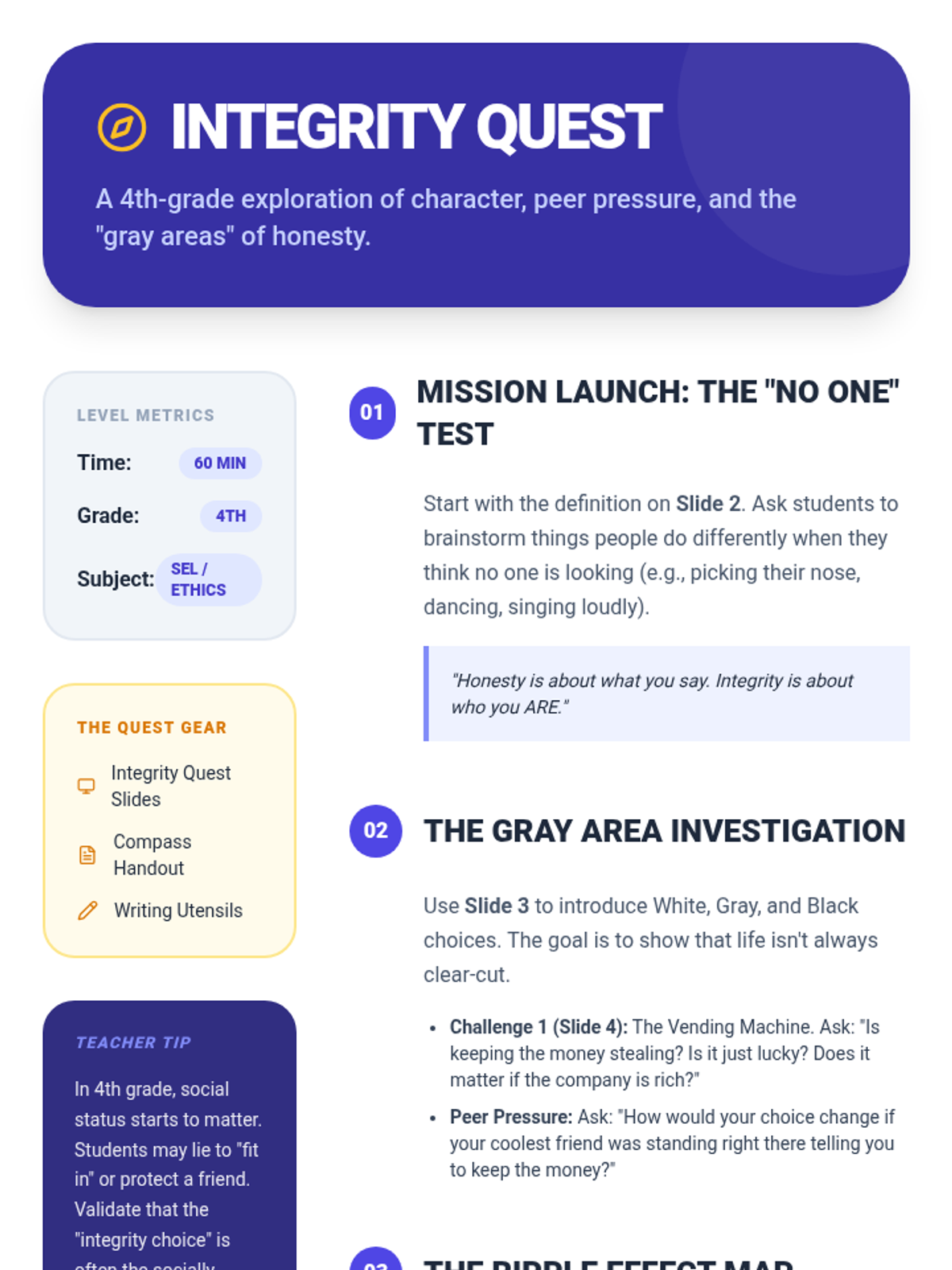 A multi-grade progression (3rd-5th) exploring honesty, integrity, and accountability. Students move from basic truth-telling to navigating complex social ethics and building community trust.
