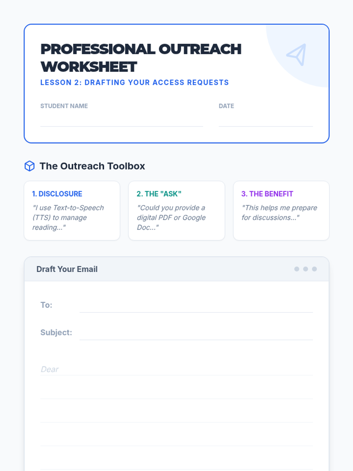 This sequence empowers 9th-grade students to integrate Text-to-Speech (TTS) into their high school workflows through self-advocacy and digital organization. Students move from identifying reading barriers in their schedules to creating a professional Access Plan for their teachers.