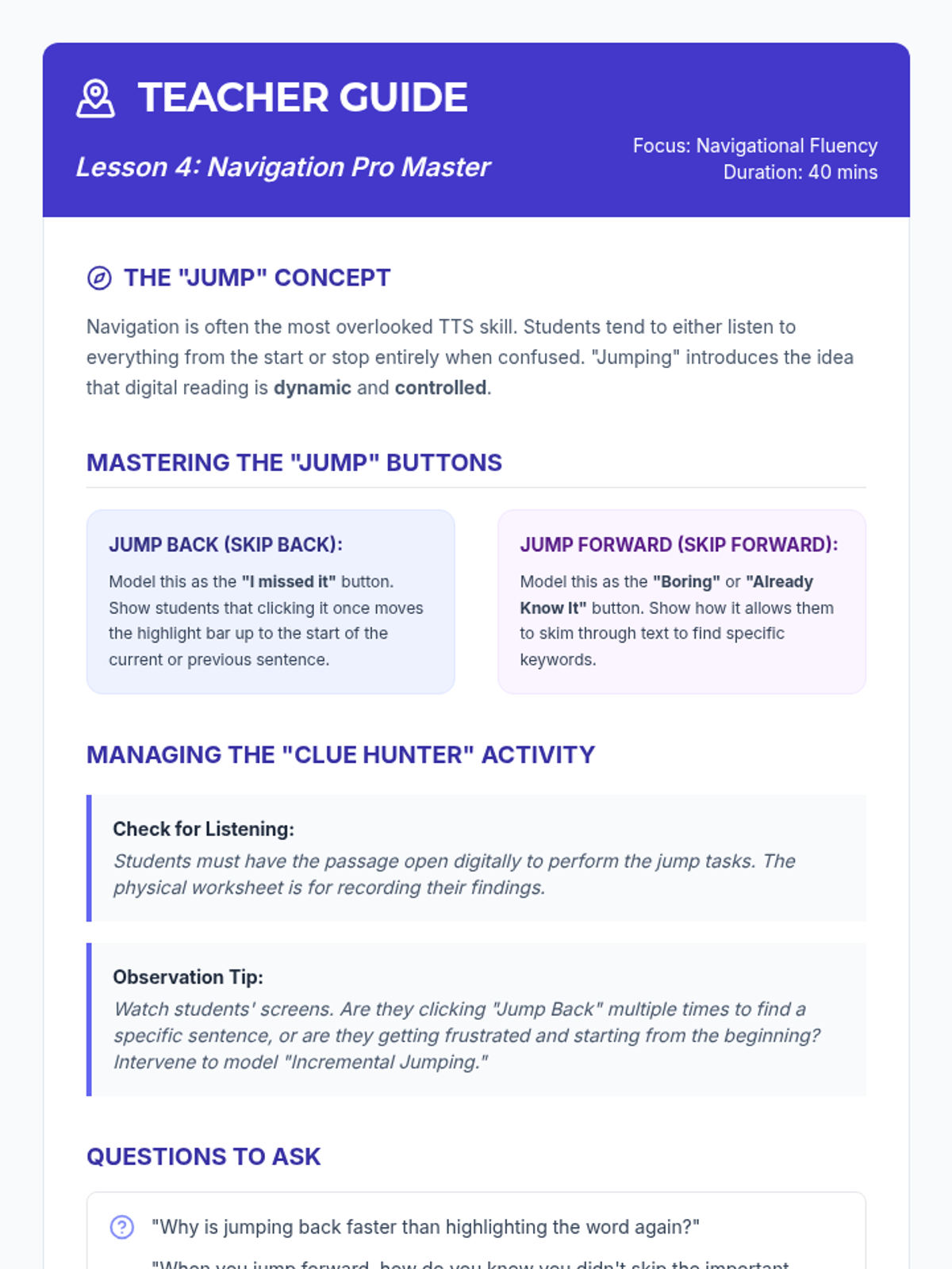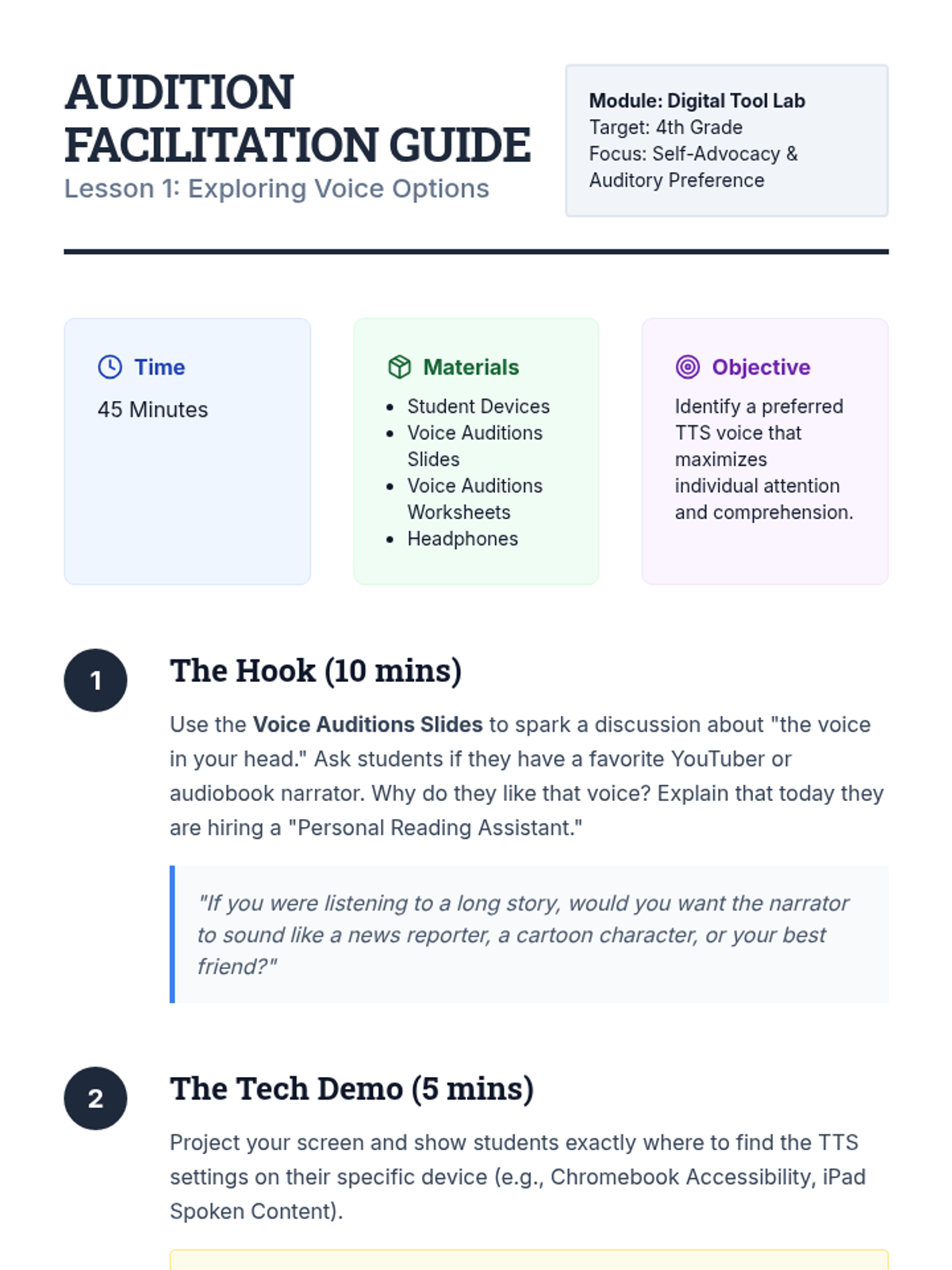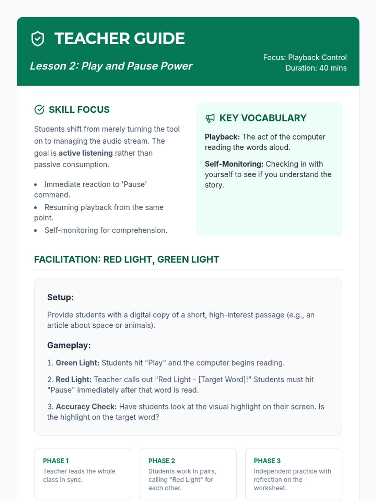 A comprehensive sequence for 4th-grade students to master the technical controls of text-to-speech (TTS) assistive technology. Students progress from basic activation to independent navigation and selection, building technical fluency for accessible reading.