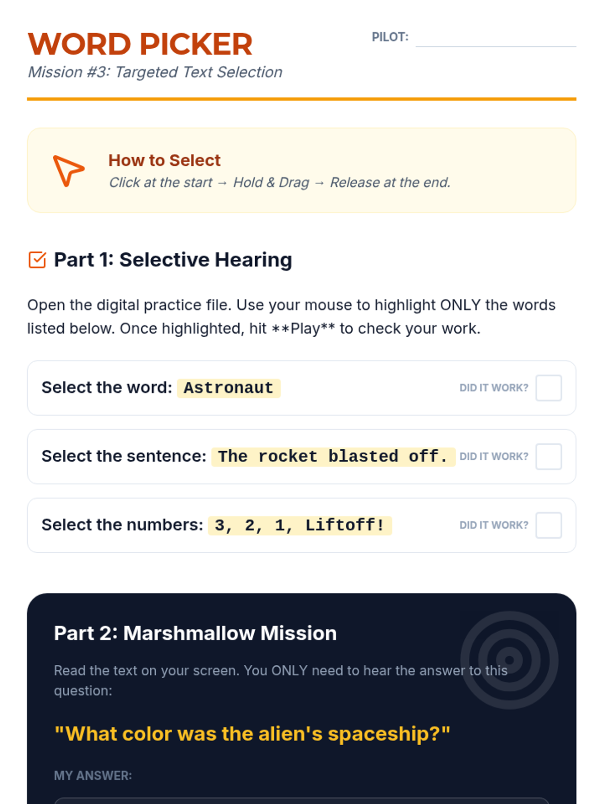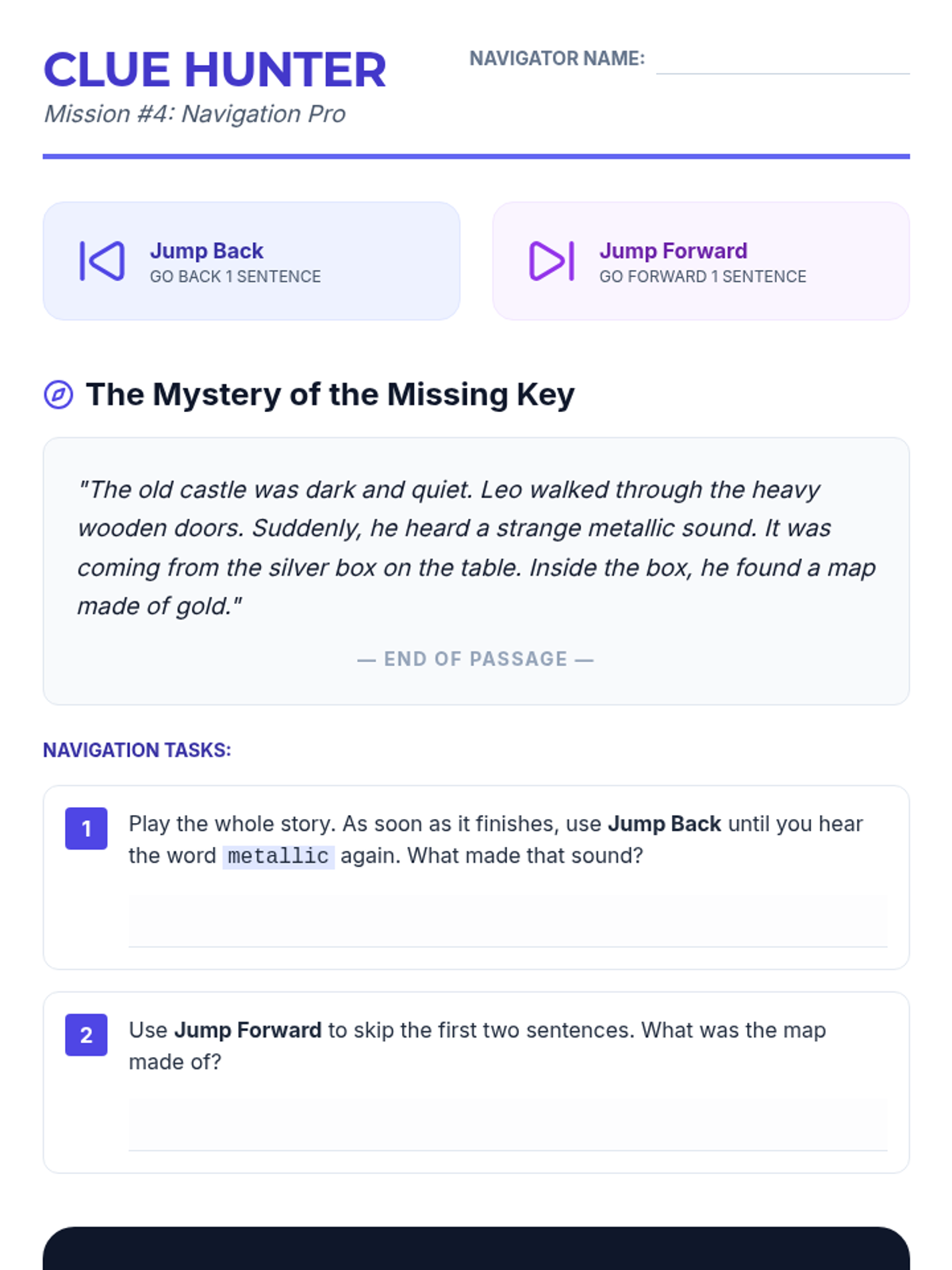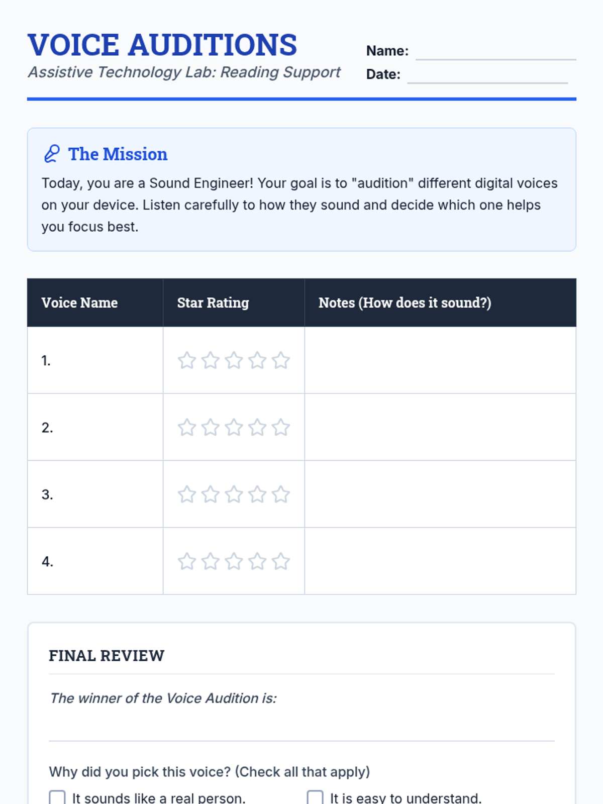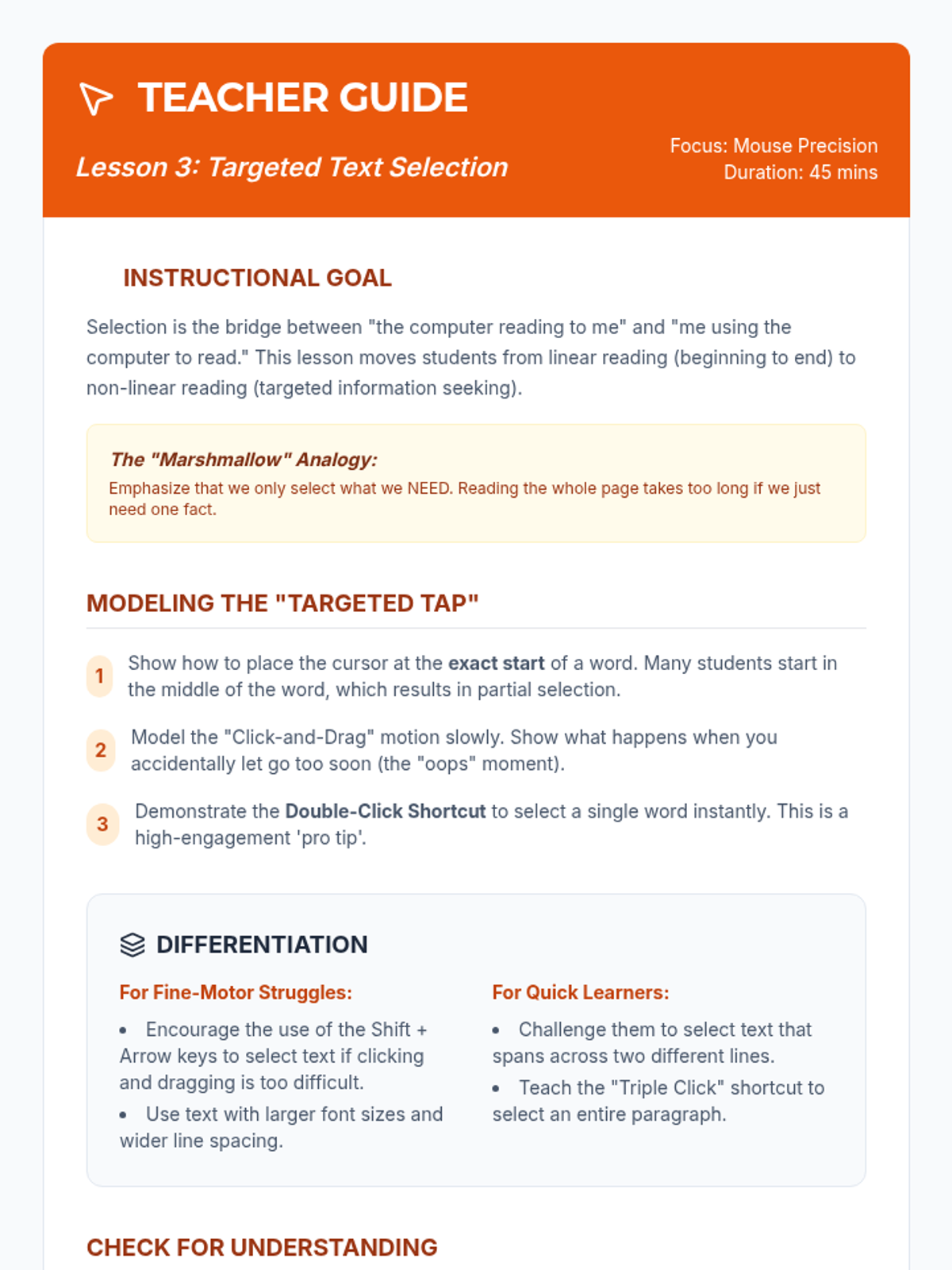A comprehensive sequence for 4th-grade students to master the technical controls of text-to-speech (TTS) assistive technology. Students progress from basic activation to independent navigation and selection, building technical fluency for accessible reading.