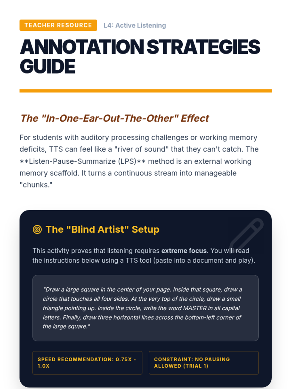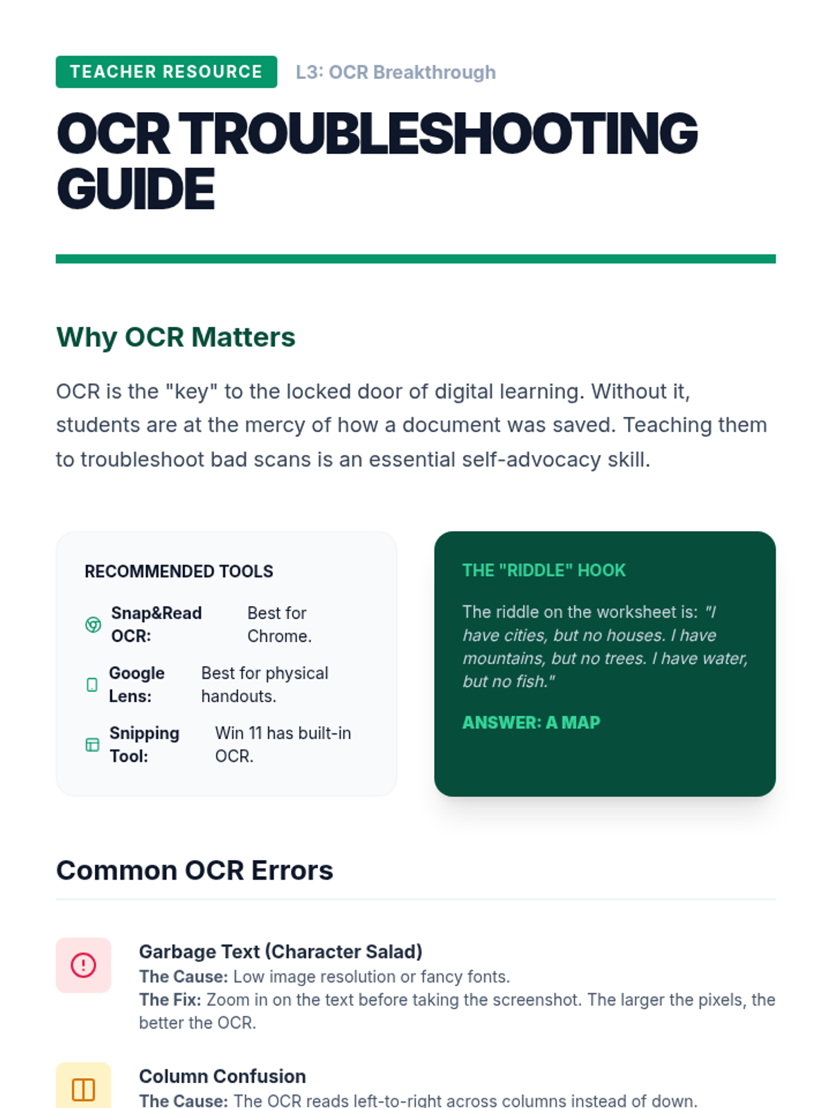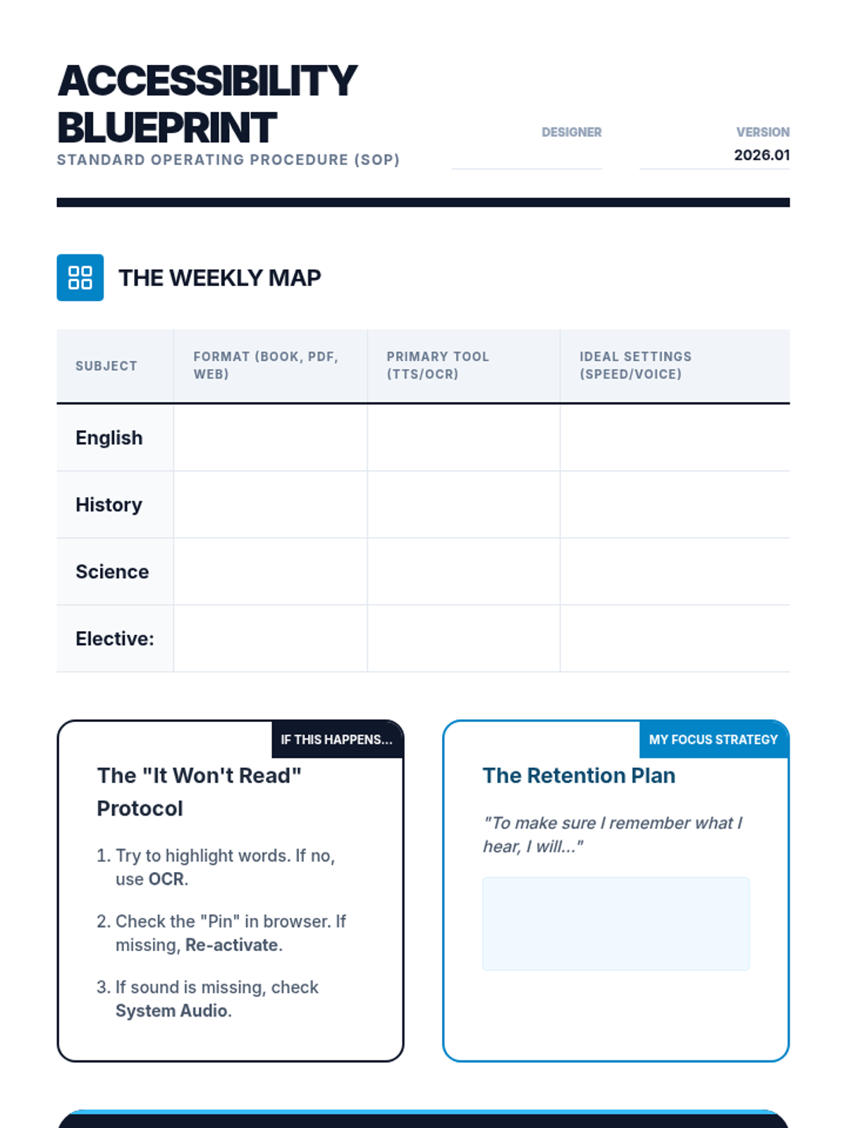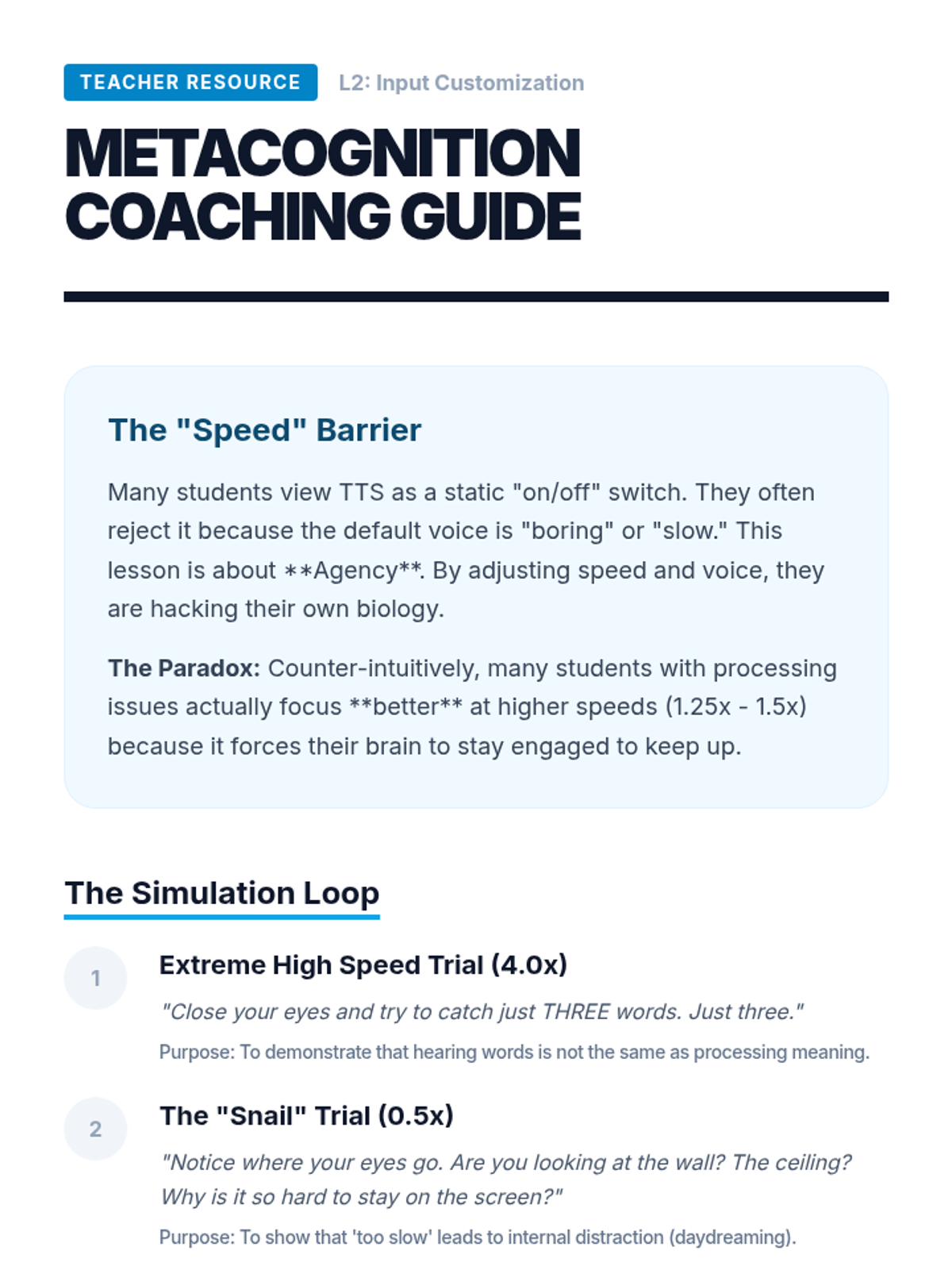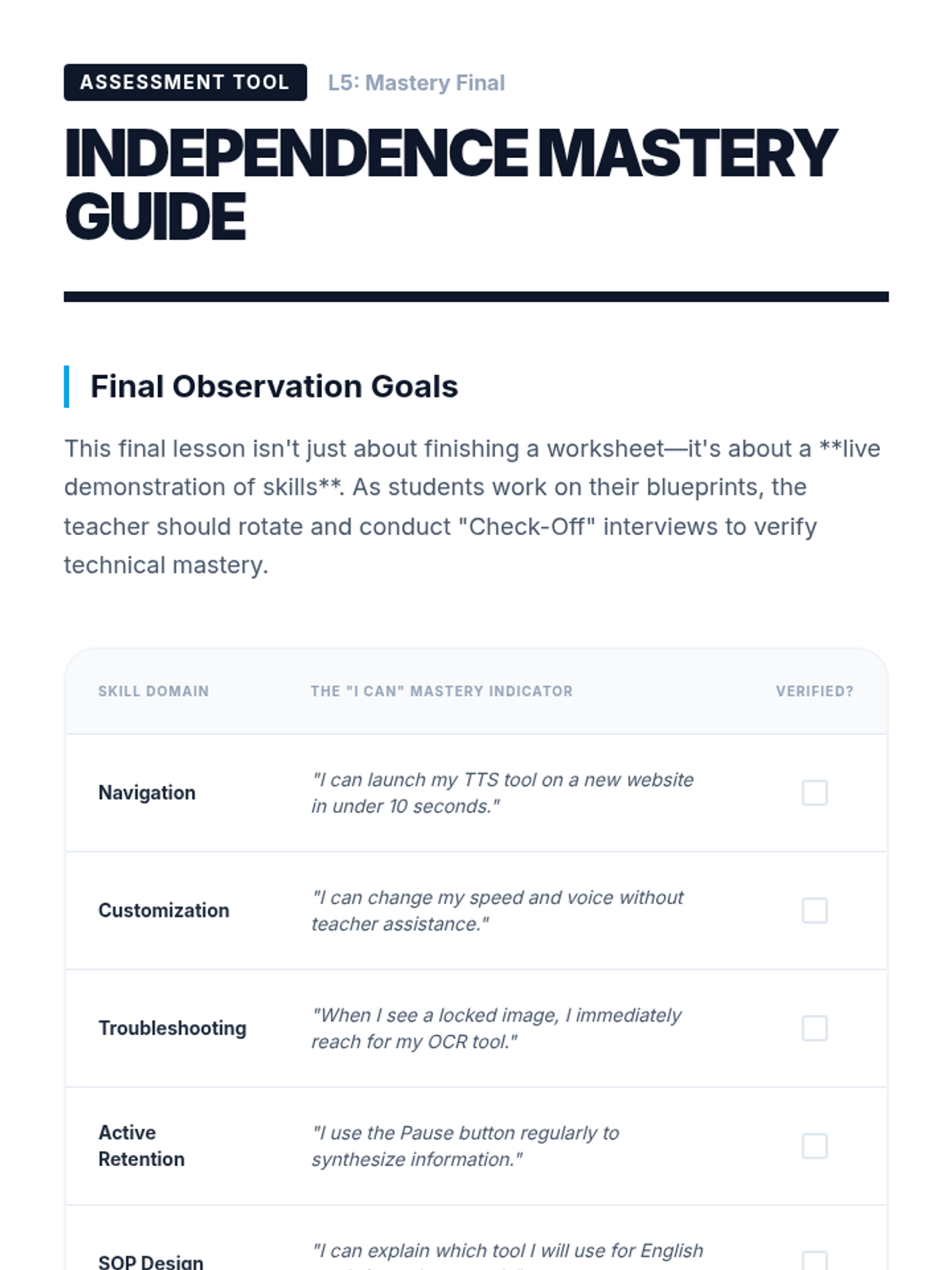 A technical workshop series designed to transition 10th-grade students from passive assistance to active mastery of Text-to-Speech technologies and OCR tools for academic independence.