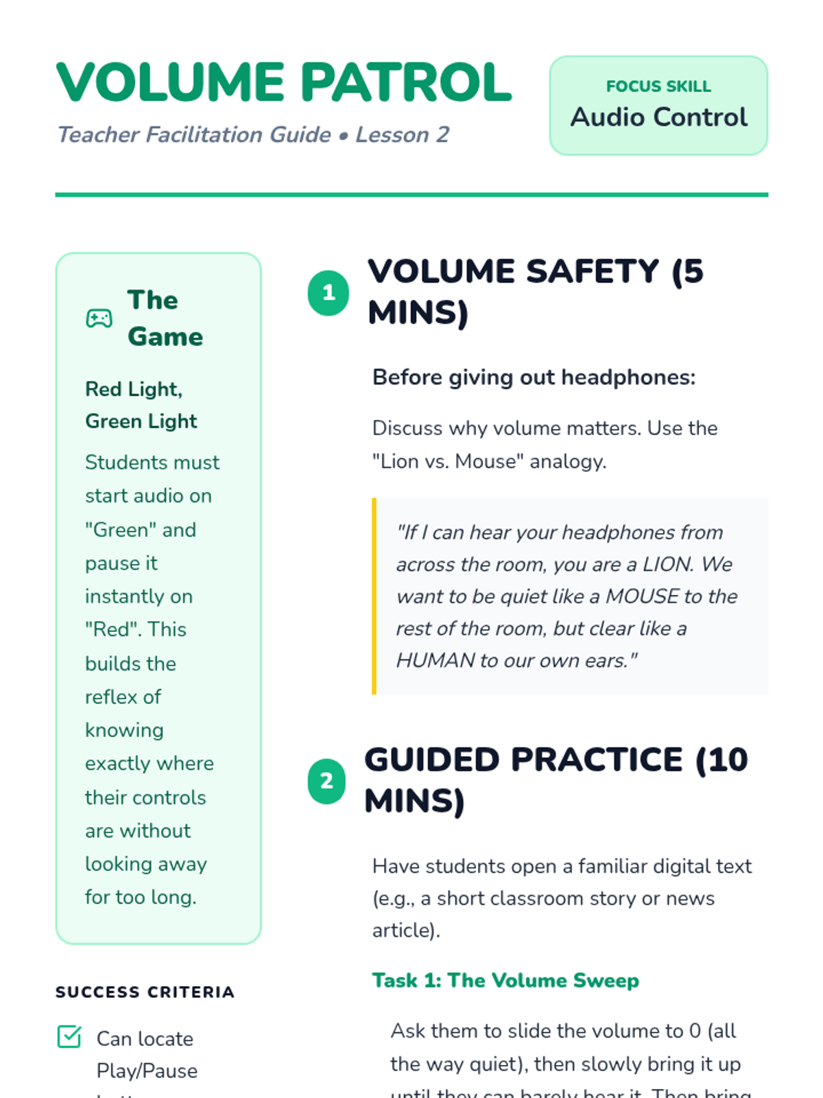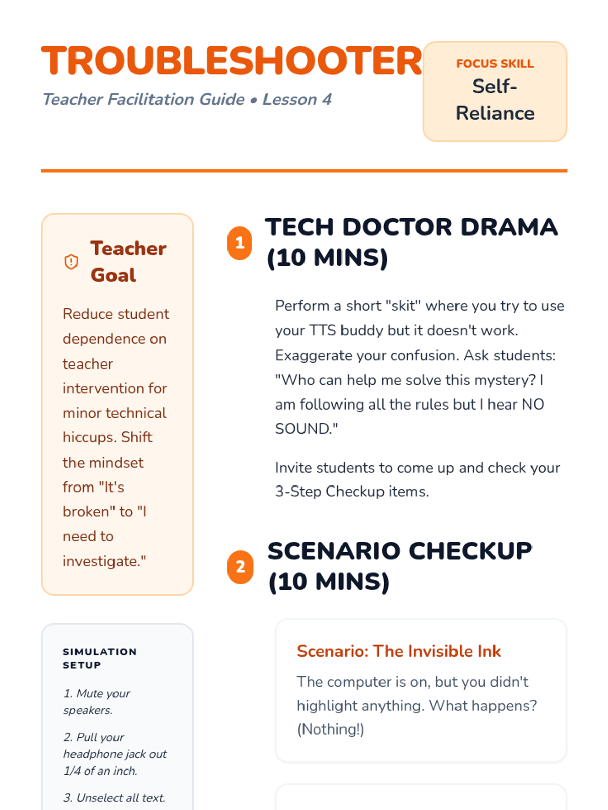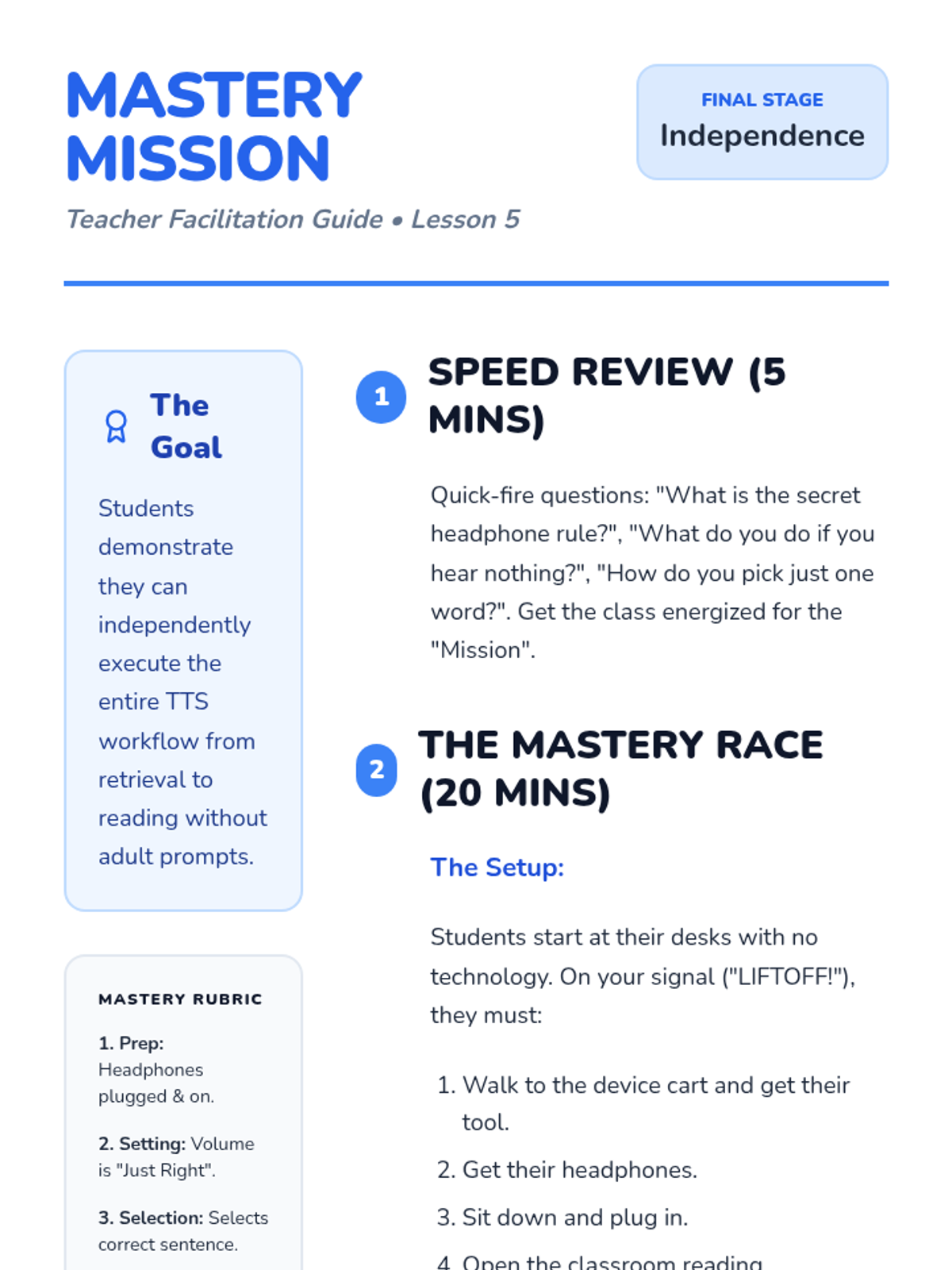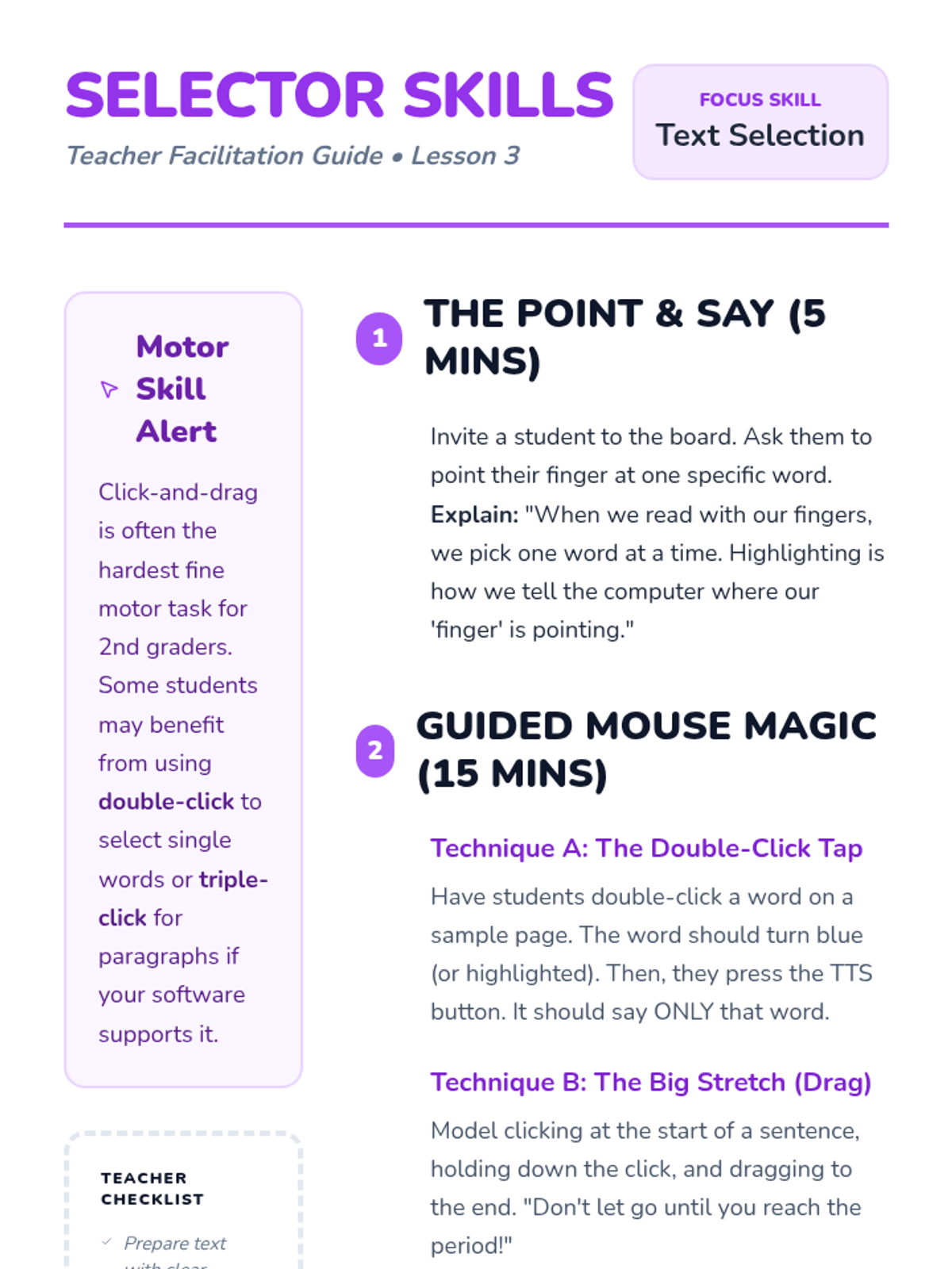 A sequence designed for 2nd grade students to master the use of text-to-speech (TTS) technology. Students move from basic identification of tools to independent navigation and troubleshooting, viewing TTS as a helpful 'reading buddy'.