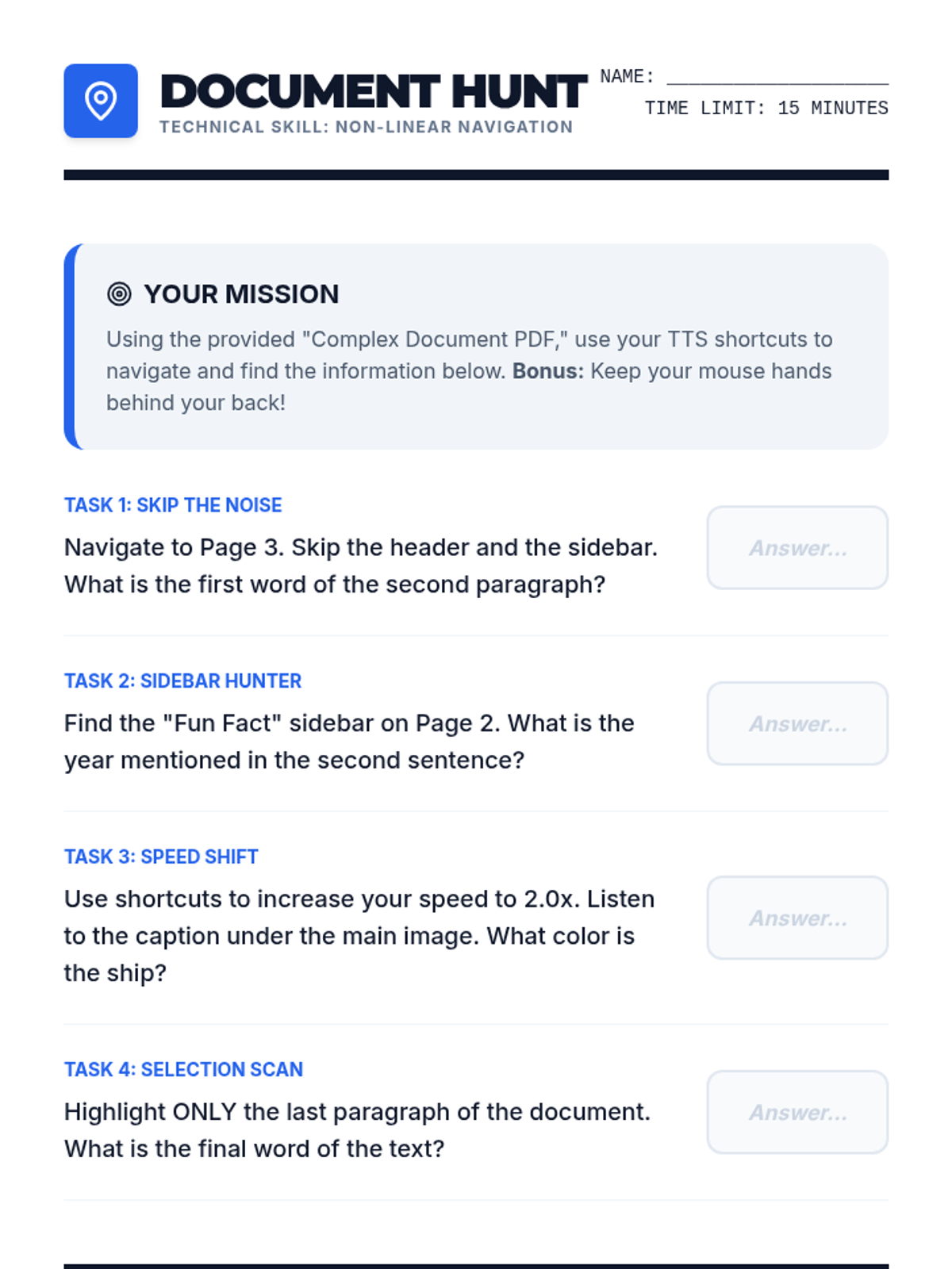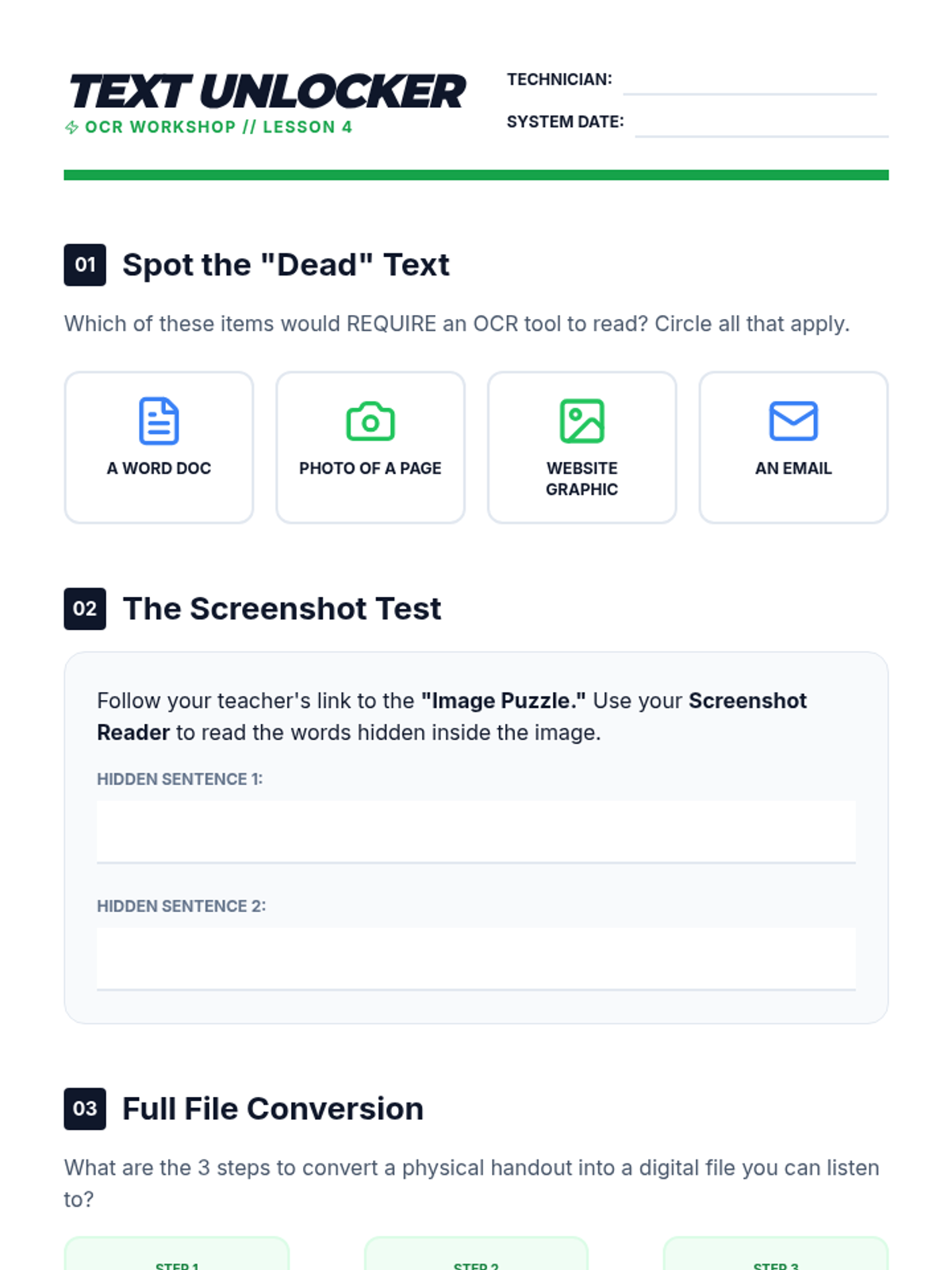A technical mastery sequence for 8th-grade students to become expert users of Text-to-Speech (TTS) technology. Students progress from basic interface navigation to advanced auditory customization, complex document handling, OCR conversion, and independent troubleshooting.